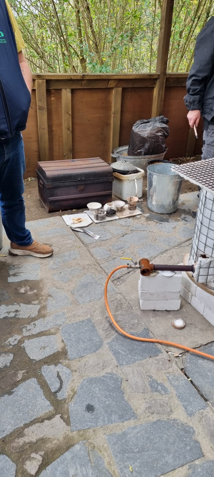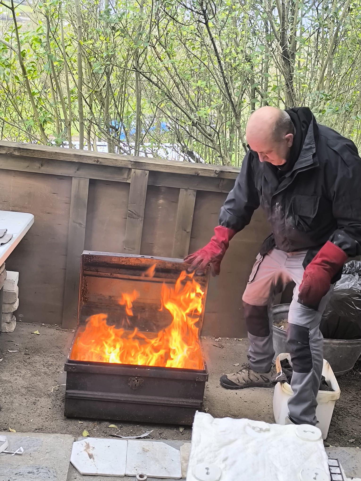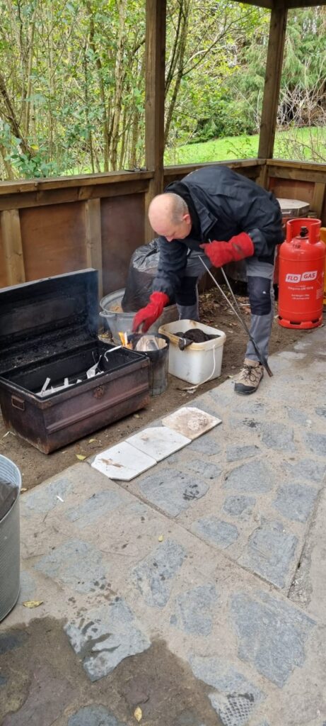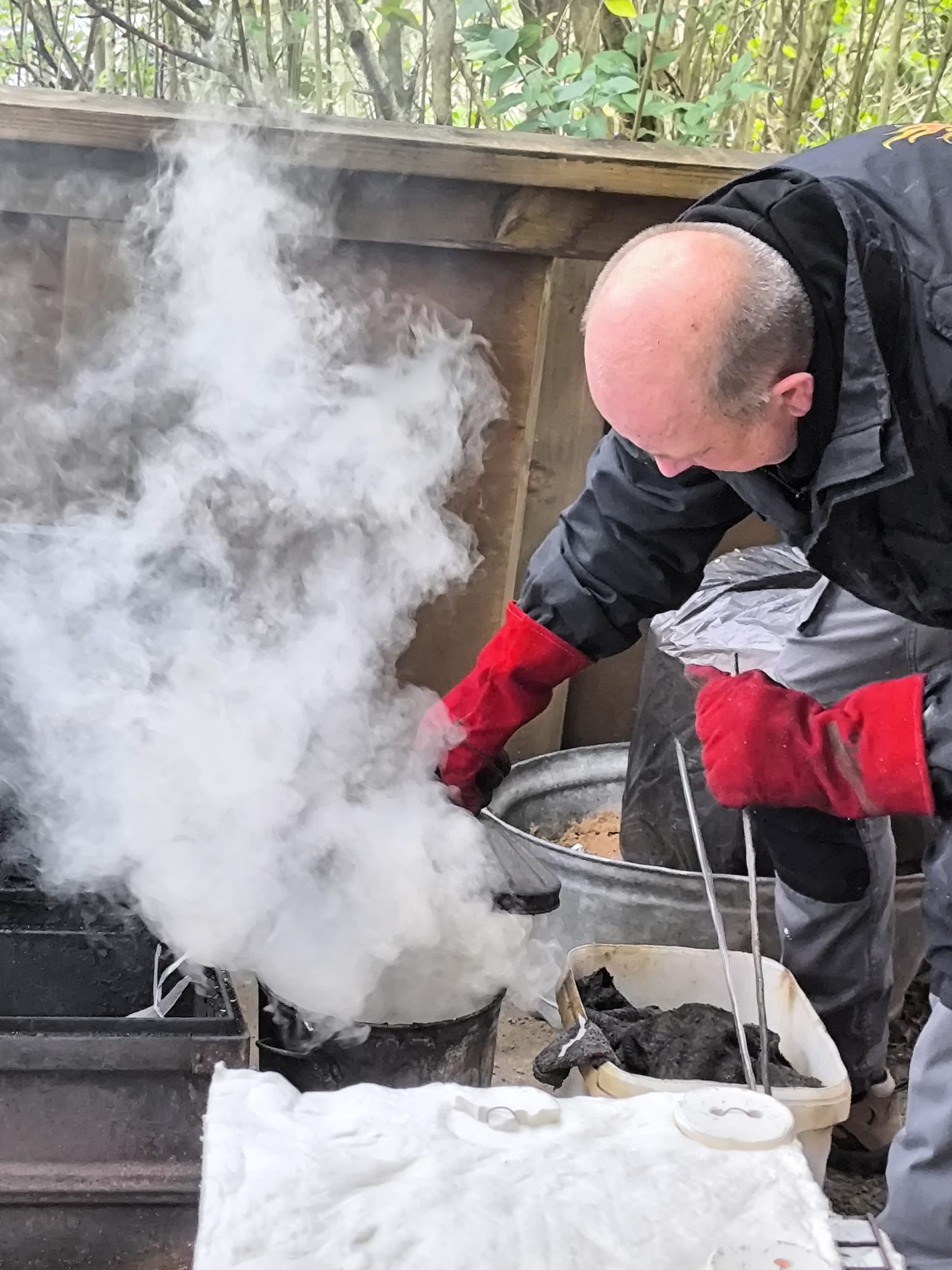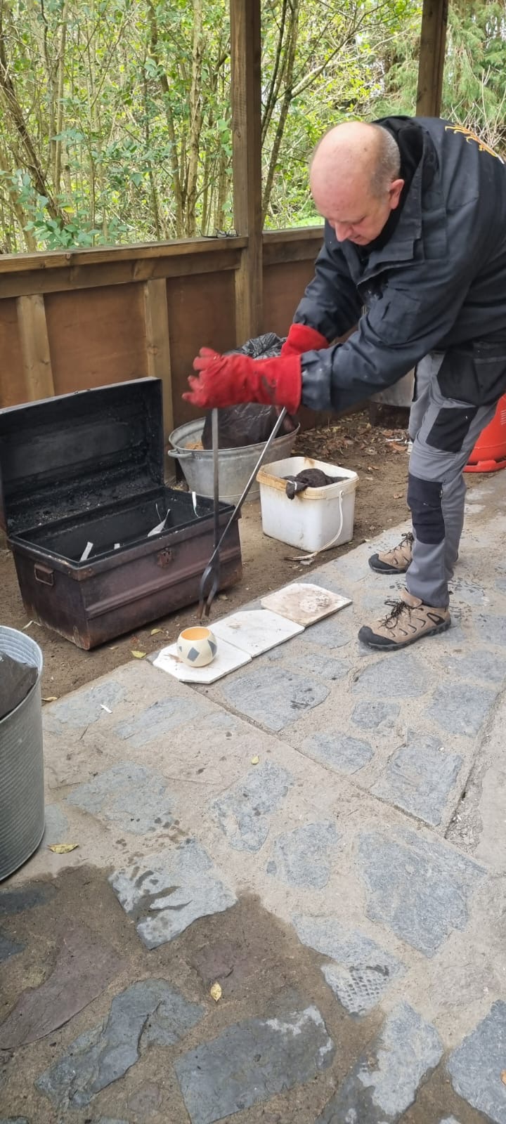 Then came the highlight: the firing itself. Watching the kiln heat the glazed pots to glowing red before they were lifted out with tongs was mesmerising! In Raku, the pieces are quickly transferred to containers filled with combustible material — sawdust, paper, or similar — which ignite on contact.