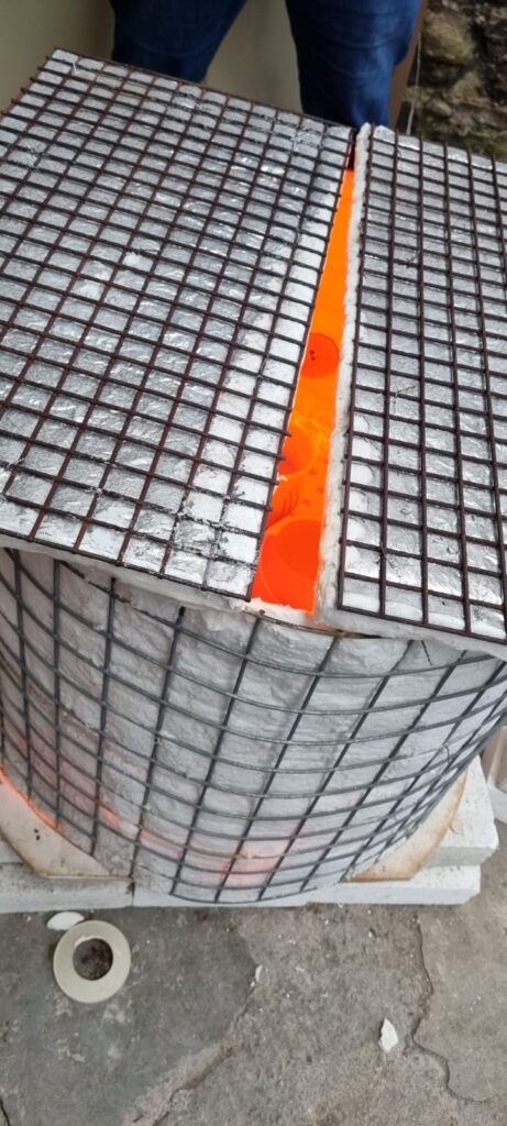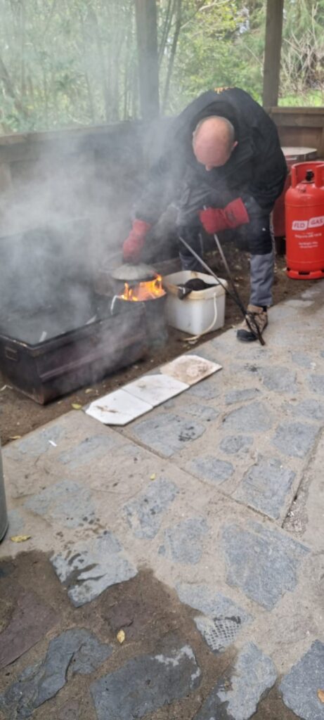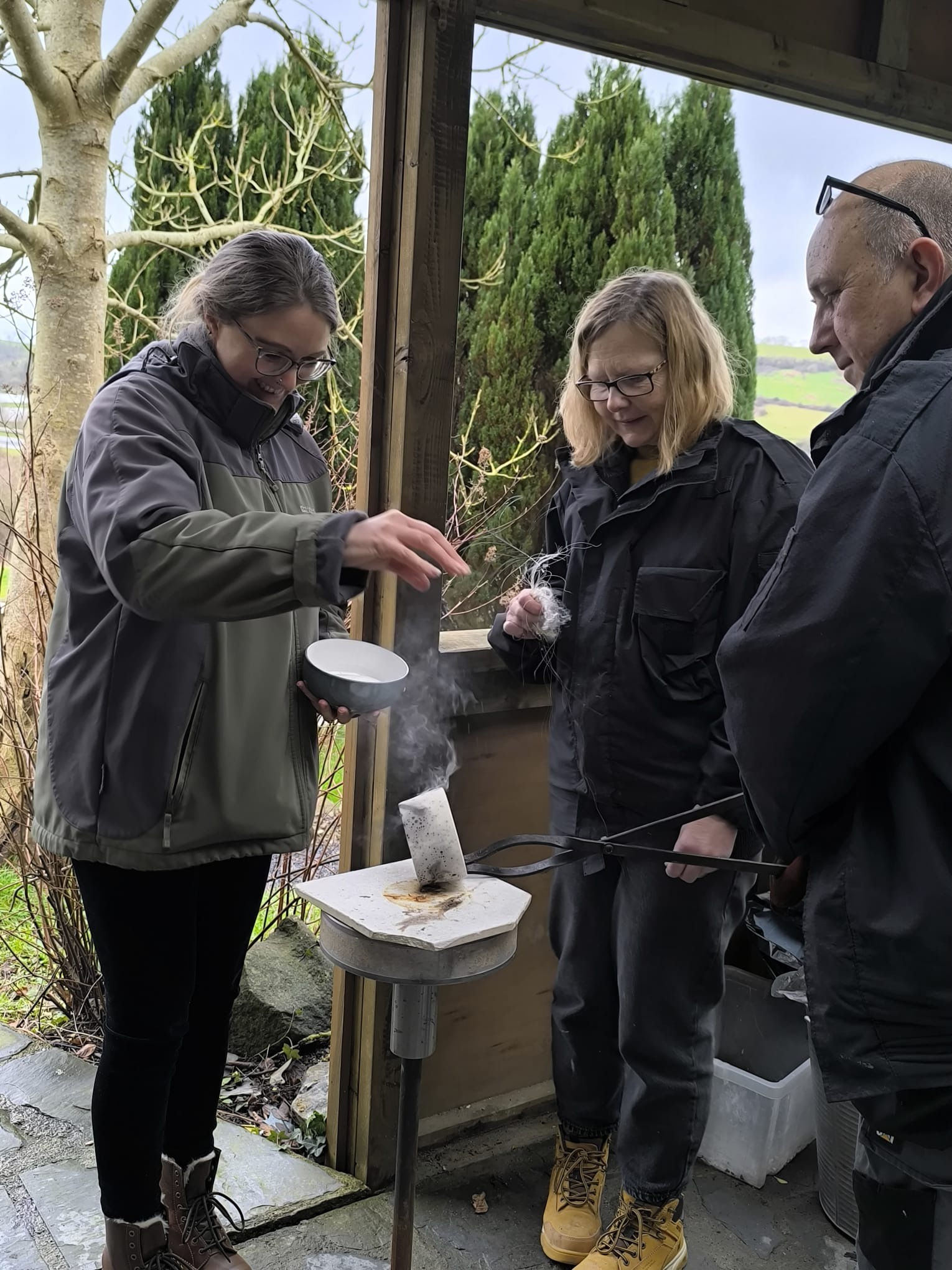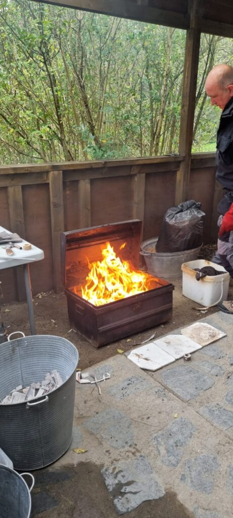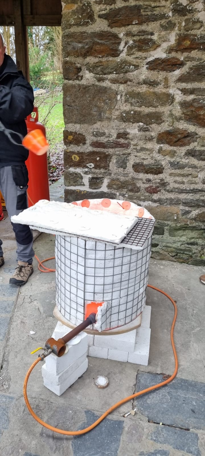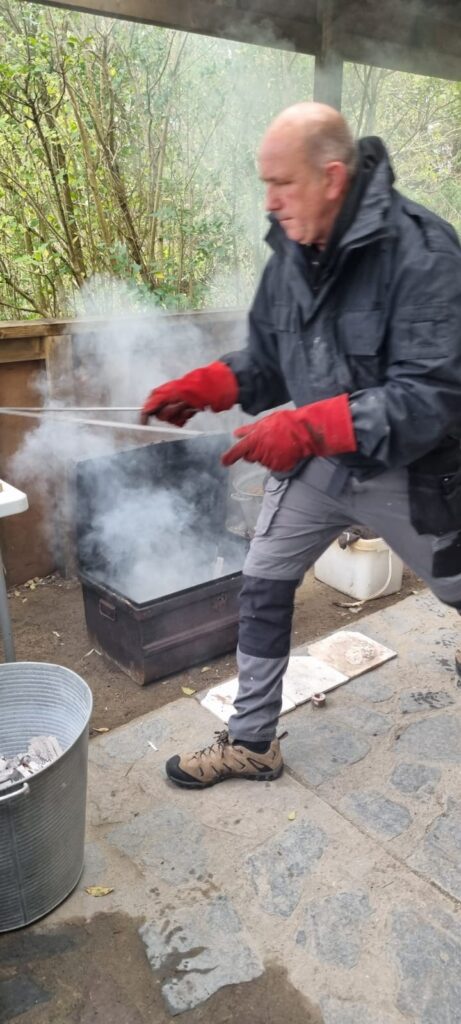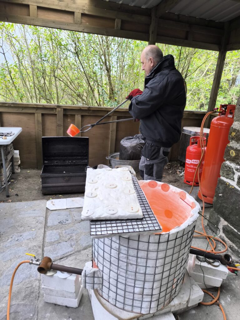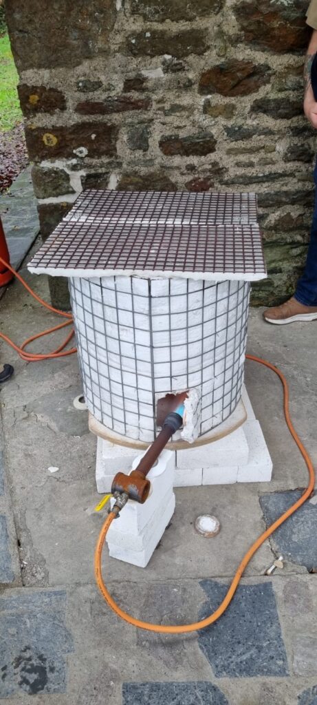 Then came the highlight: the firing itself. Watching the kiln heat the glazed pots to glowing red before they were lifted out with tongs was mesmerising! In Raku, the pieces are quickly transferred to containers filled with combustible material — sawdust, paper, or similar — which ignite on contact.
