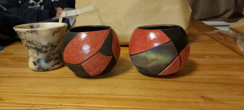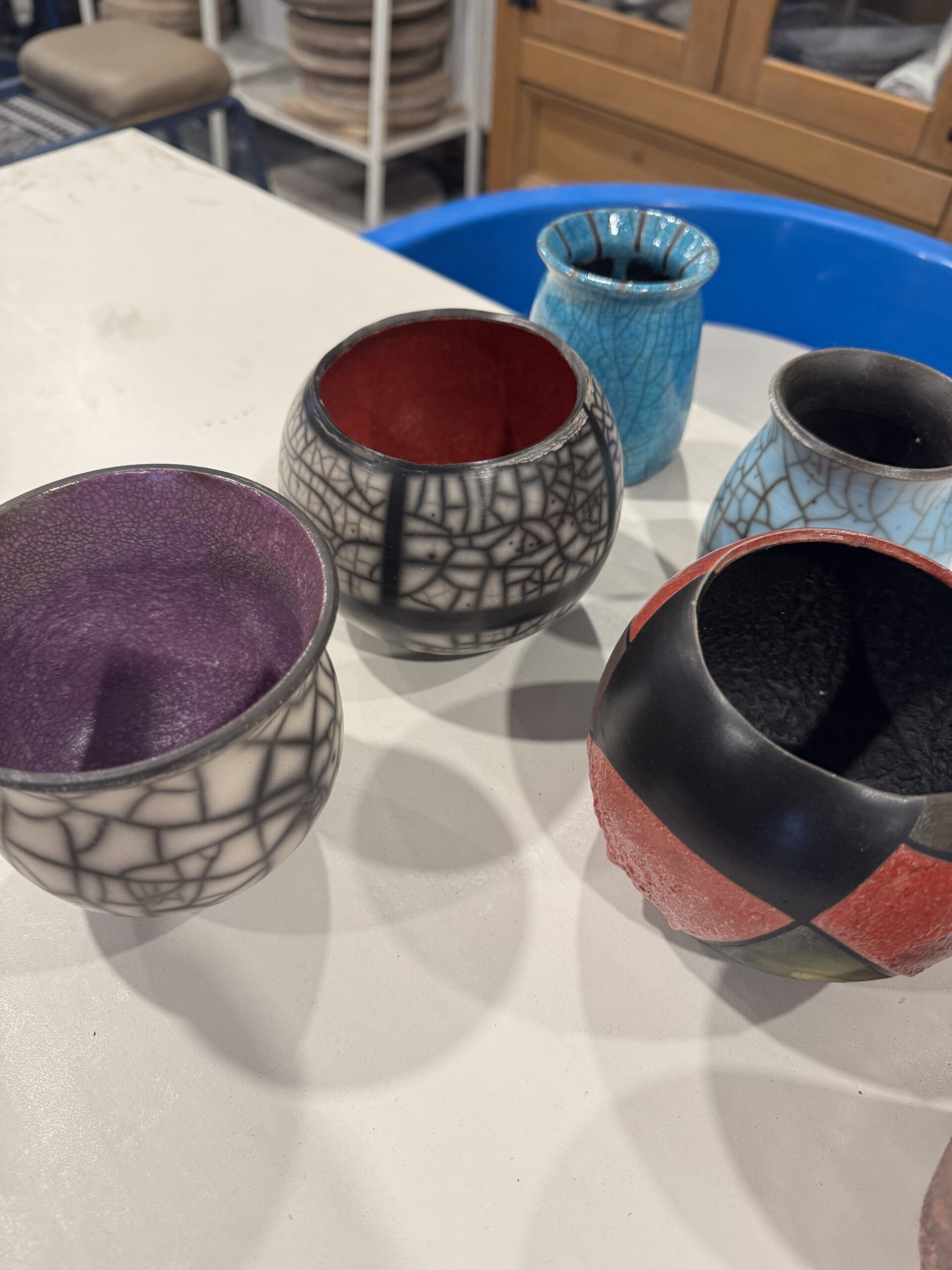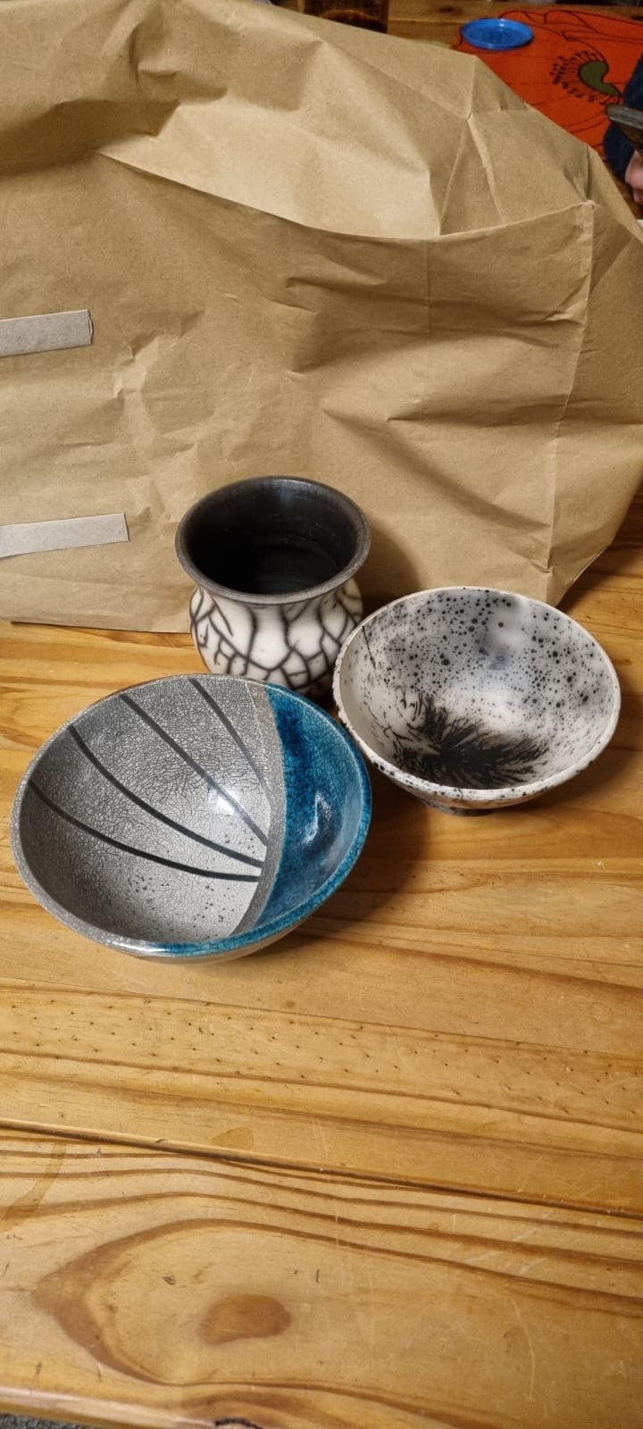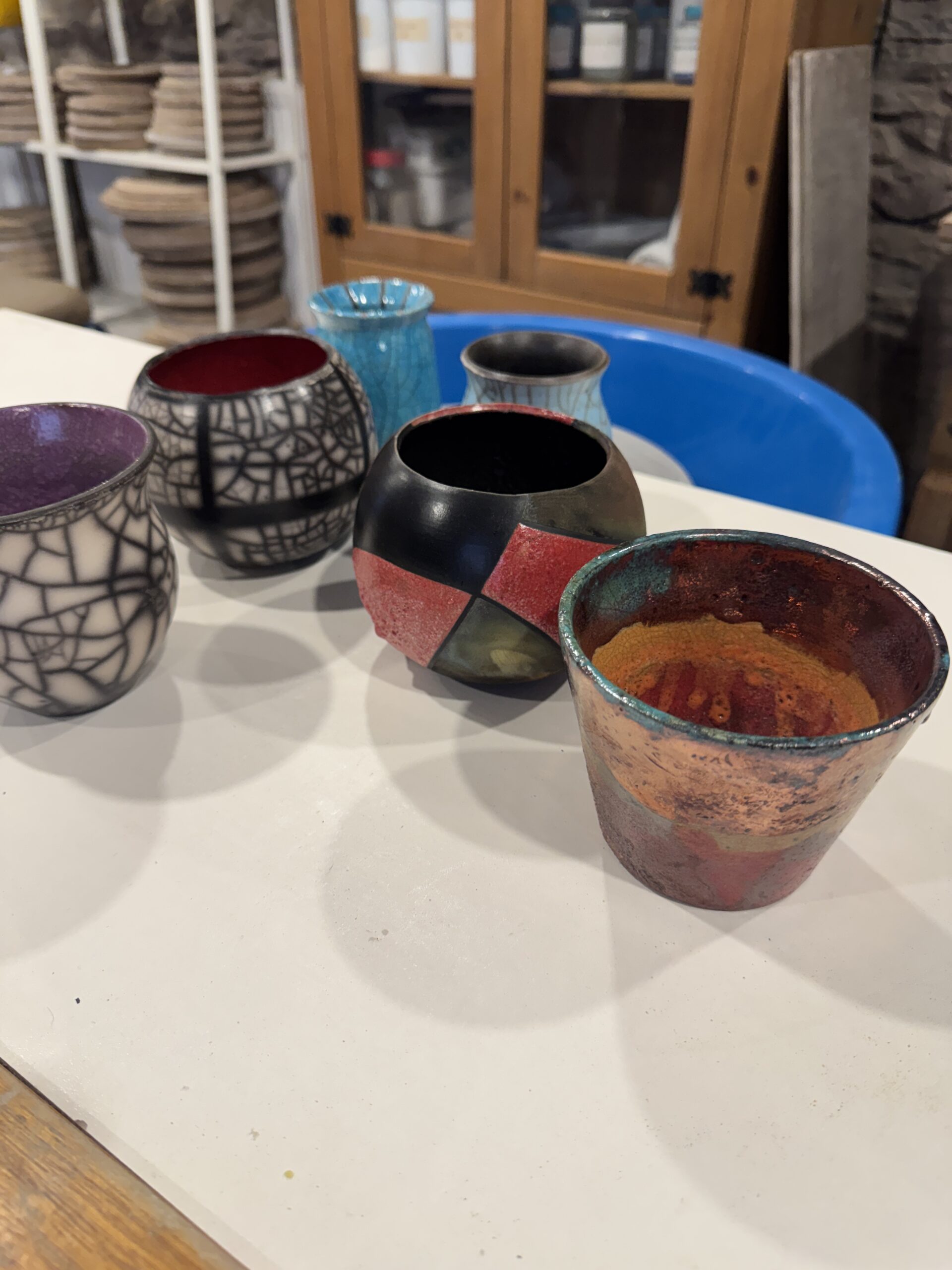 One of the joys of Raku is that no two pieces turn out the same. When our pots were cleaned and revealed, it was amazing to see the variations: colours we hadn’t expected, patterns we hadn’t planned, and surfaces shaped by fire and chance. That unpredictability is part of the magic — the process embraces a little chaos, and the results feel personal and one-of-a-kind.