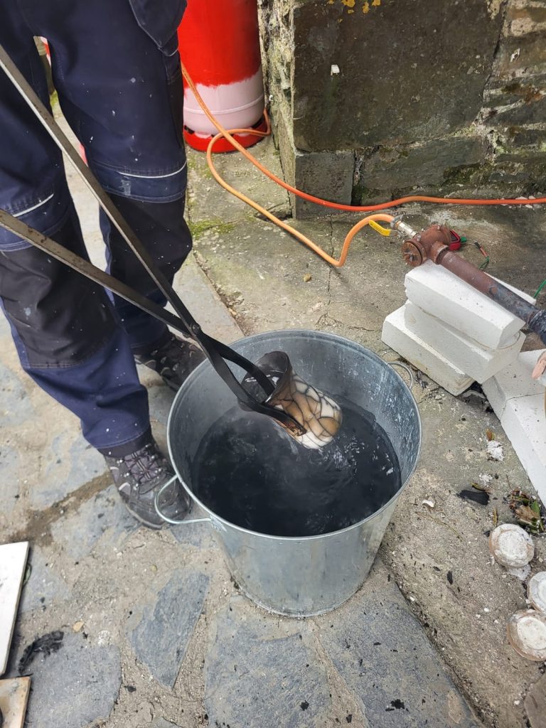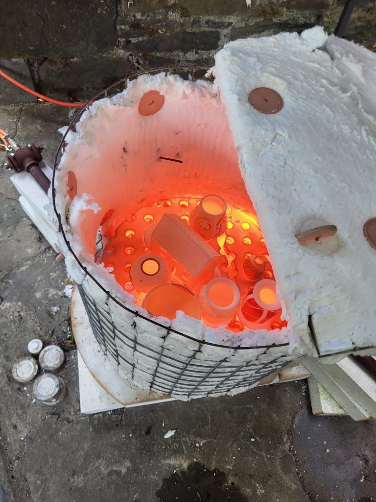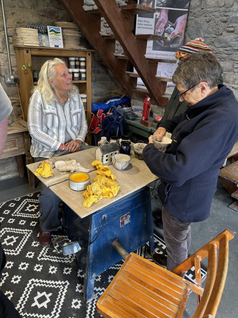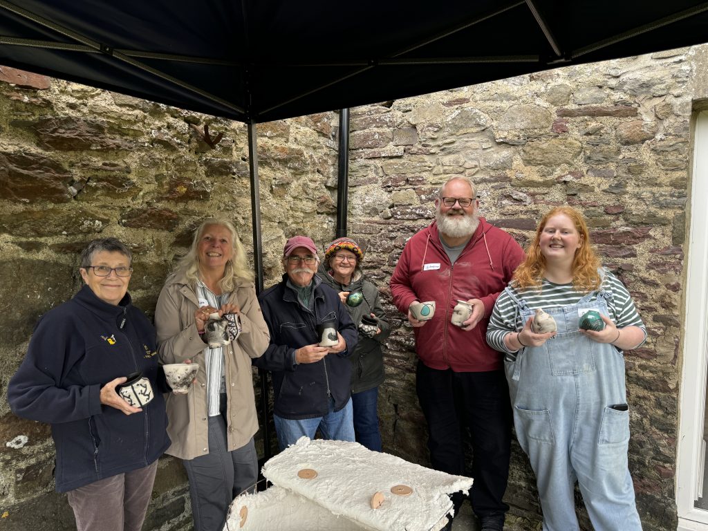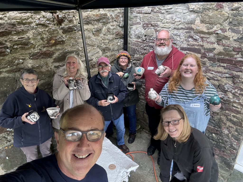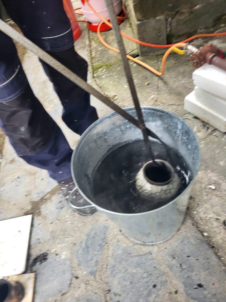 We woke up to a mist covering the valley, a good sign that they weather should be just right for an outdoor Raku firing session with a new group of students. With everyone arriving on time and a quick cuppa, we started off with the usual safety briefing and history of Raku talk. Adrian spoke about the different types of Raku decorating we do and the difference between slower firing of general ceramics pots and the faster Raku firing. We then bought out lots of examples of Raku pots and creations and explained how we achieved the effect on each one. There were lots of questions as usual with the students getting their heads around areas which have no glaze turning black from the smoke and the glaze popping off when doing the naked Raku technique.