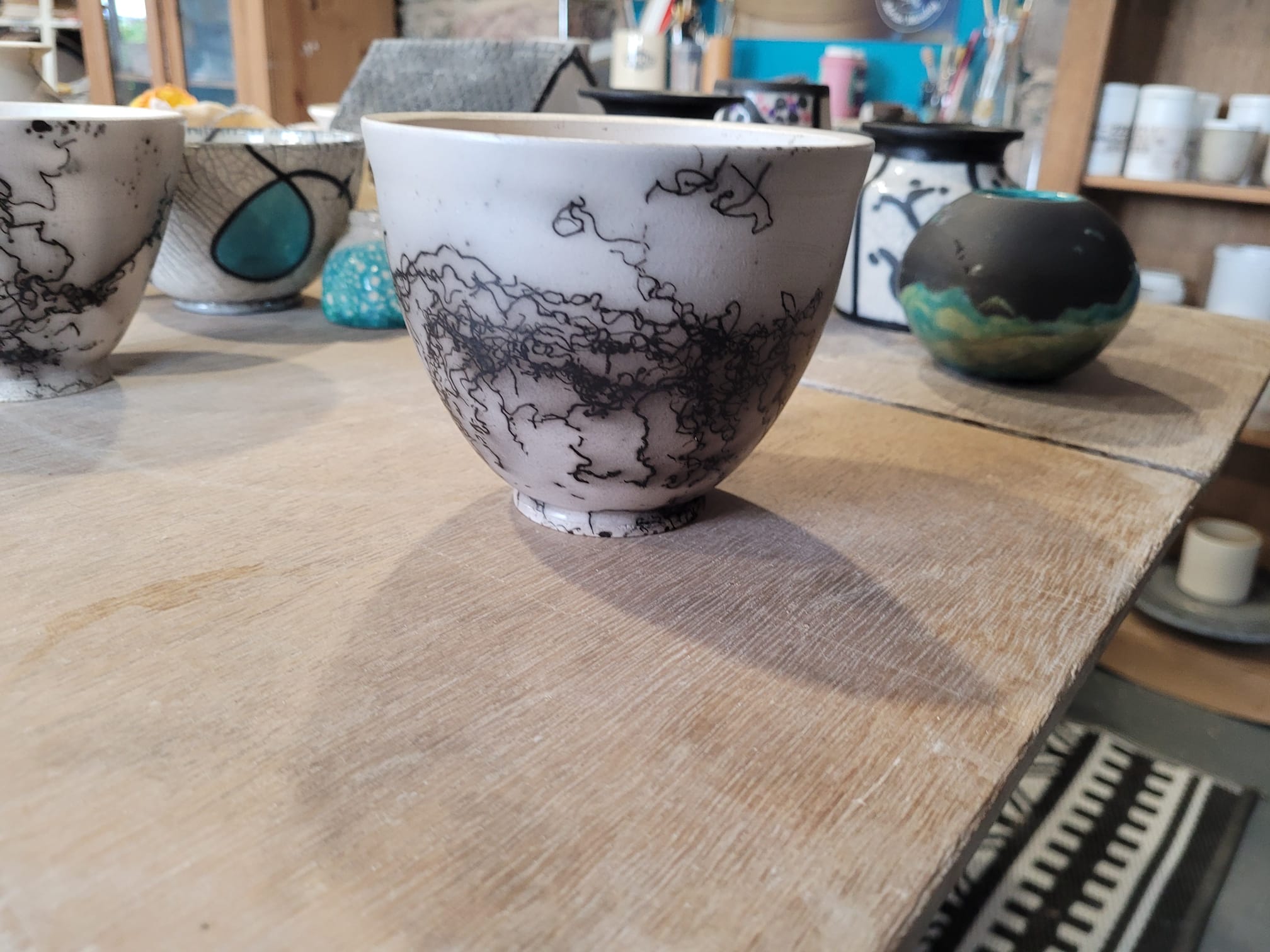 The students had up to lunchtime to decorate and glaze the pots they had chosen. We do tell out students to bring all weather clothing as Raku firing is done outside, and guess what they weather started to turn after lunch and clouded over with a chill in the air. Luckily, we were firing the kiln up to 1040c, so we all huddled around the kiln and kept nice a warm. We managed to get three firings in of about 45min each, first a glaze one, then horsehair / feather and lastly a naked raku. The students were all taught how to clean up their pots and those needing sealing and polishing, how to do that. The day ended with a group photo of our 6 new RakuManiacs showing off their fabulous creations.