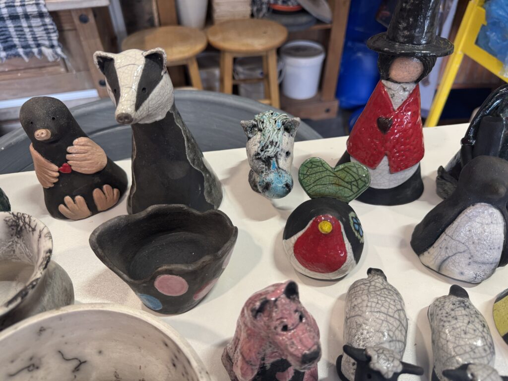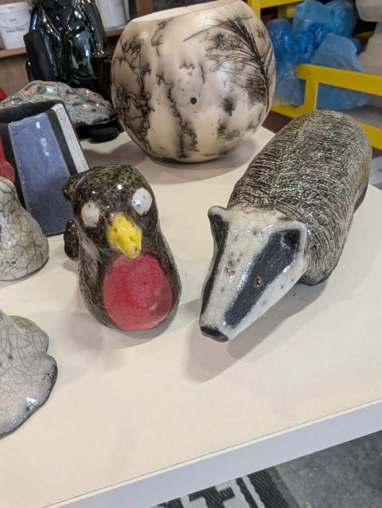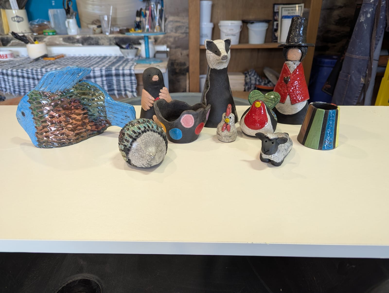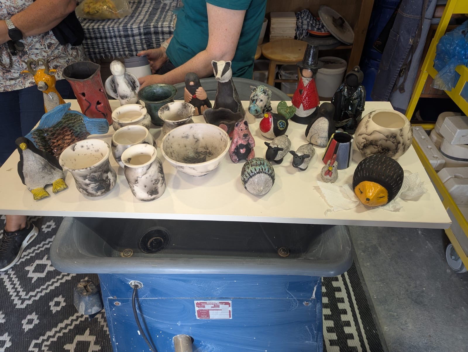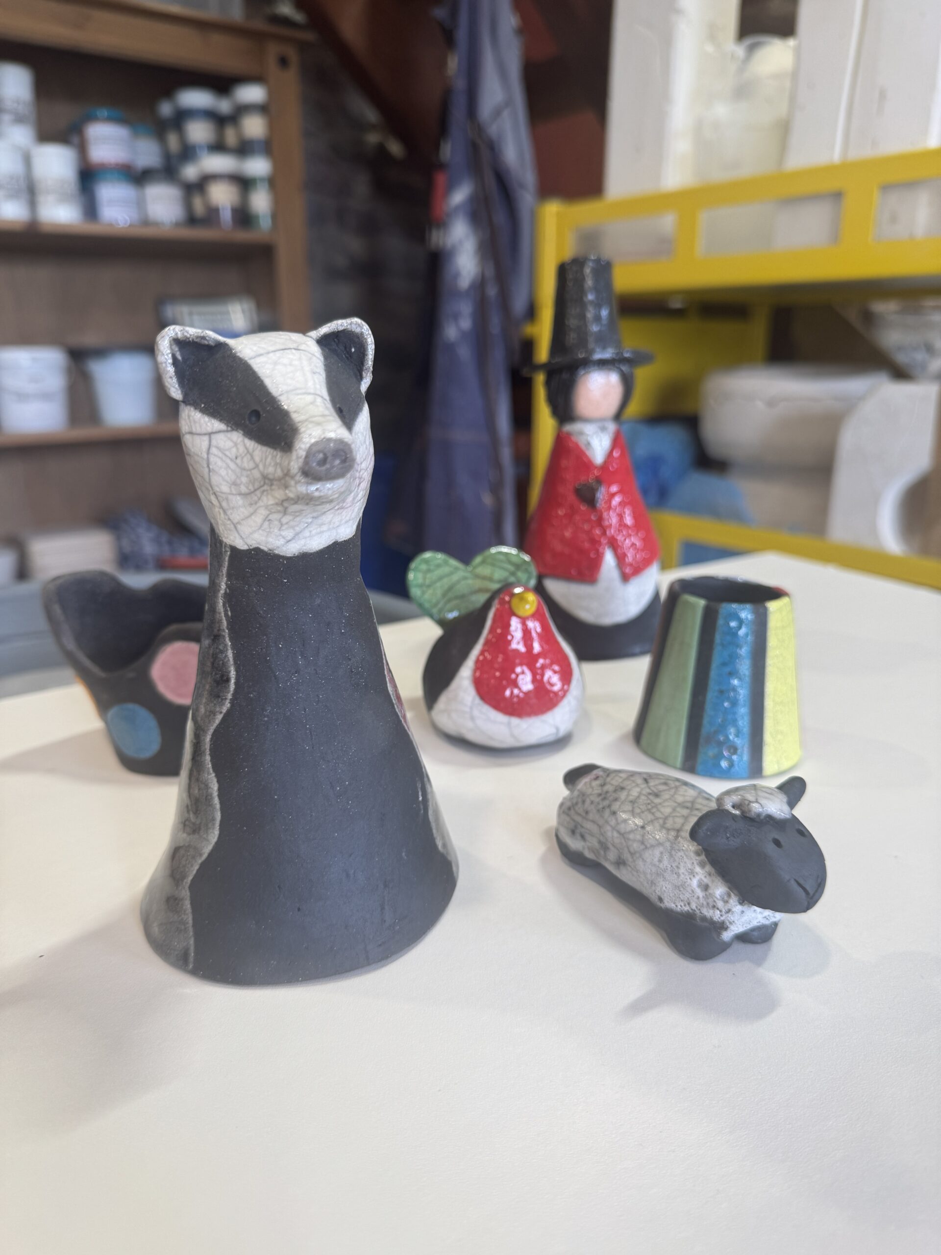 One of our favourite classes is when Jane brings some of her pottery students for a hybrid version of our taster experience. This session is different in that the students get one pot from us but bring along their own creations they have been making in their pottery class.  As there would be quite a few things to fire, we started a little earlier with our customary cuppa and housekeeping / safety talk. All the students besides Debroah had been before so we decided they did not need the talk about Raku, its history and how it came to the UK. Everyone got stuck into glazing and decorating their creations – all fabulous hand-built items. Today was definitely animal day as we had horses, sheep, owl, badger, hares, mole, fish, chicken and hedgehogs.  In addition to this, Welsh ladies, Welsh miners, little ghosts and an angel.