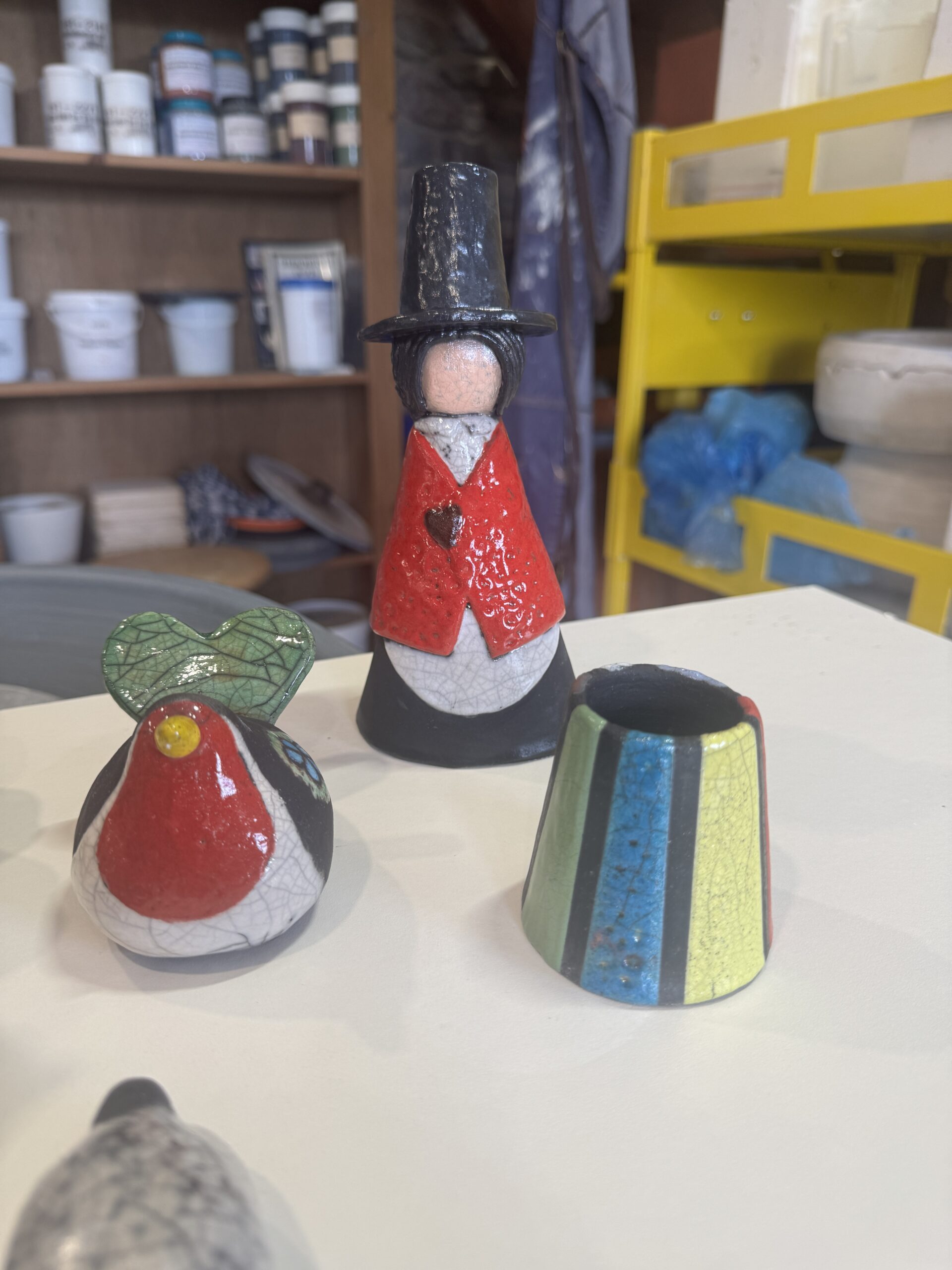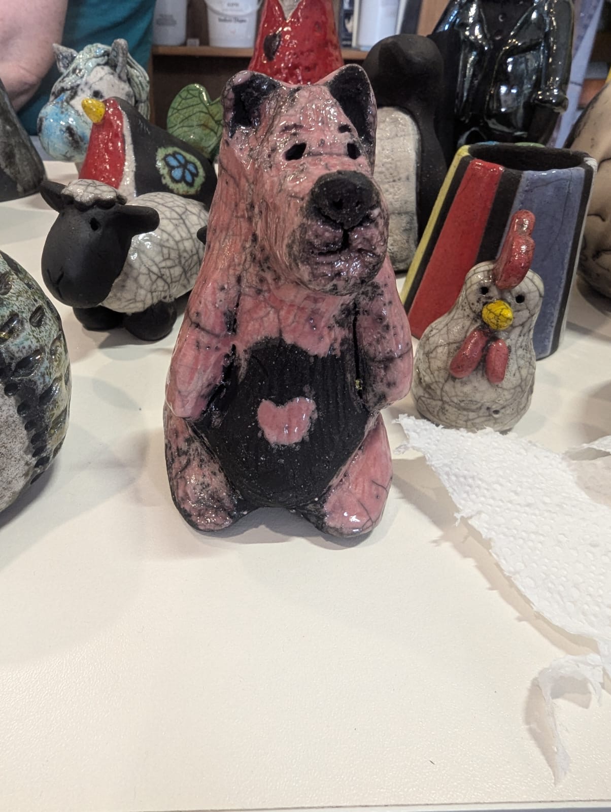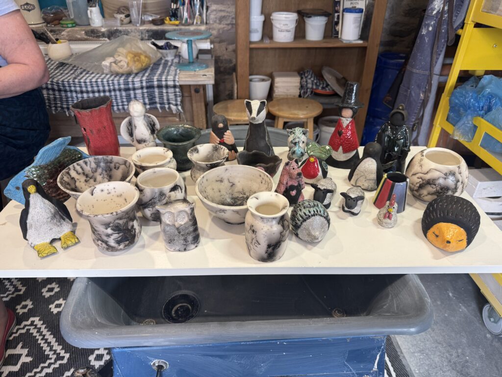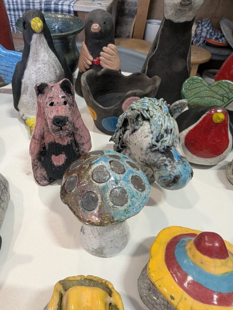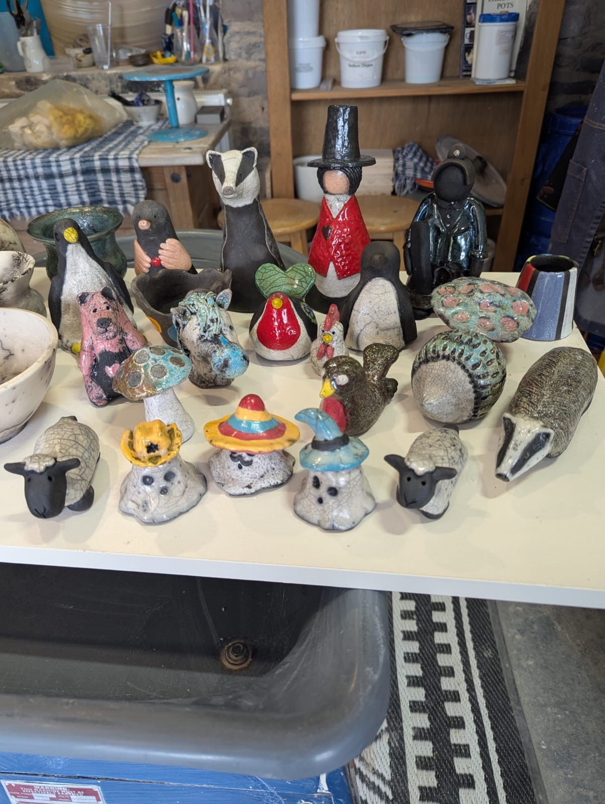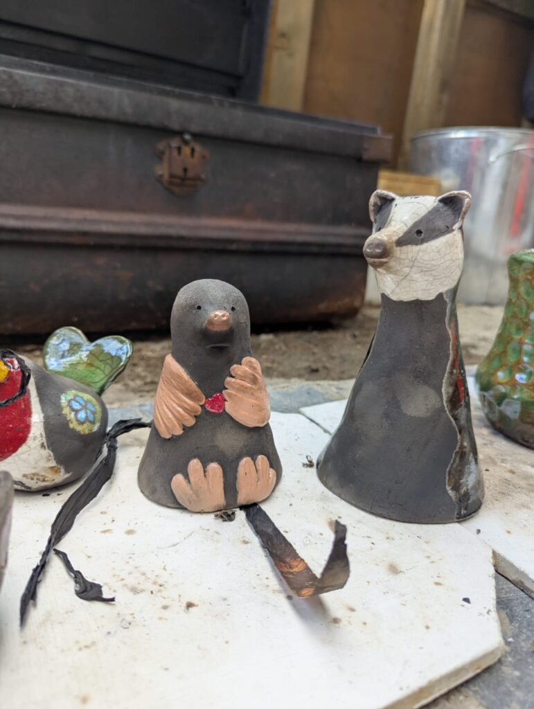 One of our favourite classes is when Jane brings some of her pottery students for a hybrid version of our taster experience. This session is different in that the students get one pot from us but bring along their own creations they have been making in their pottery class.  As there would be quite a few things to fire, we started a little earlier with our customary cuppa and housekeeping / safety talk. All the students besides Debroah had been before so we decided they did not need the talk about Raku, its history and how it came to the UK. Everyone got stuck into glazing and decorating their creations – all fabulous hand-built items. Today was definitely animal day as we had horses, sheep, owl, badger, hares, mole, fish, chicken and hedgehogs.  In addition to this, Welsh ladies, Welsh miners, little ghosts and an angel.