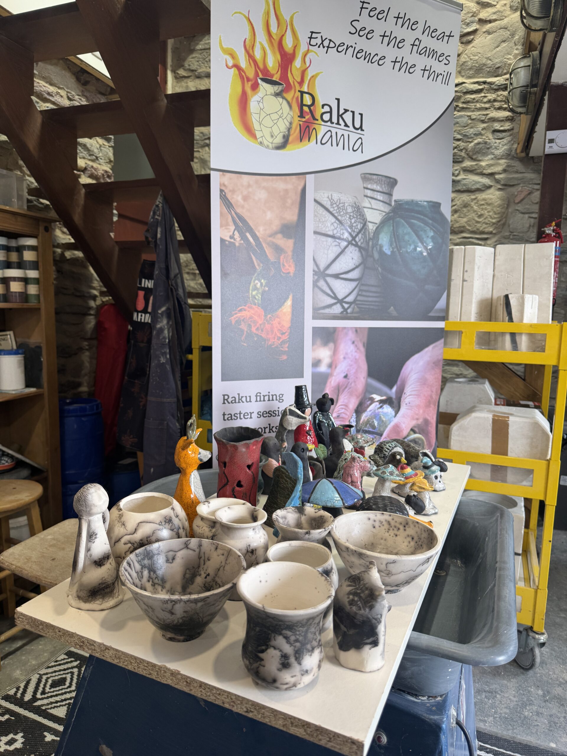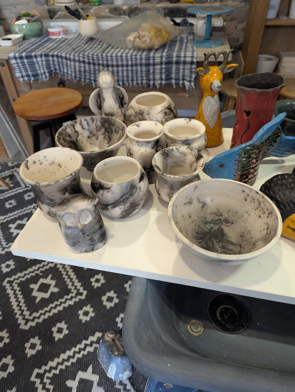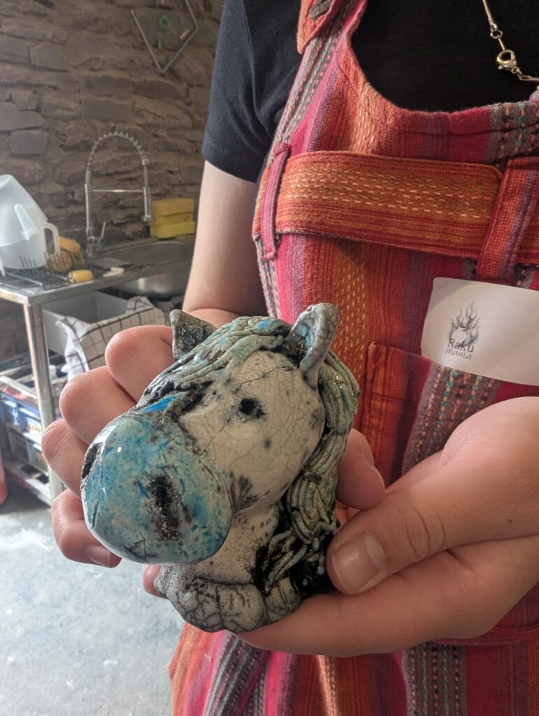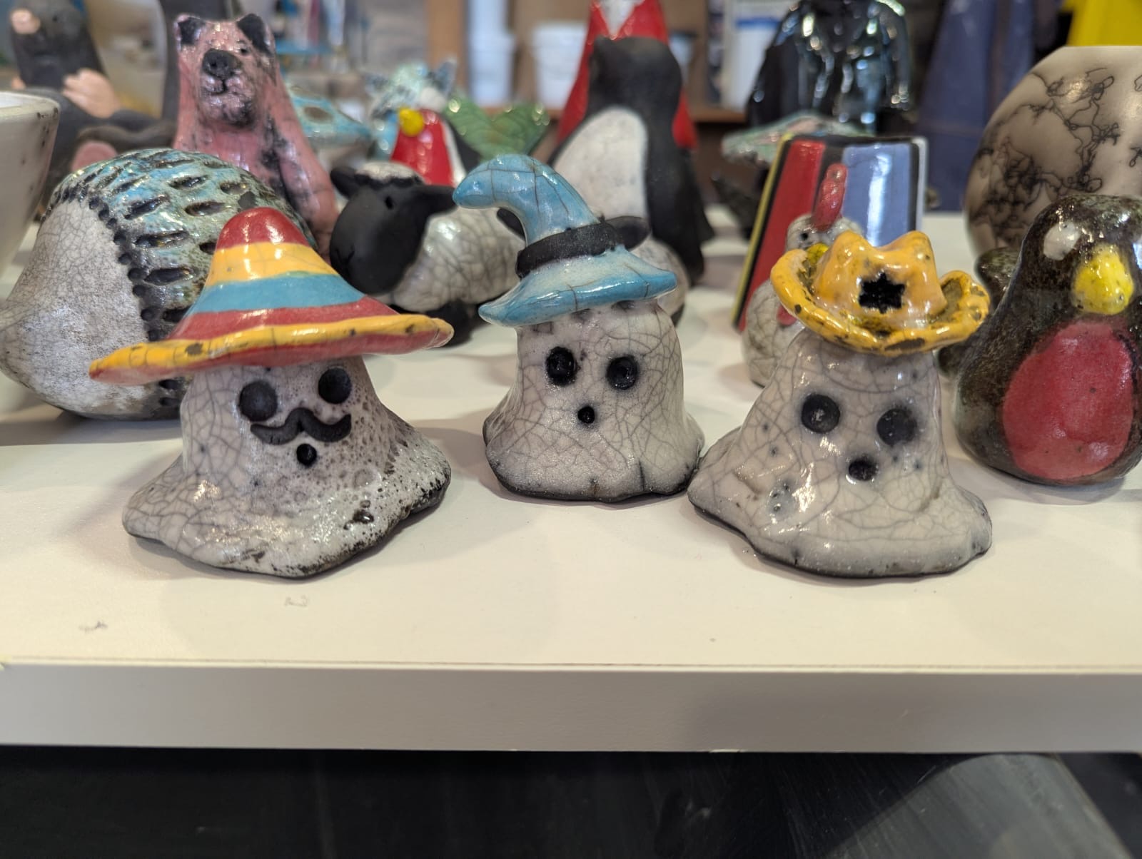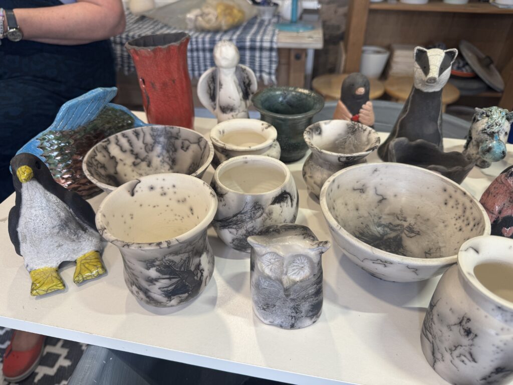 One of our favourite classes is when Jane brings some of her pottery students for a hybrid version of our taster experience. This session is different in that the students get one pot from us but bring along their own creations they have been making in their pottery class.  As there would be quite a few things to fire, we started a little earlier with our customary cuppa and housekeeping / safety talk. All the students besides Debroah had been before so we decided they did not need the talk about Raku, its history and how it came to the UK. Everyone got stuck into glazing and decorating their creations – all fabulous hand-built items. Today was definitely animal day as we had horses, sheep, owl, badger, hares, mole, fish, chicken and hedgehogs.  In addition to this, Welsh ladies, Welsh miners, little ghosts and an angel.
