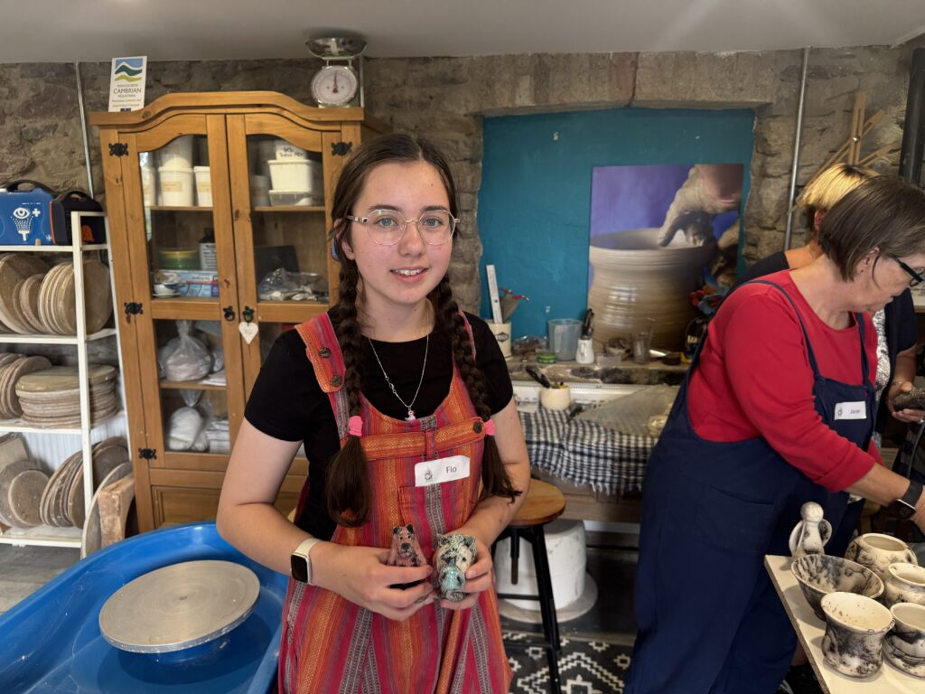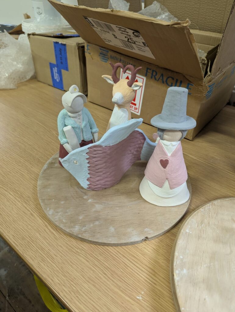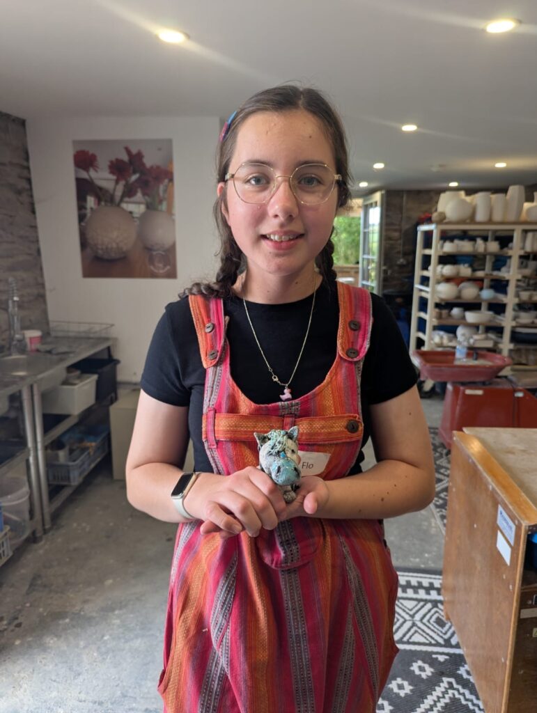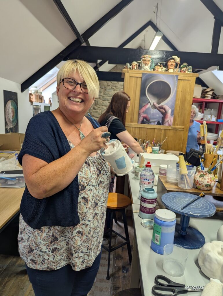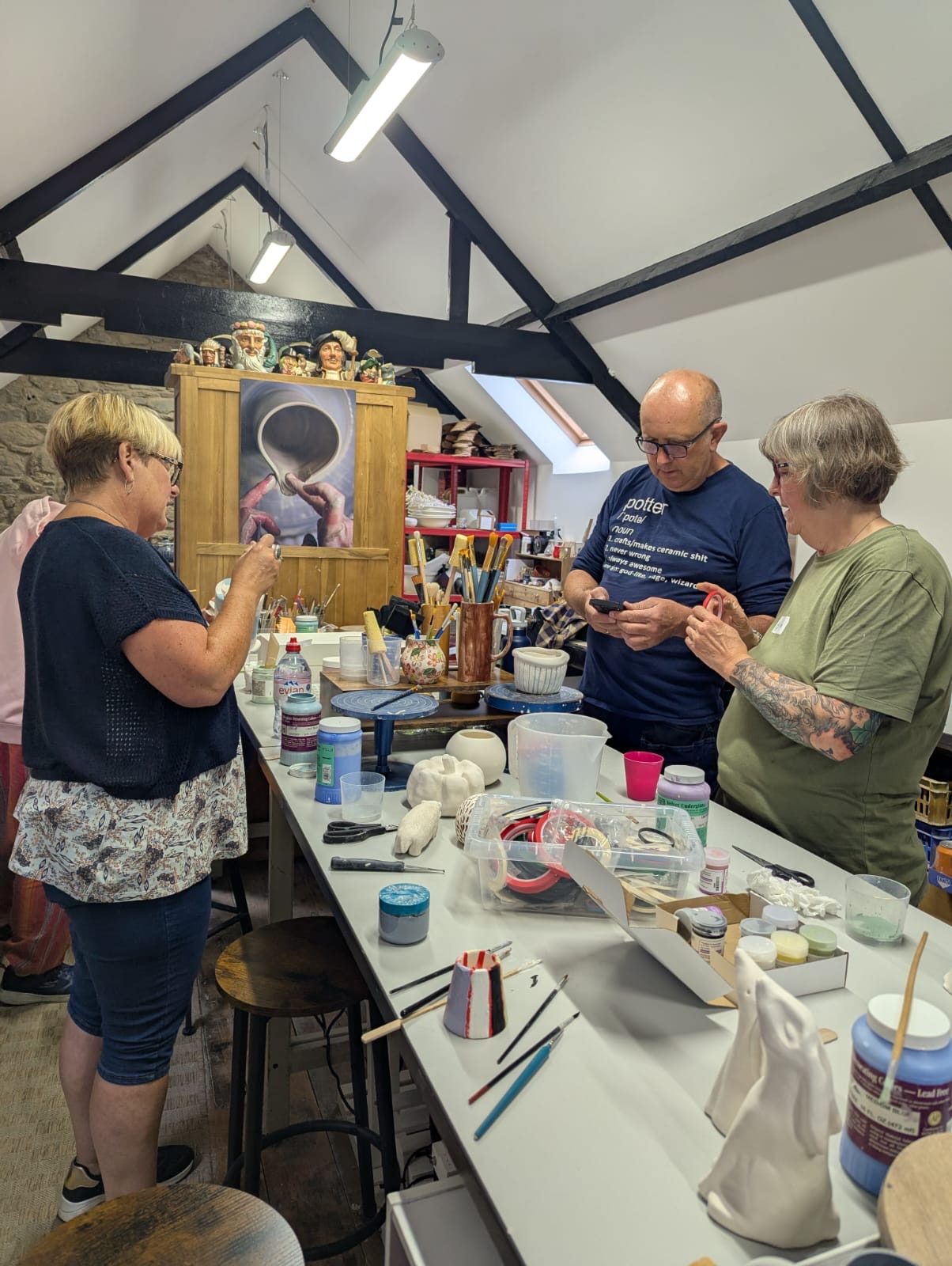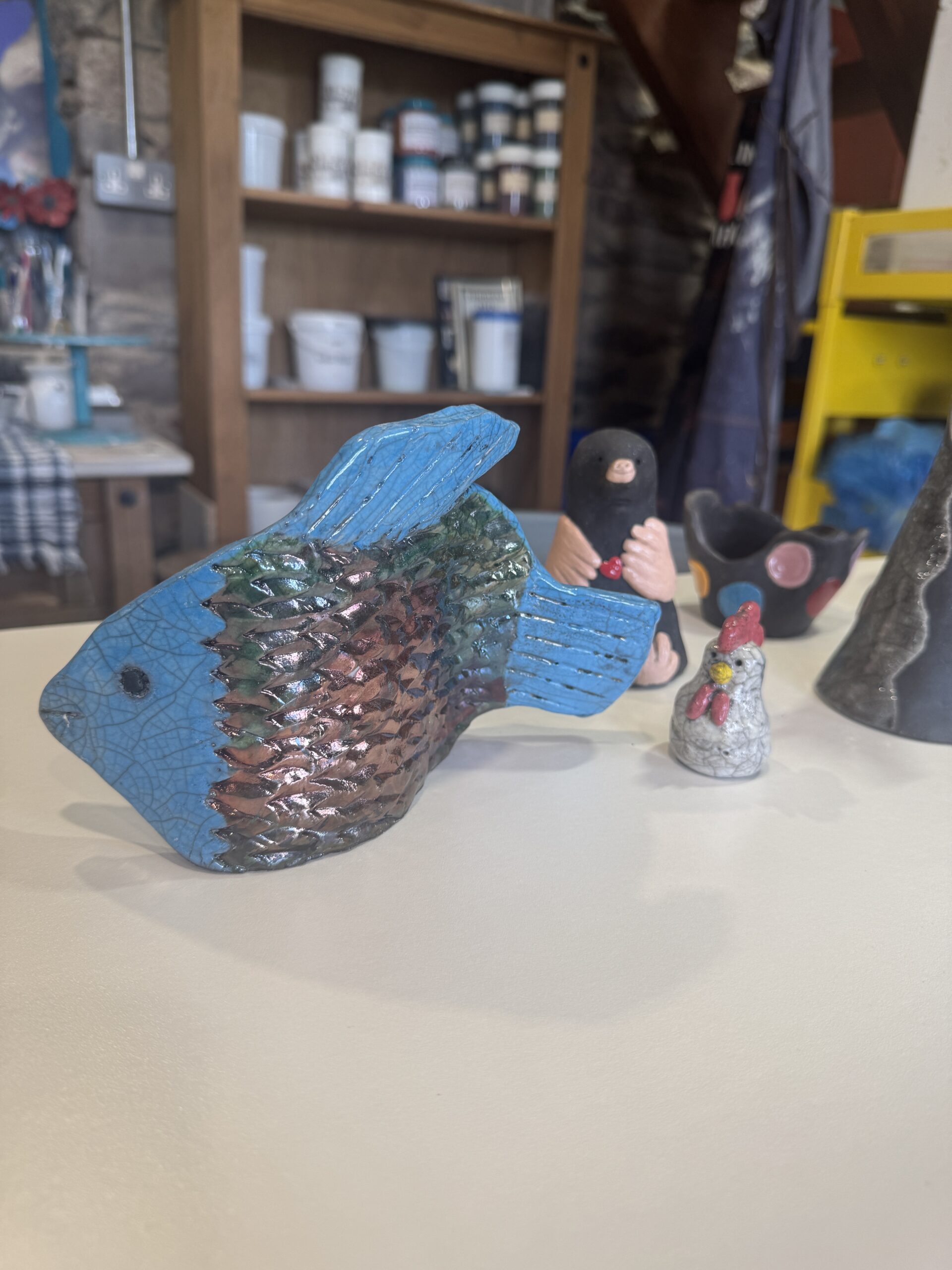 One of our favourite classes is when Jane brings some of her pottery students for a hybrid version of our taster experience. This session is different in that the students get one pot from us but bring along their own creations they have been making in their pottery class.  As there would be quite a few things to fire, we started a little earlier with our customary cuppa and housekeeping / safety talk. All the students besides Debroah had been before so we decided they did not need the talk about Raku, its history and how it came to the UK. Everyone got stuck into glazing and decorating their creations – all fabulous hand-built items. Today was definitely animal day as we had horses, sheep, owl, badger, hares, mole, fish, chicken and hedgehogs.  In addition to this, Welsh ladies, Welsh miners, little ghosts and an angel.