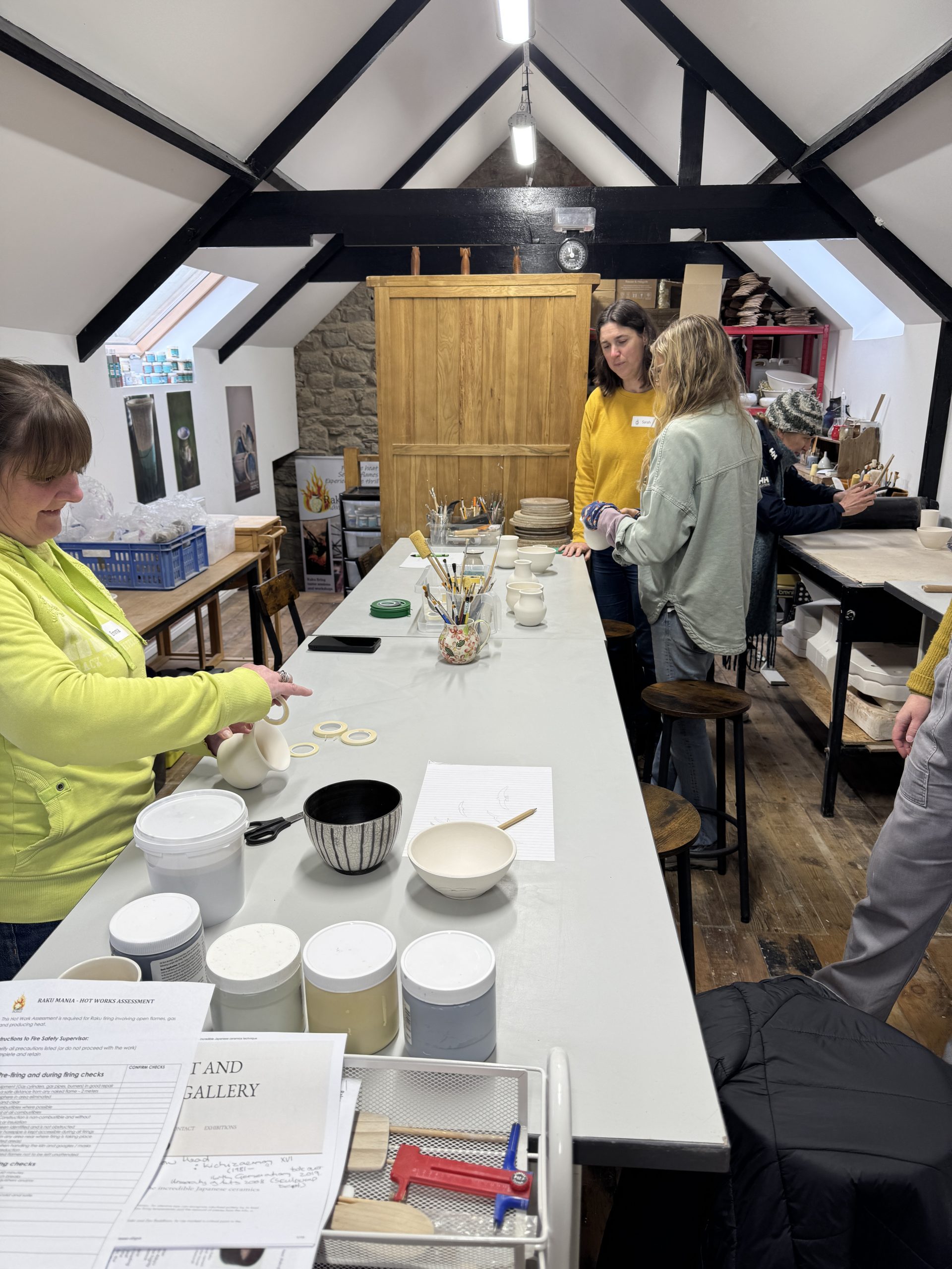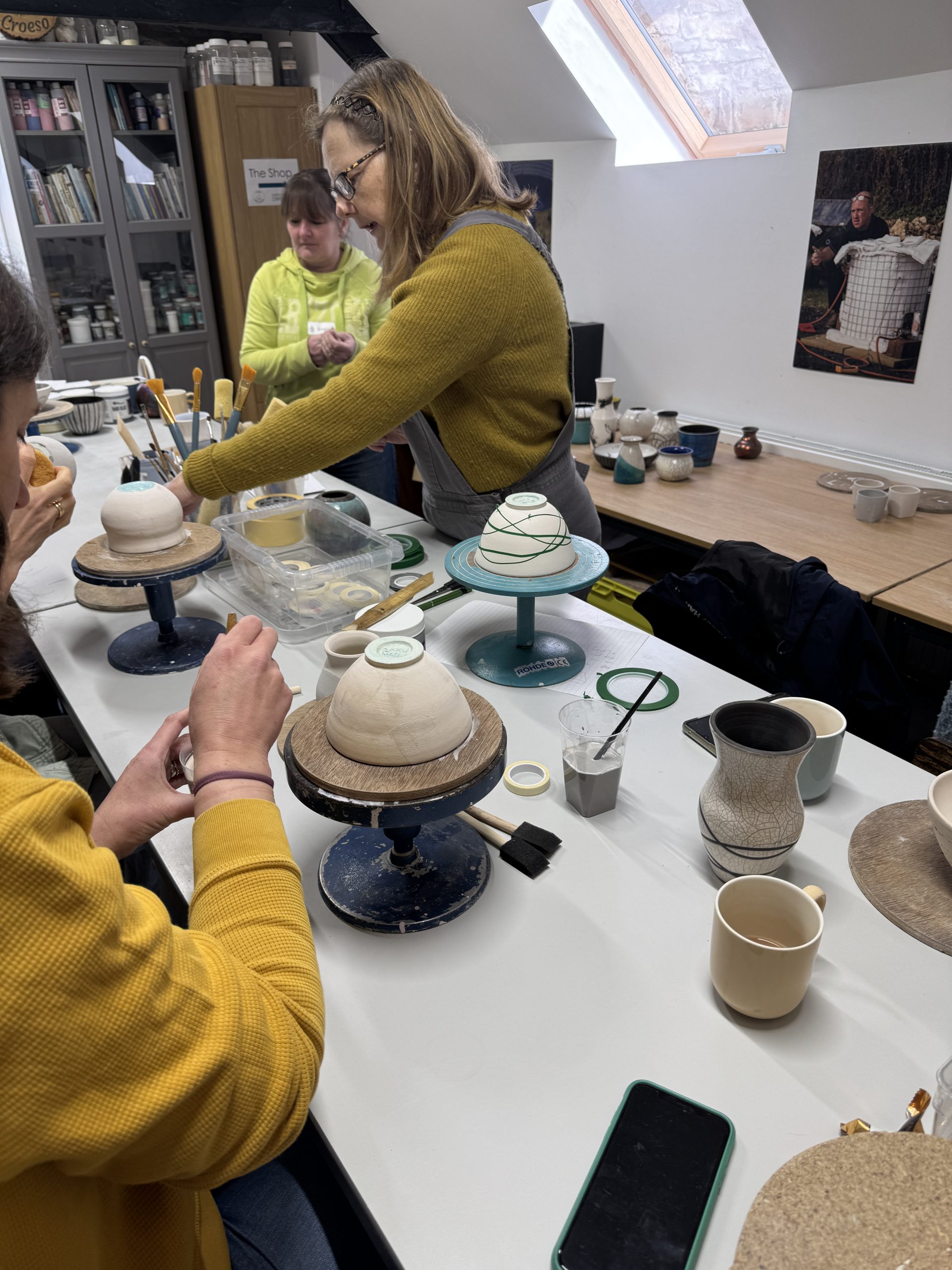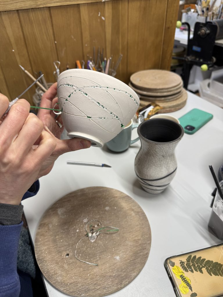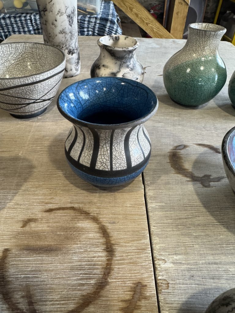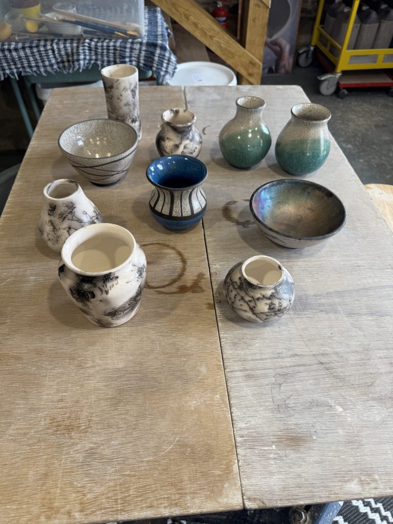 The new 2025 season started today with a new group of eager students. We broke a record today for the students that have travelled the furthest to enjoy a day with us – one from Portsmouth and another from Cornwall. The kettle was on, and we all enjoyed a cuppa whilst running through some formalities. Adrian had updated his talk on the history of Raku which always goes down well, and Karen showed off several Raku styles we do here in the studio. The students all chose two bisqued pots from the selection and a few decided to go for a third pot, at a small extra charge. Everyone got decorating / glazing their pots with some simple but interesting designs. There were lots of questions and Karen & Adrian were on hand to advise what works best and what to avoid.