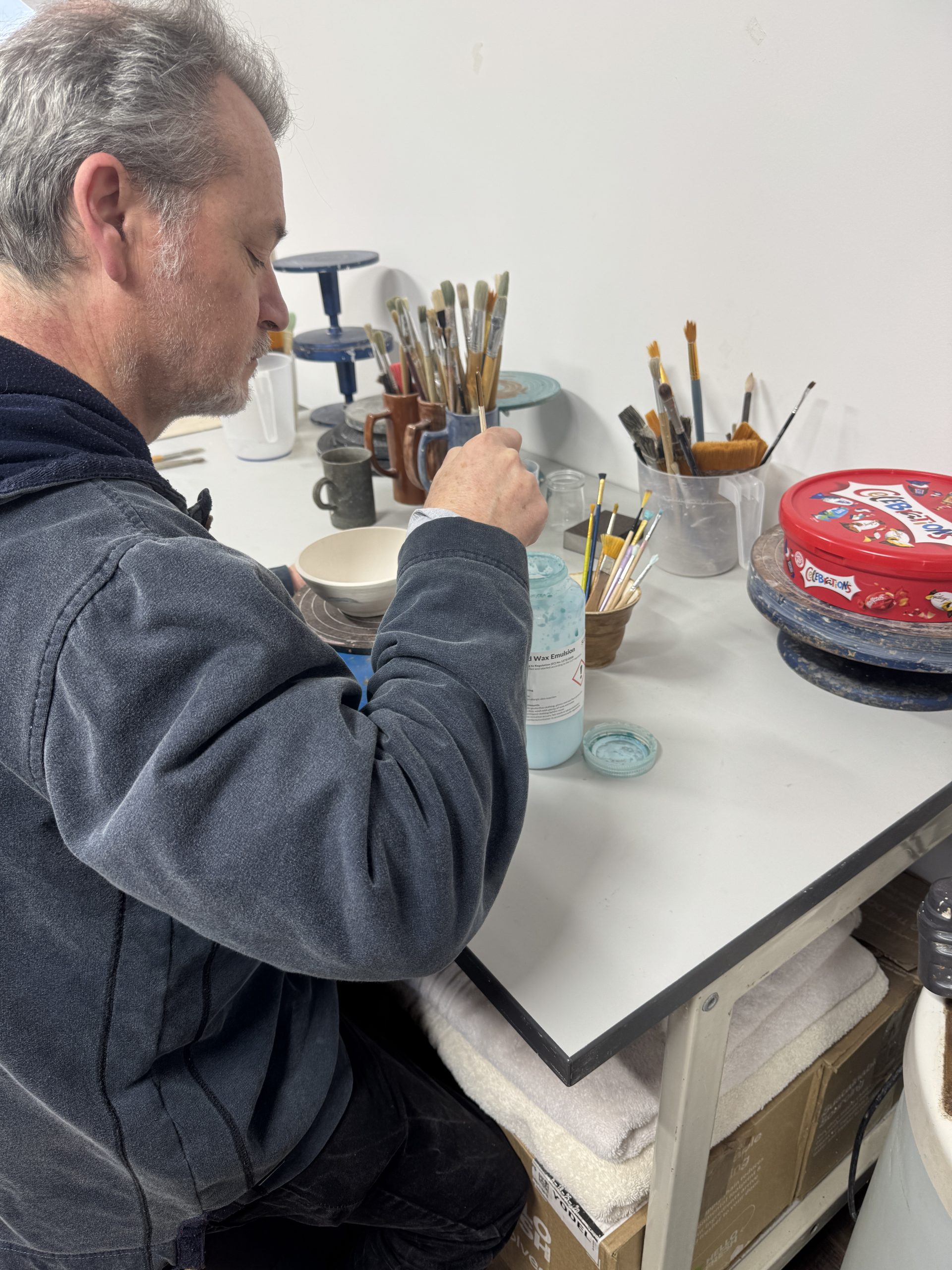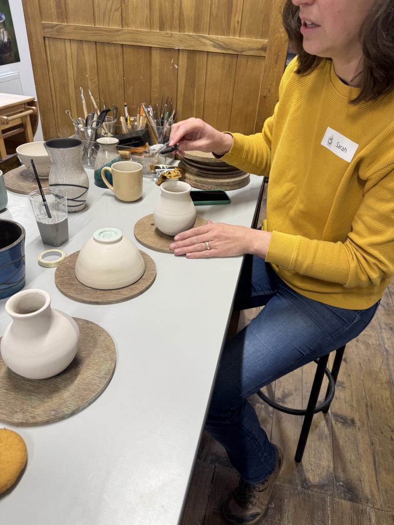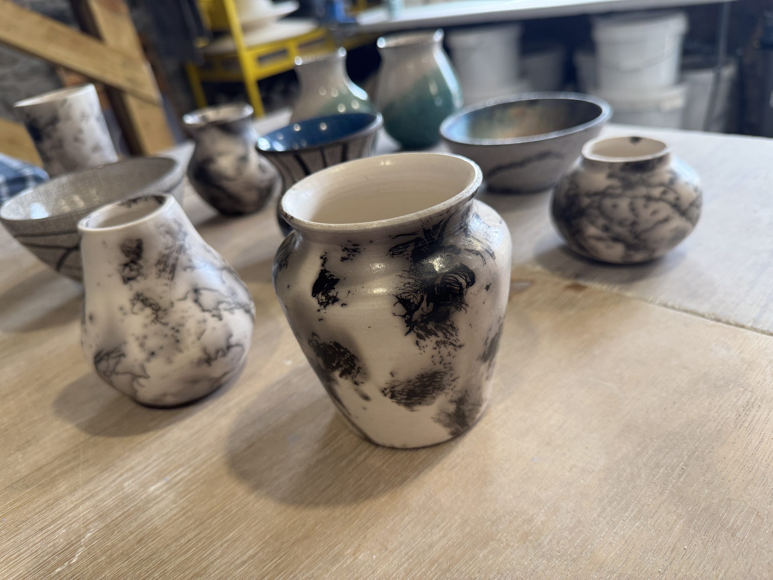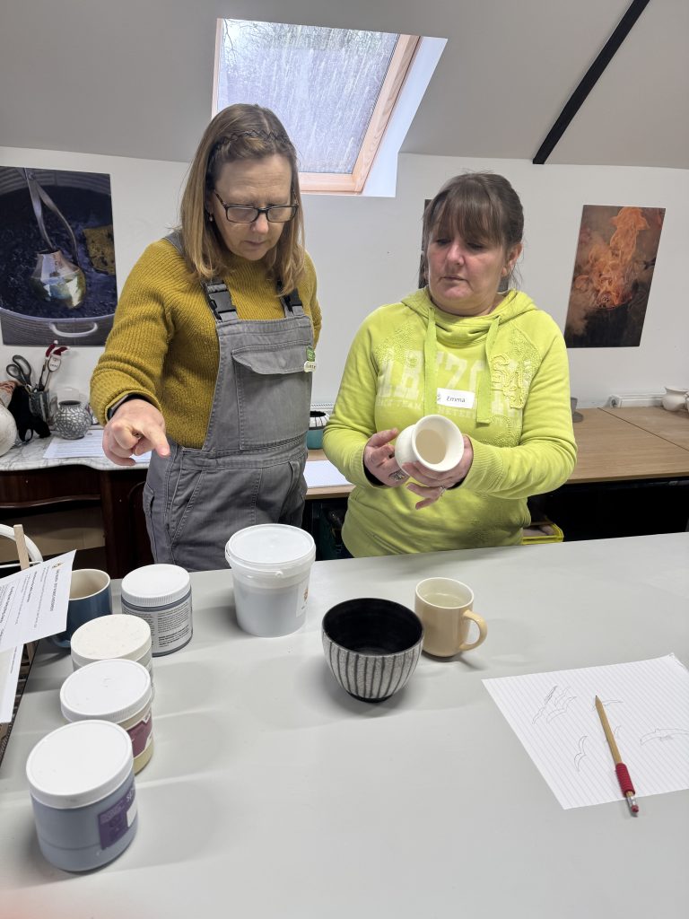 The new 2025 season started today with a new group of eager students. We broke a record today for the students that have travelled the furthest to enjoy a day with us – one from Portsmouth and another from Cornwall. The kettle was on, and we all enjoyed a cuppa whilst running through some formalities. Adrian had updated his talk on the history of Raku which always goes down well, and Karen showed off several Raku styles we do here in the studio. The students all chose two bisqued pots from the selection and a few decided to go for a third pot, at a small extra charge. Everyone got decorating / glazing their pots with some simple but interesting designs. There were lots of questions and Karen & Adrian were on hand to advise what works best and what to avoid.