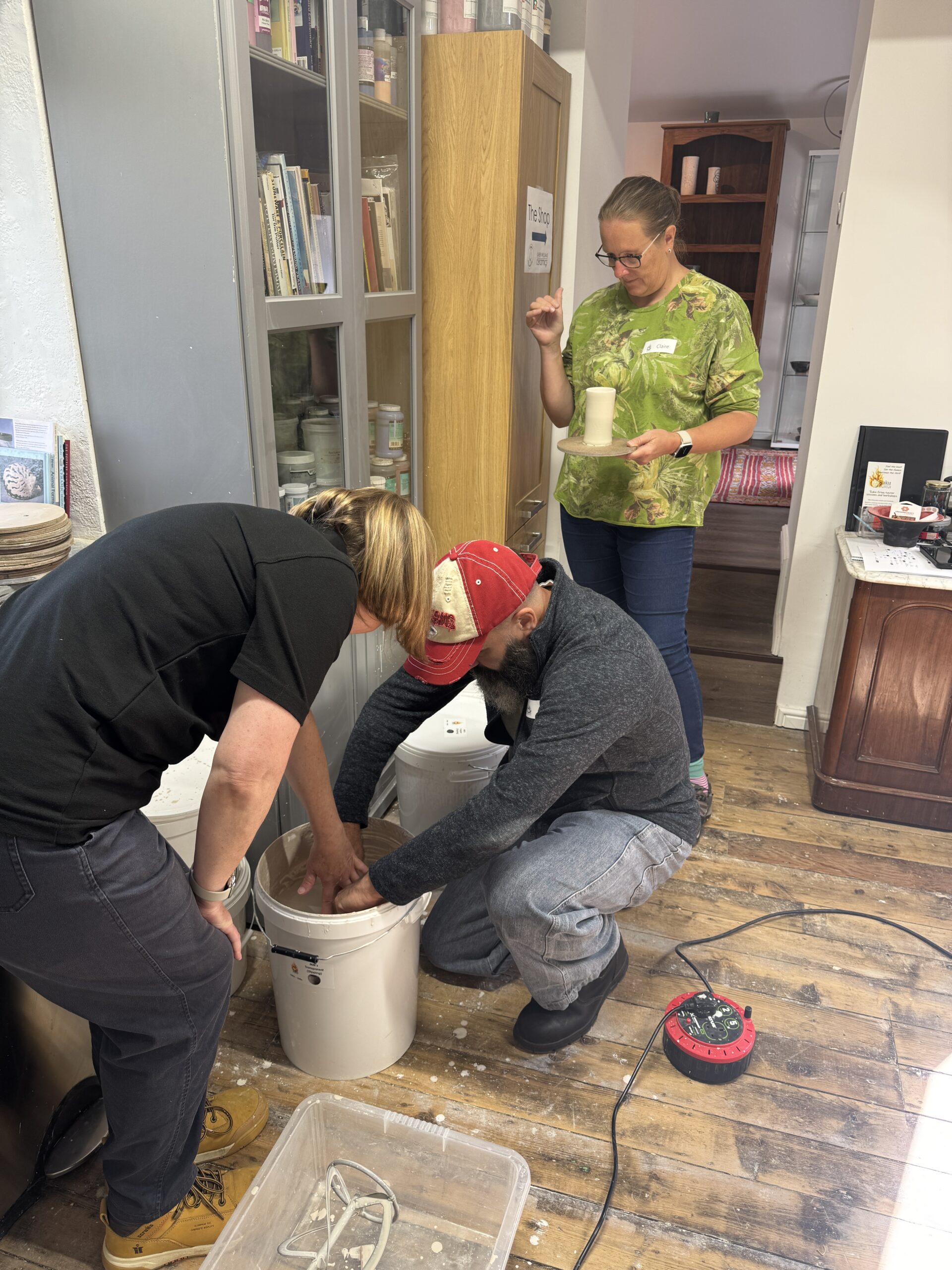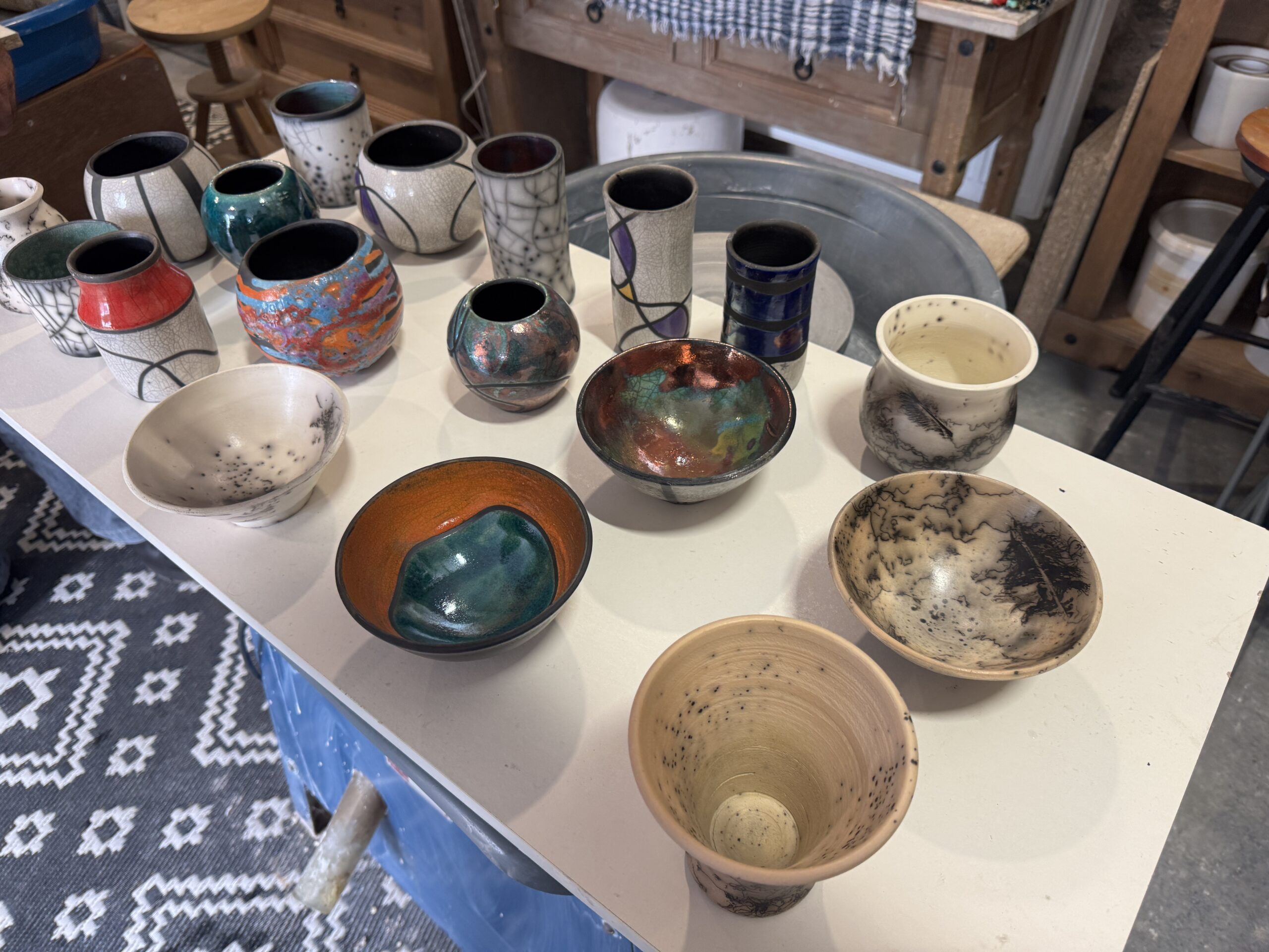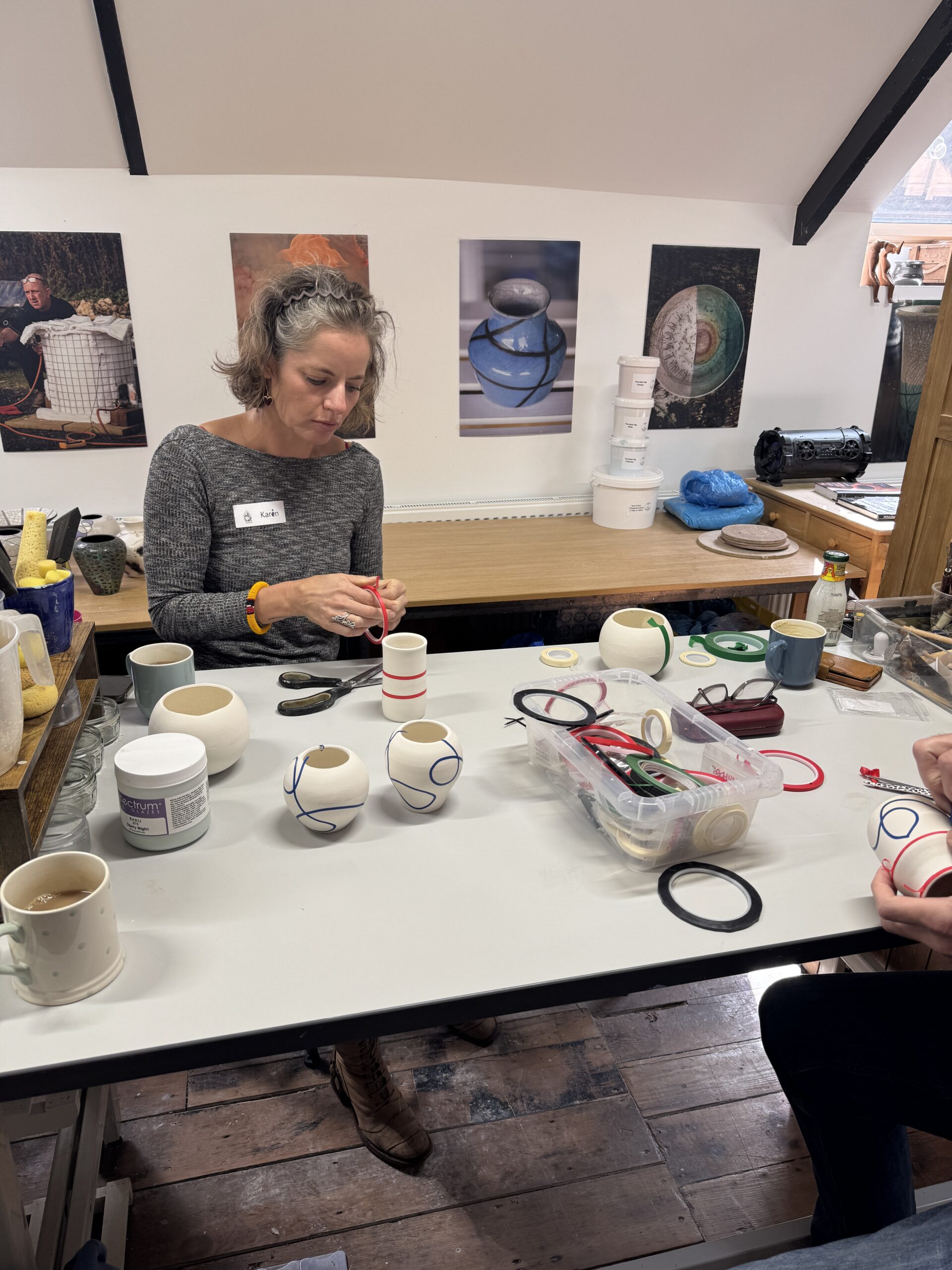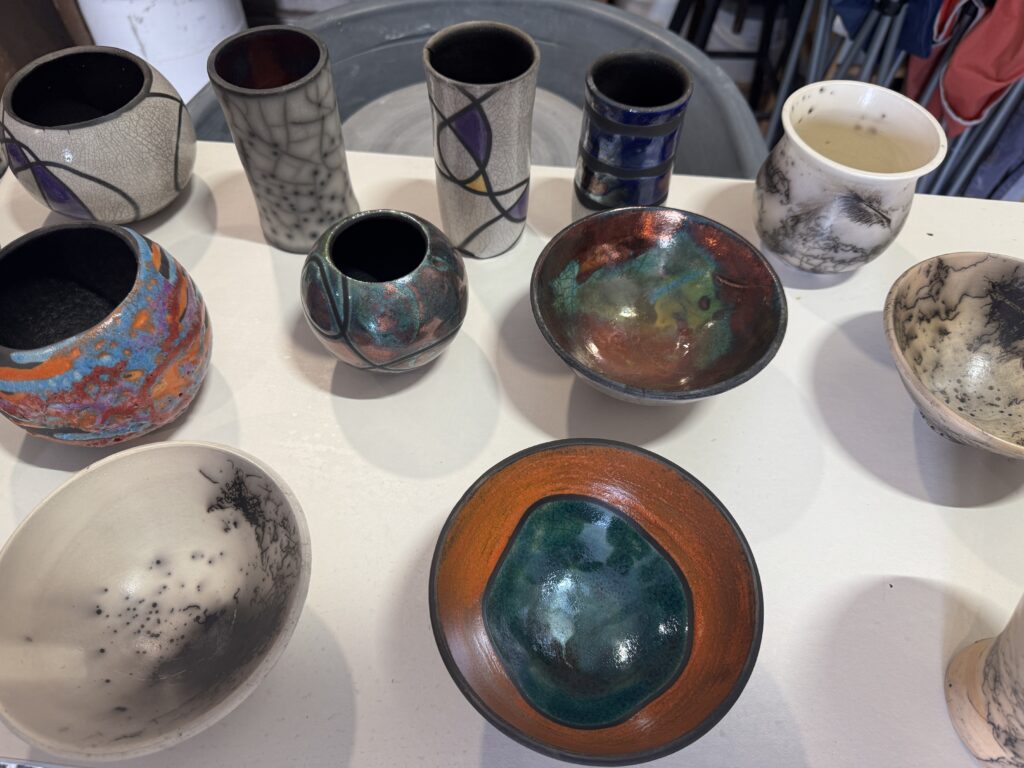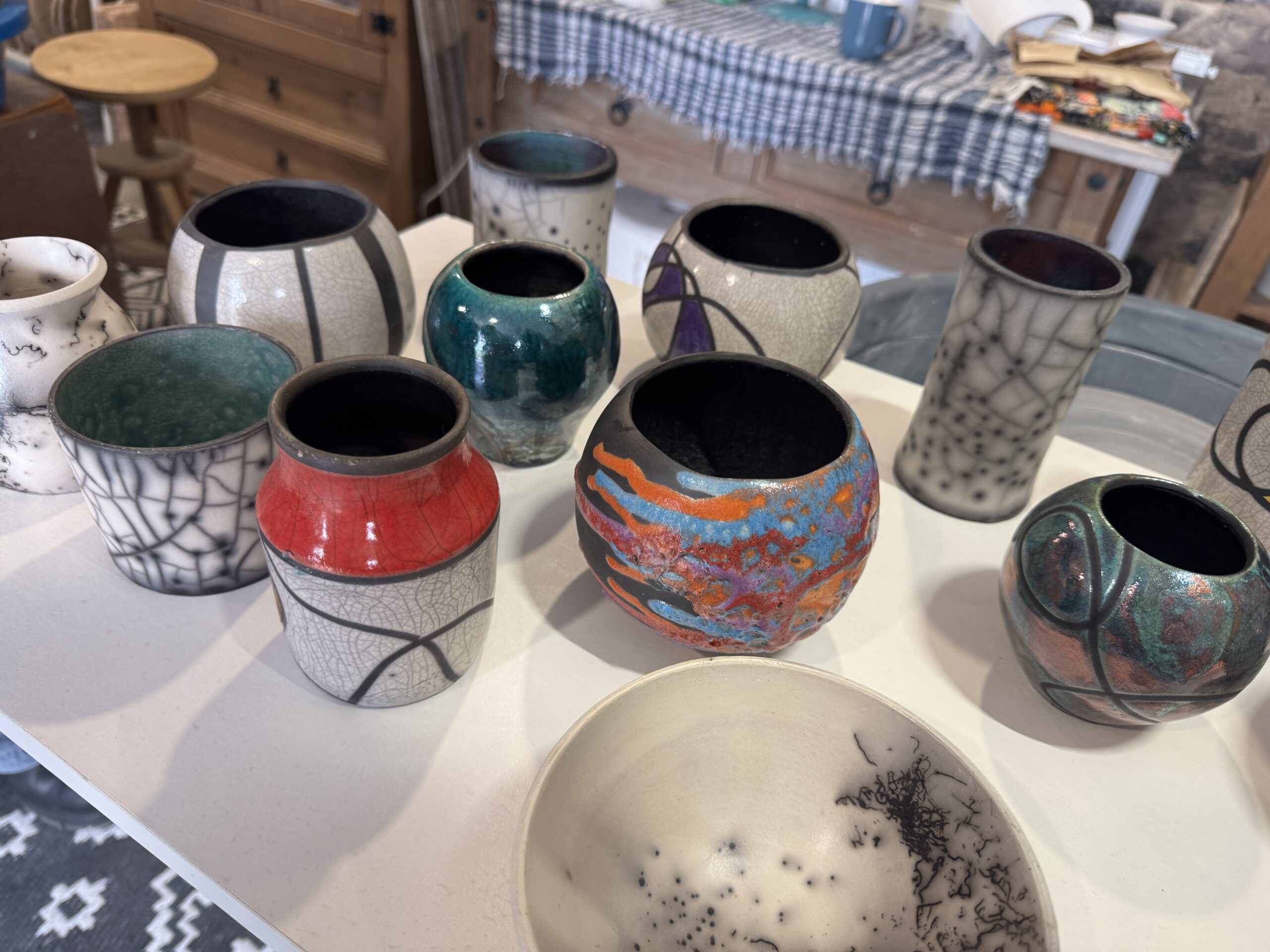 Karen was on hand to show all the students the different styles of Raku that we do, including using glazes, underglazes, and several commercial glazes. The students were shown some examples of Naked Raku and explained the two step process that we use and how burnishing pots at a leather hard stage allow for a fabulous shiny finish. The technique which many of our students love, is the horse hair / feather / sugar one where these items are carbonised on the pots at around 700c after being heated to 850c. We are also trying out a different clay to the Ashraf Hannah we predominately use because of the white finish, this clay has a pinky / buff colour when fired, so interested to see how the horse hair technique comes out on one of these pots.