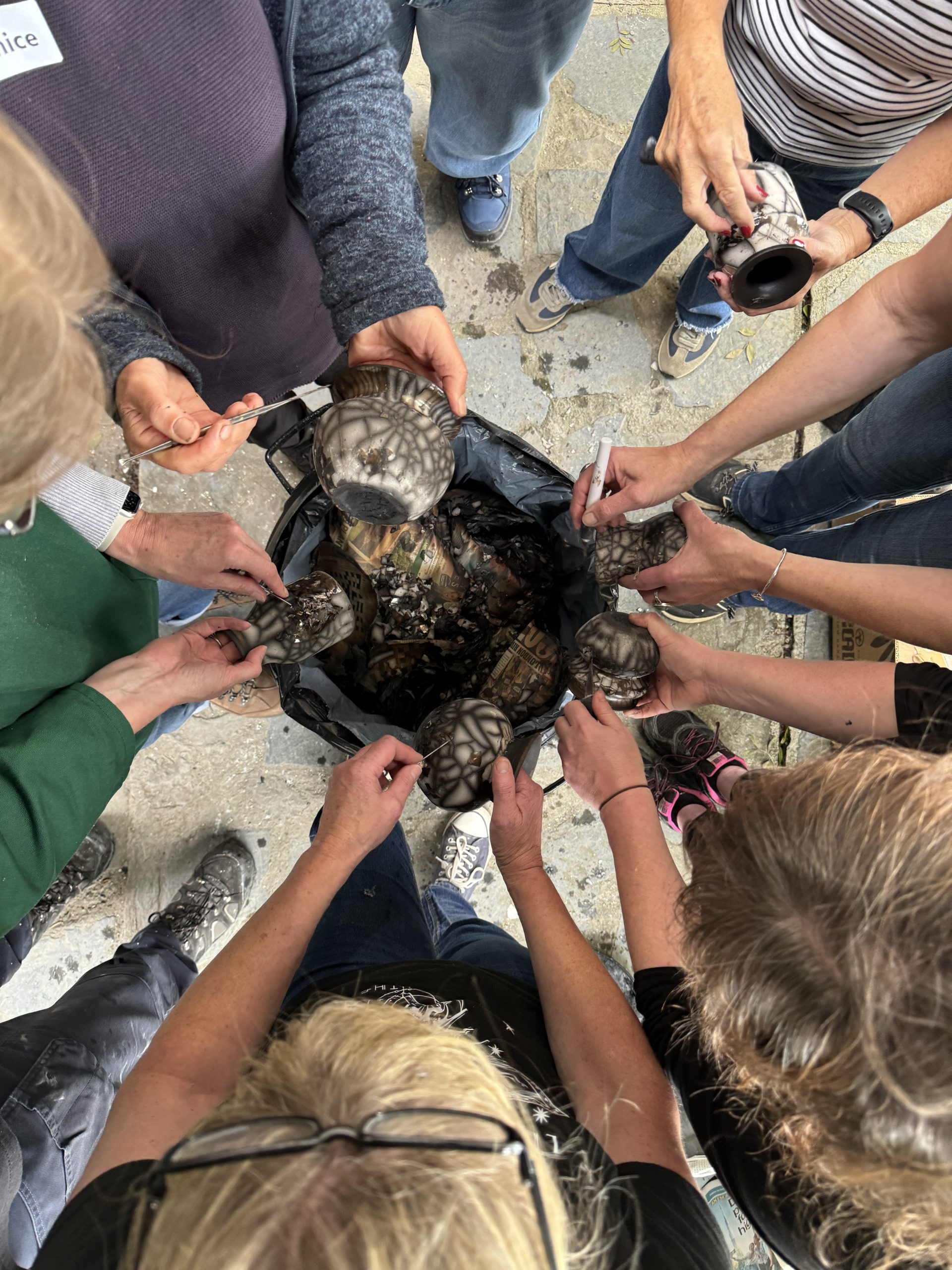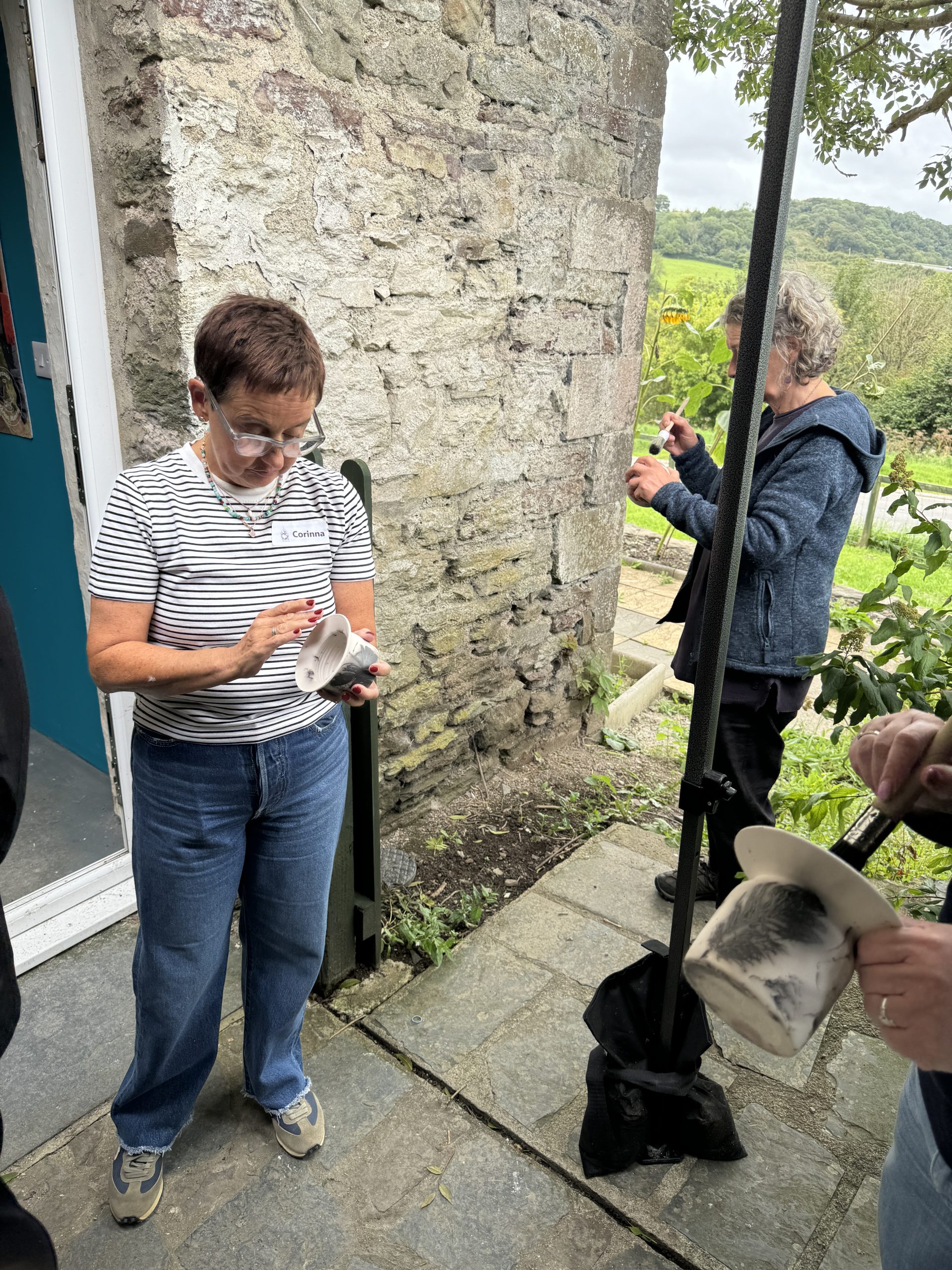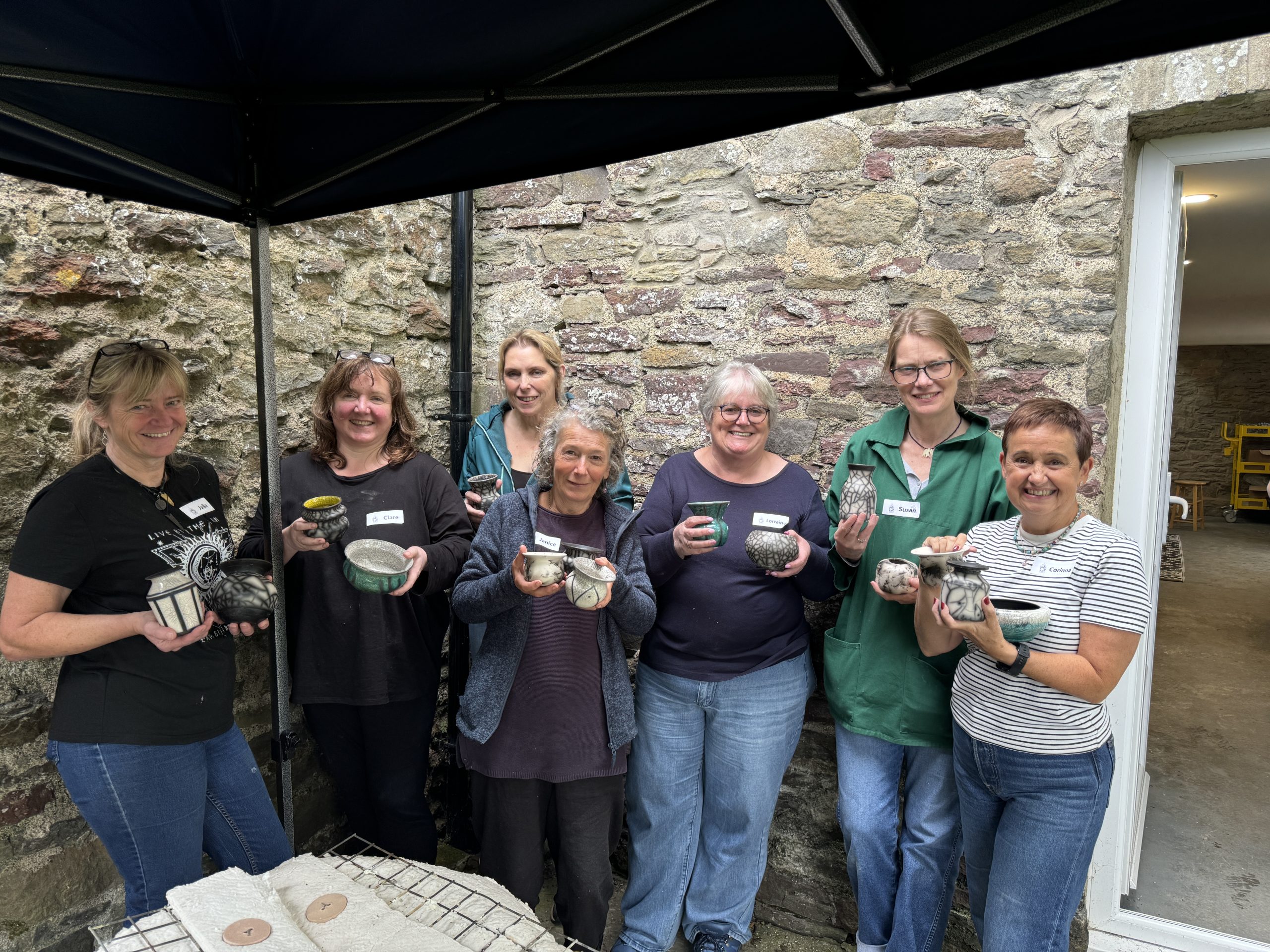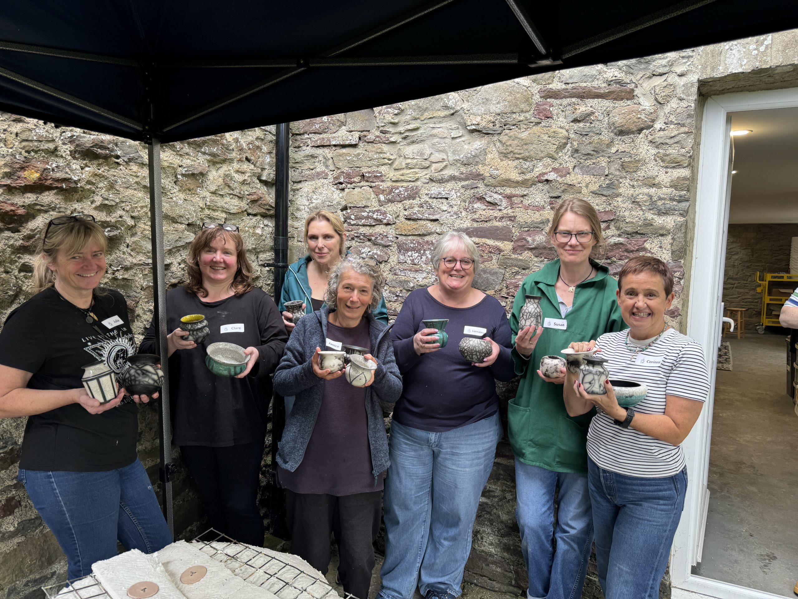 The sun was shining, gazebo all set up with the kiln, kettle on and now we just need some students. Today, Angela who is already a RakuManiac and a pottery teacher herself, was bringing 6 of her students for the Raku experience. Great excitement as everyone arrived and had a brew to start the day off. Here at RakuMania we have a stocked fridge and lots of snacks for our students to help themselves to during the day.