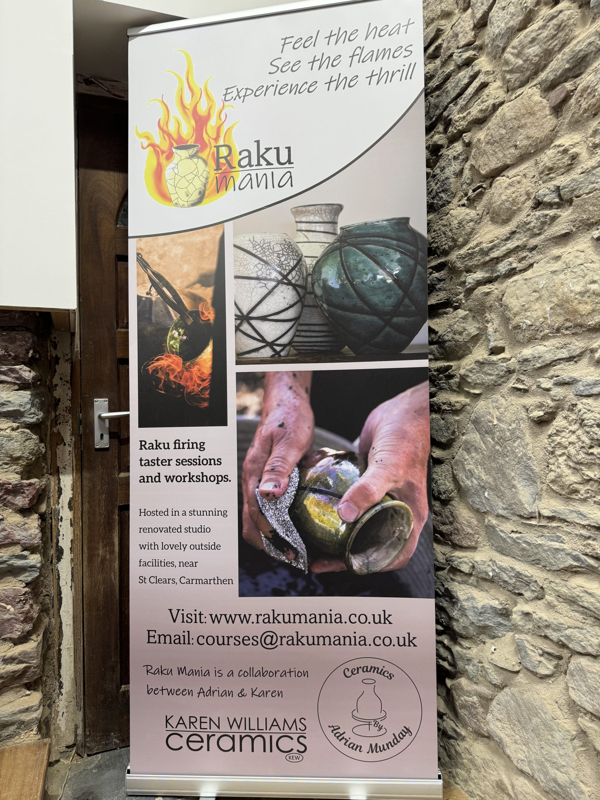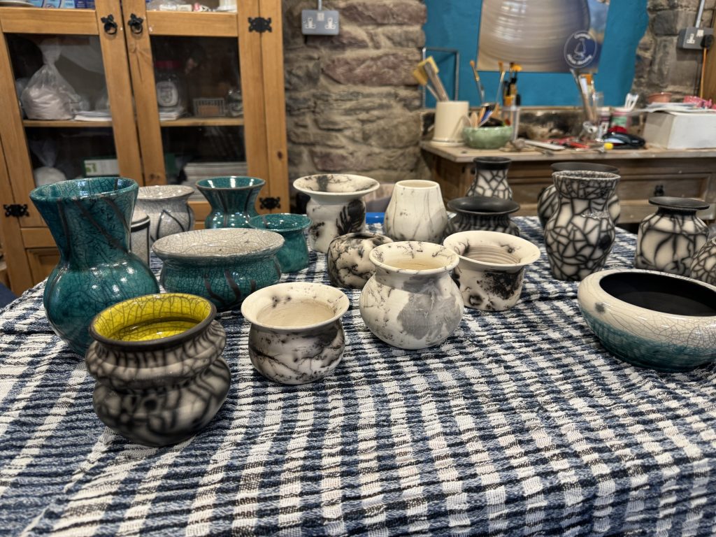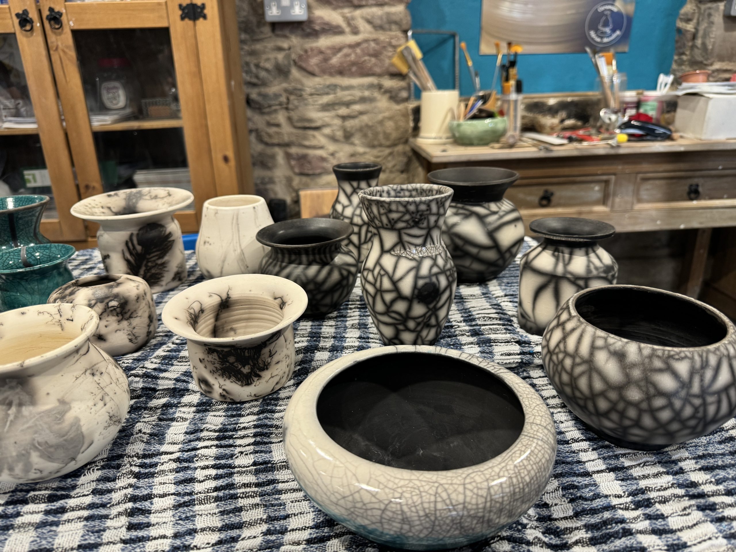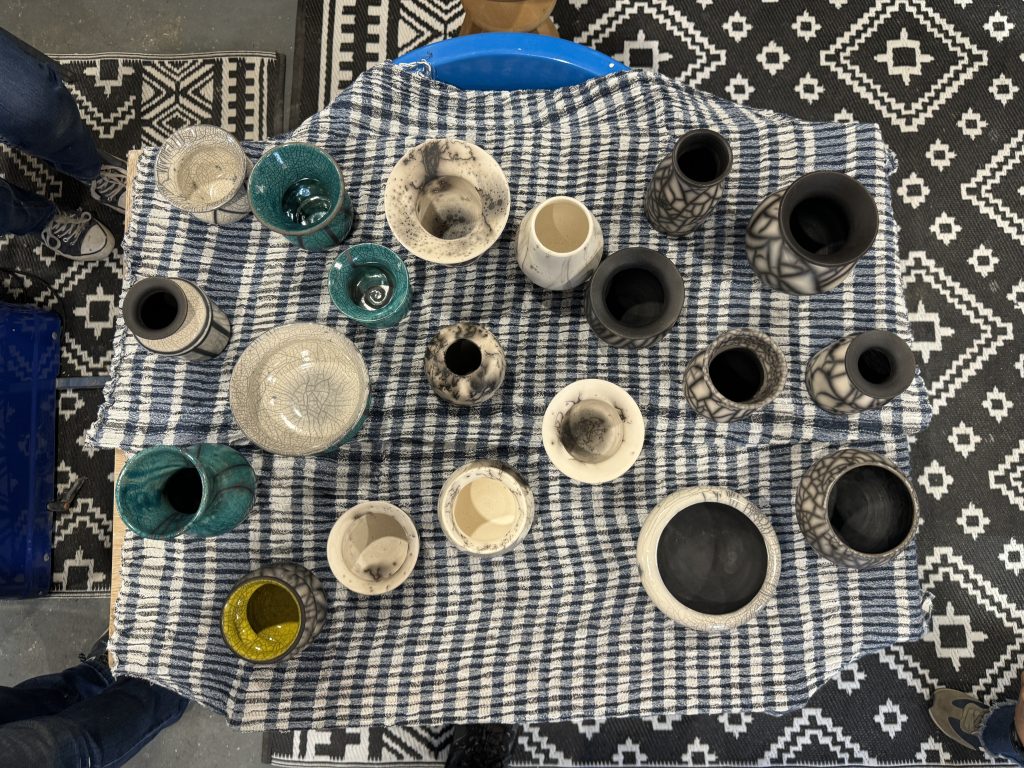 Out came the glazes, brushes, marking tape, wax resist and the new RakuManiacs went to town decorating their pots. All of them chose a Naked Raku method to do and don’t worry we all kept our clothes on. We have been getting some stunning results with the Naked Raku and this class was no exception. Everyone managed to prepare their pots before having their packed lunch. After lunch we fired up the kiln and managed to fit in four firings. The students were taught how to clean, seal and polish the pots that needed polishing.