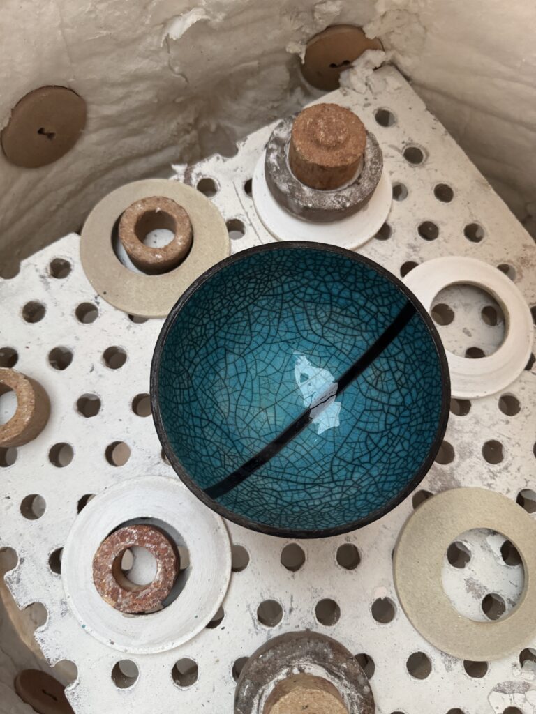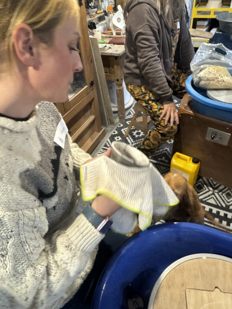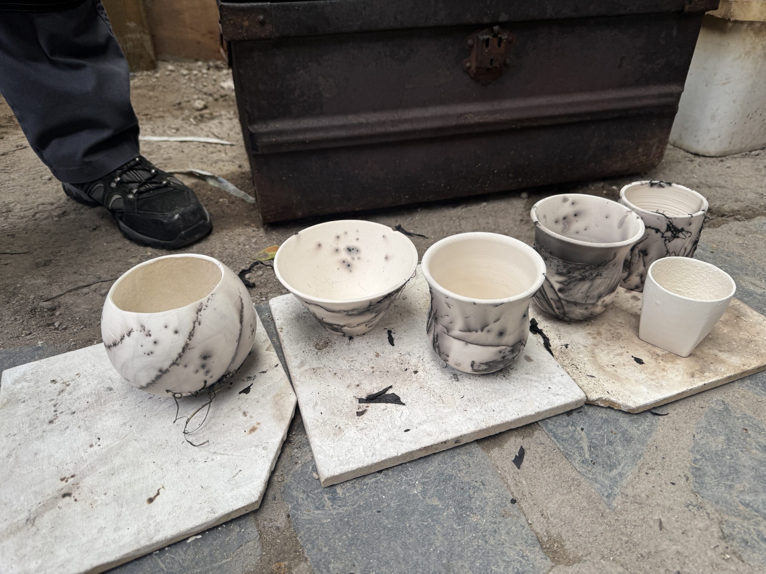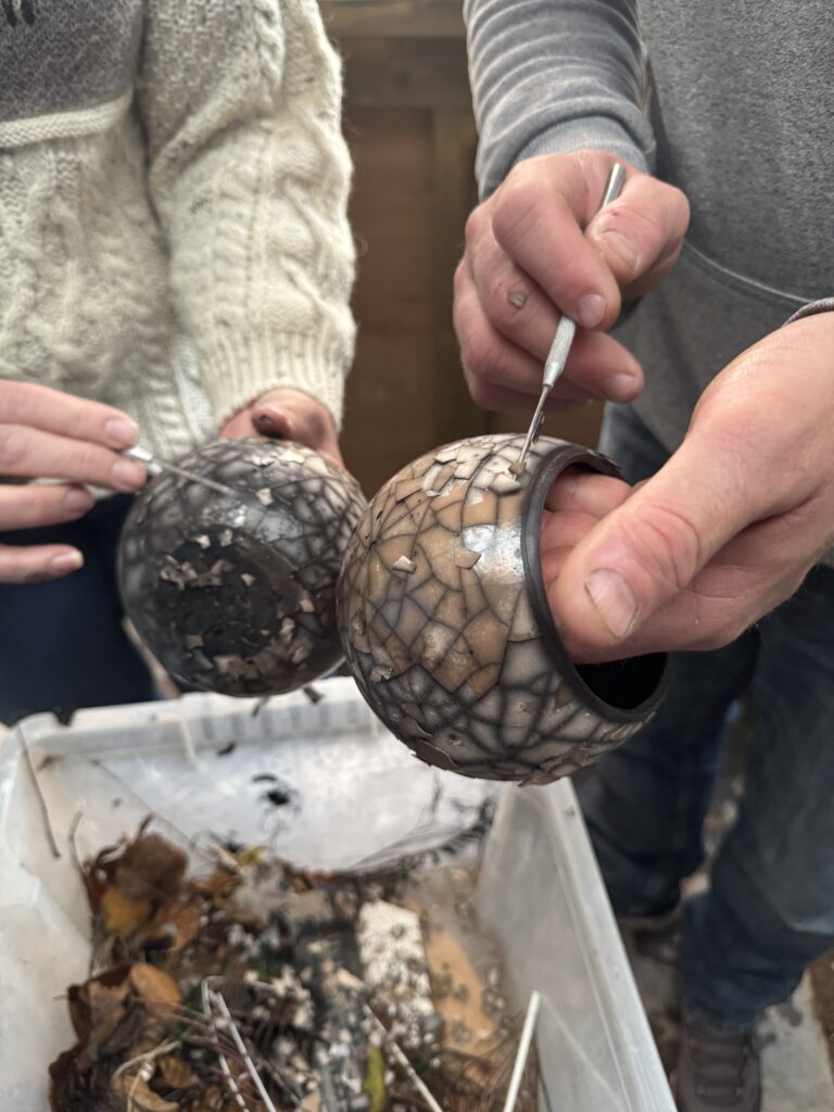 Before we knew it, it was lunch time and everyone tucked into their packed lunch bought with them. As usual we had lots of refreshment on offer, and the kettle is always on. After lunch, we fired up the kiln and had 3 firing β Glaze, horsehair and finally a glaze one again with some naked Raku. The students were shown how to clean off any excess carbon on the pots and for the horsehair and naked ones, how to wax and polish their pots.