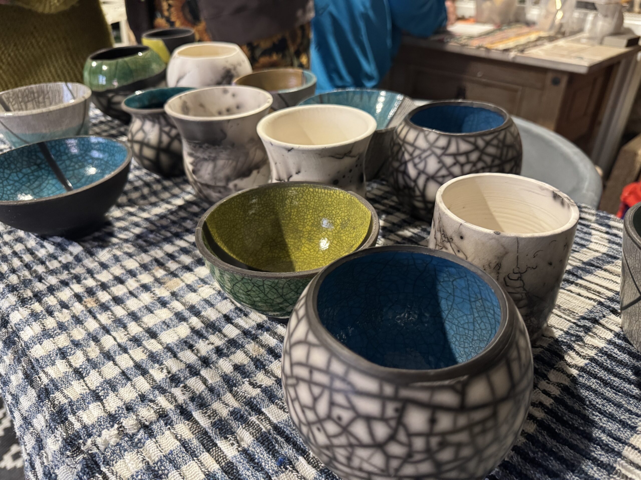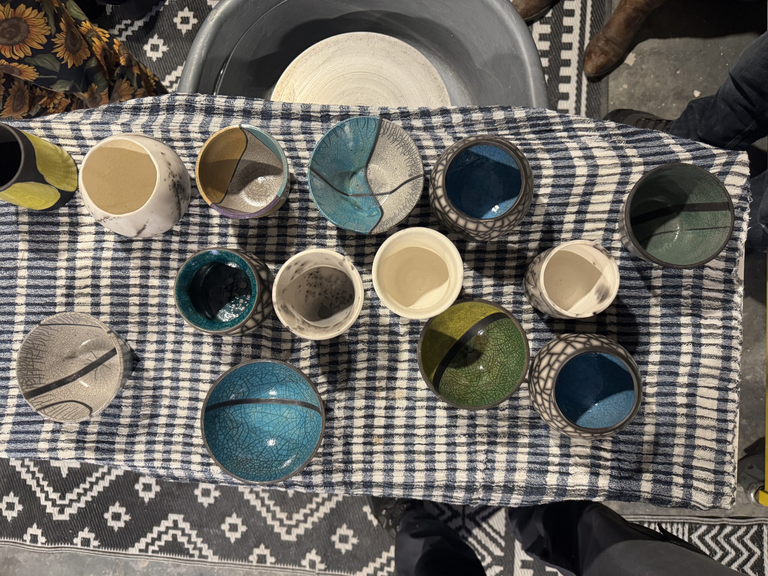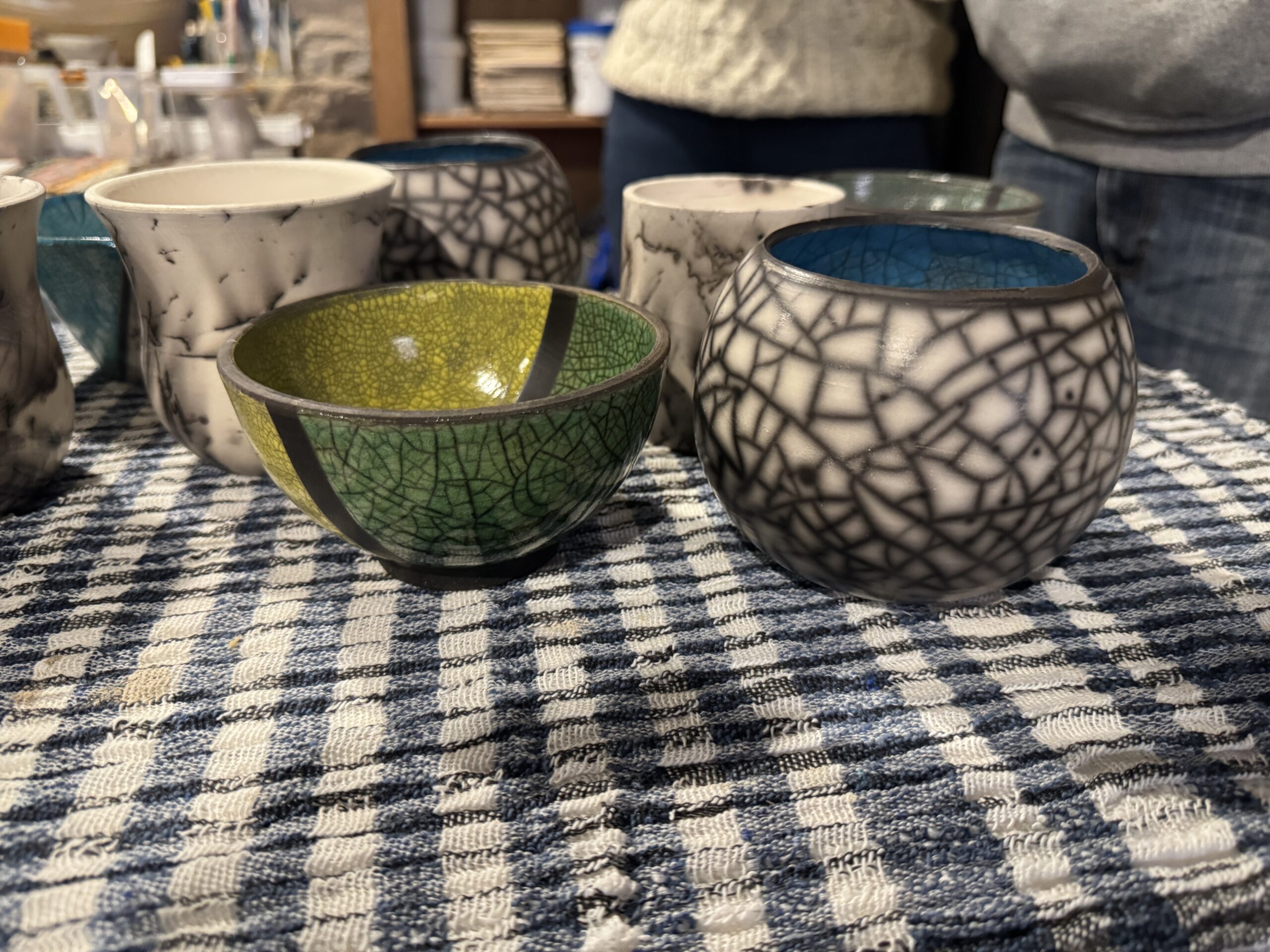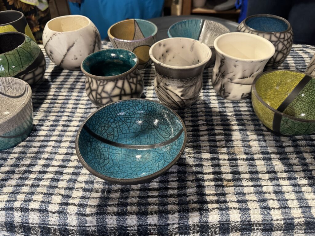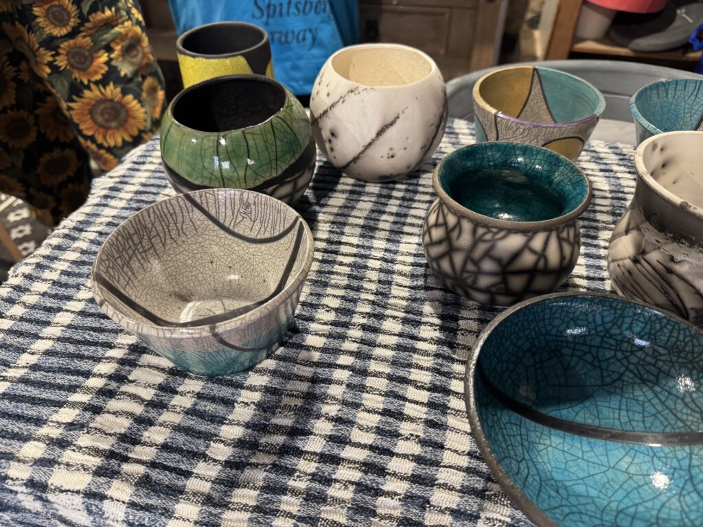 Only 5 students in todayβs class and everyone arrived on time rearing to learn all about Raku and make some great pots. Even though we had a returning student coming back for more fun, we still did the customary brief talk about ceramics and the history of Raku. Karen then showed the class the main three styles of βRakuβ that we do in this studio to give them an idea of what they might like to do on with their pots. Besides any pots chosen for the horse hair / feather technique, the students started to decorate and glaze their other pots. The course fees include two pots which have been made by us, burnished and bisque fired. Students can purchase a third pot for a nominal amount if they wish to try all three techniques. Most students take us up on this offer π.