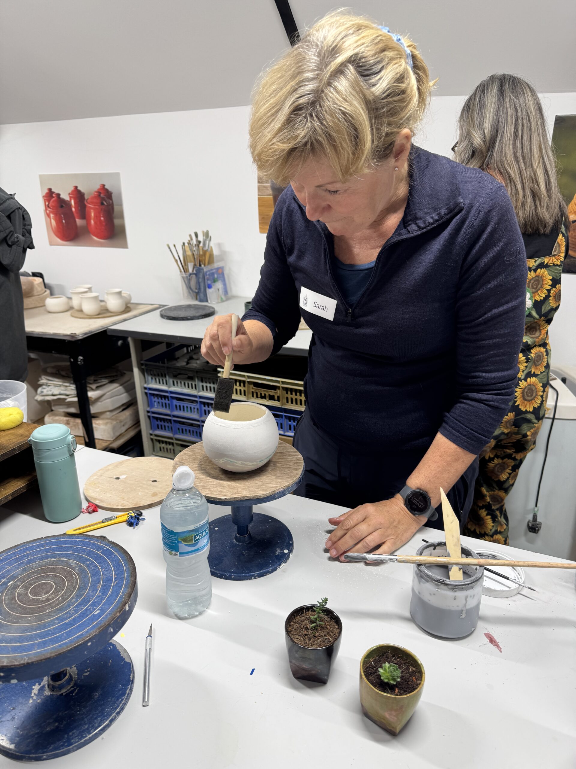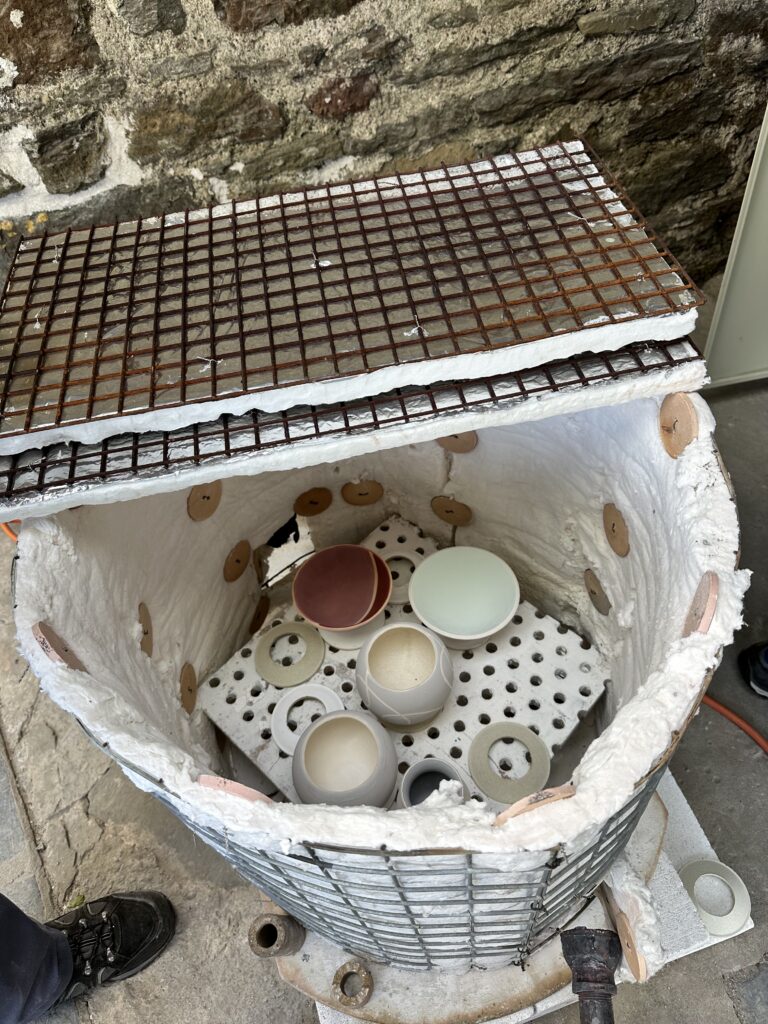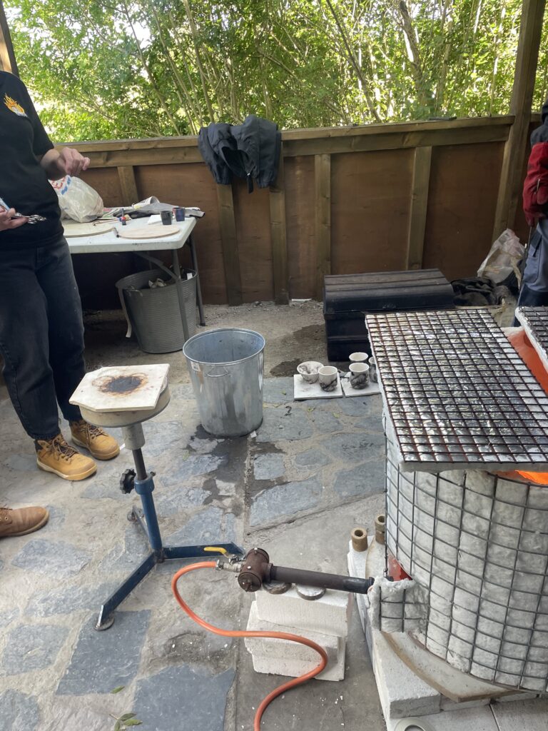 The students set to work deciding and decorating their two pots which they chose from a selection they have on hand. They are also given the option to purchase a third pot if they want to try all three styles.  Karen was on hand to give some advice and help with the dipping glazes whilst Adrian set up the kiln and firing area. The students then had a 45 min lunch break to eat their packed lunches, and we fired up the kiln just after 1pm.