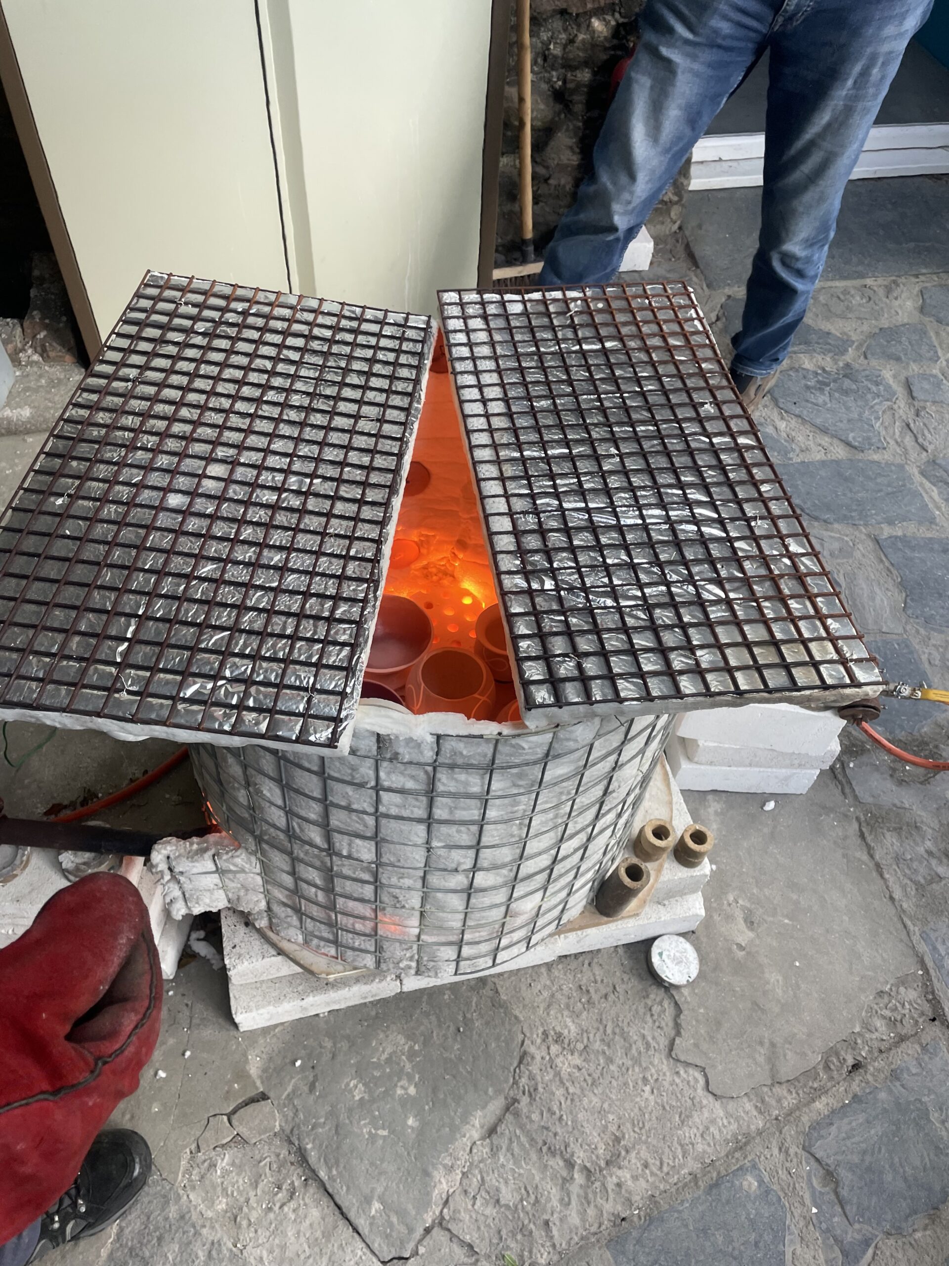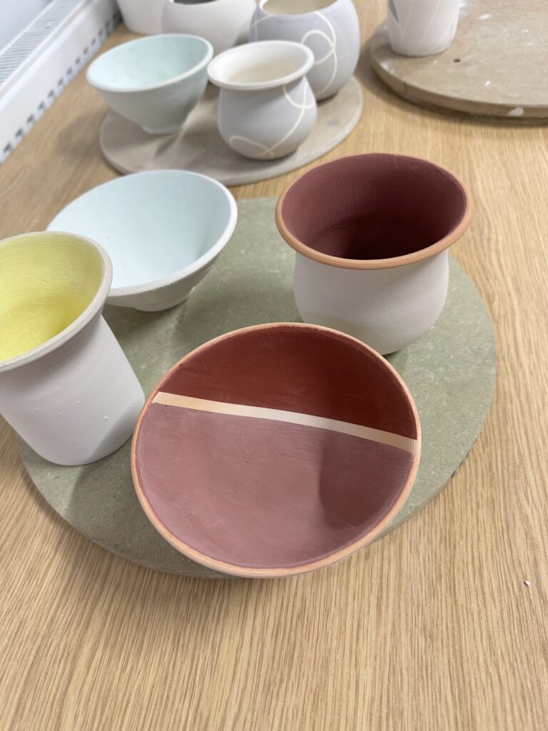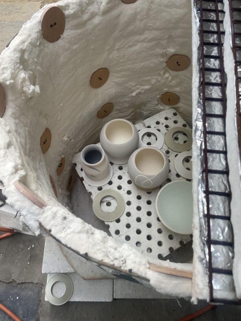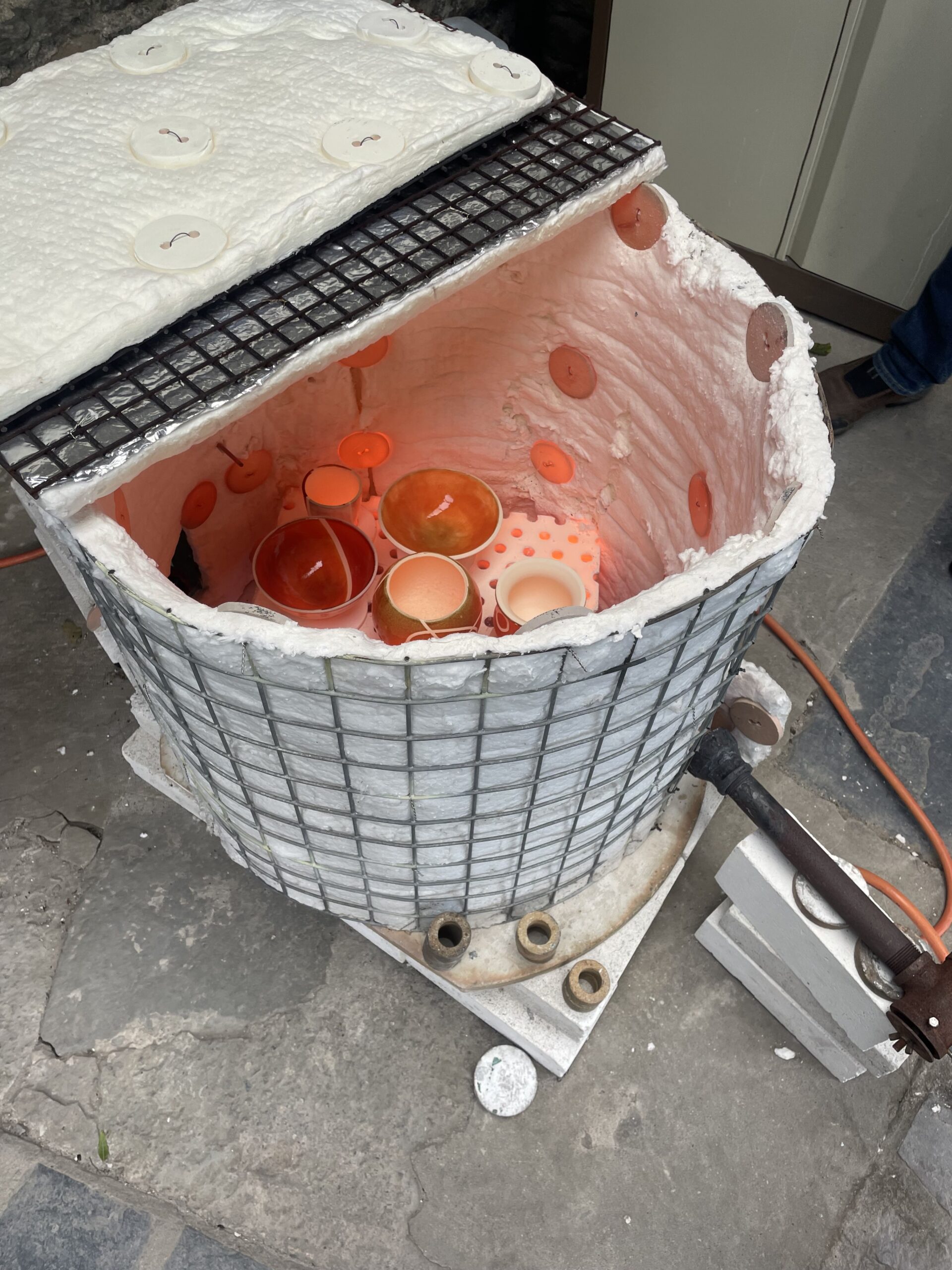 The students set to work deciding and decorating their two pots which they chose from a selection they have on hand. They are also given the option to purchase a third pot if they want to try all three styles.  Karen was on hand to give some advice and help with the dipping glazes whilst Adrian set up the kiln and firing area. The students then had a 45 min lunch break to eat their packed lunches, and we fired up the kiln just after 1pm.