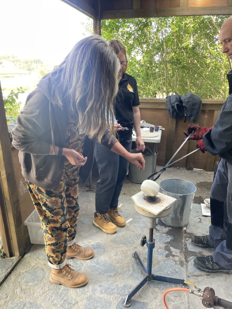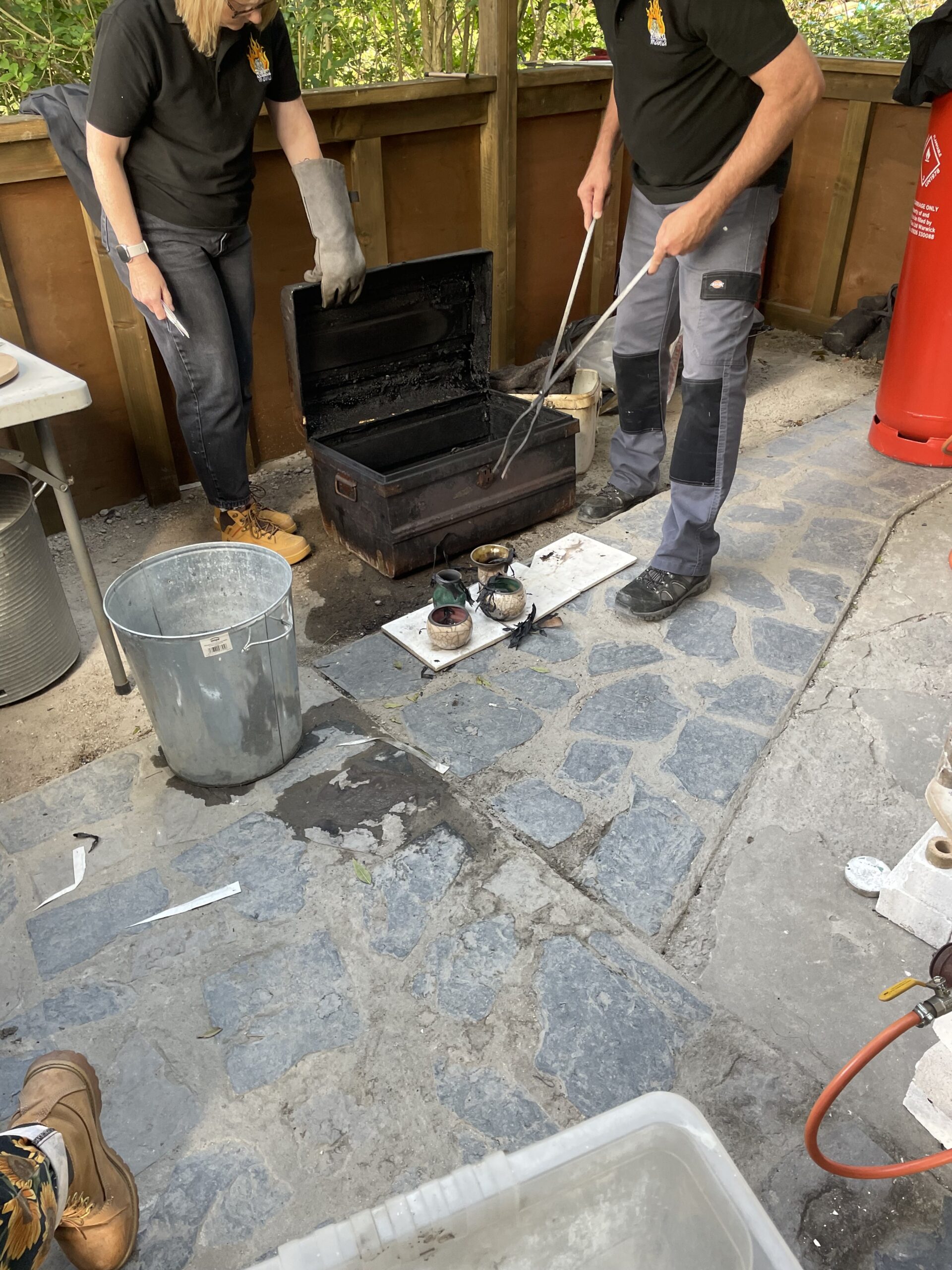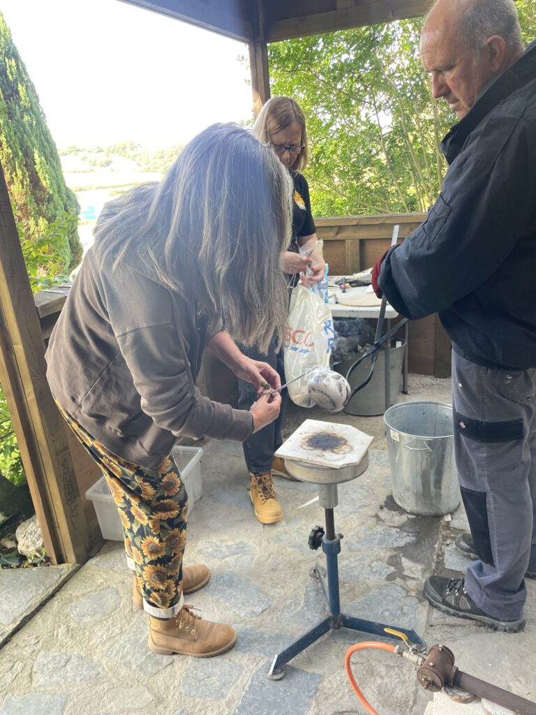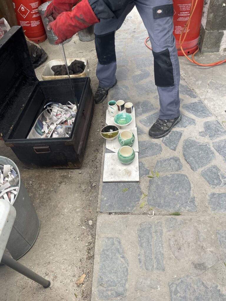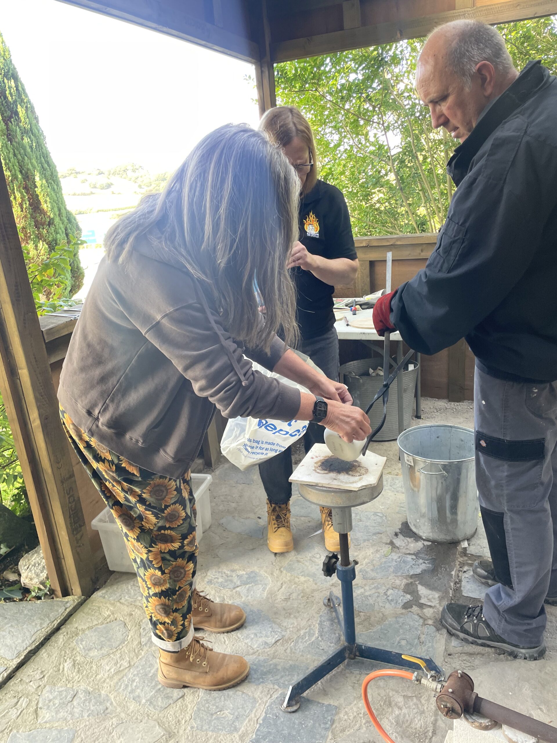 Everyone arrived a little early (must been keen 😊), so Adrian did the tea round before starting the instructions. We print off name badges for everyone, so no embarrassment about forgetting someone’s name when they get too close to the kiln!! It’s great to hear where everyone has come from and their background (if any) to pottery. The great thing about our Raku Taster Day is that you don’t need any pottery experience and you don’t have to be artistic – Adrian is not hehehehe.