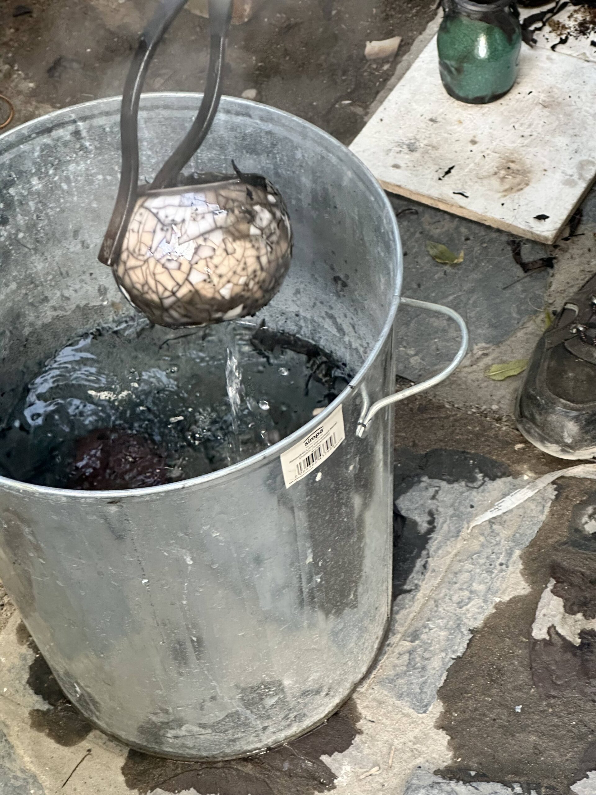 The plan was for 3 firings – 2 glaze and 1 horse hair / feather. We had some excellent results and one of our commercial glazes, Starry night gave us a stunning turquoise colour.  The students which tried both the Naked Raku and horse hair / feather technique were shown by Karen how to seal and polish their pots. Pots with glazes needed a good clean to get off any excess carbon from the reduction chamber.