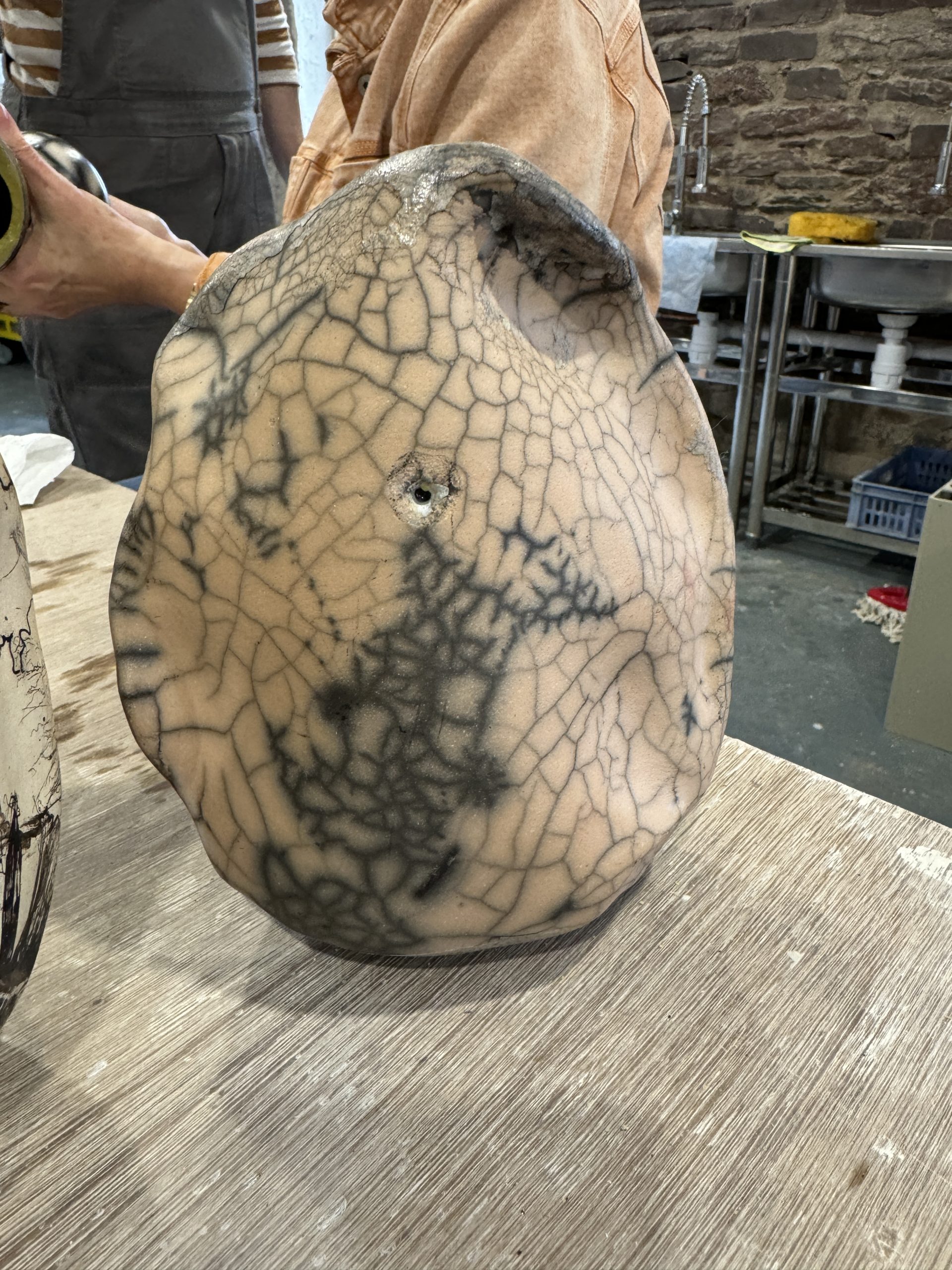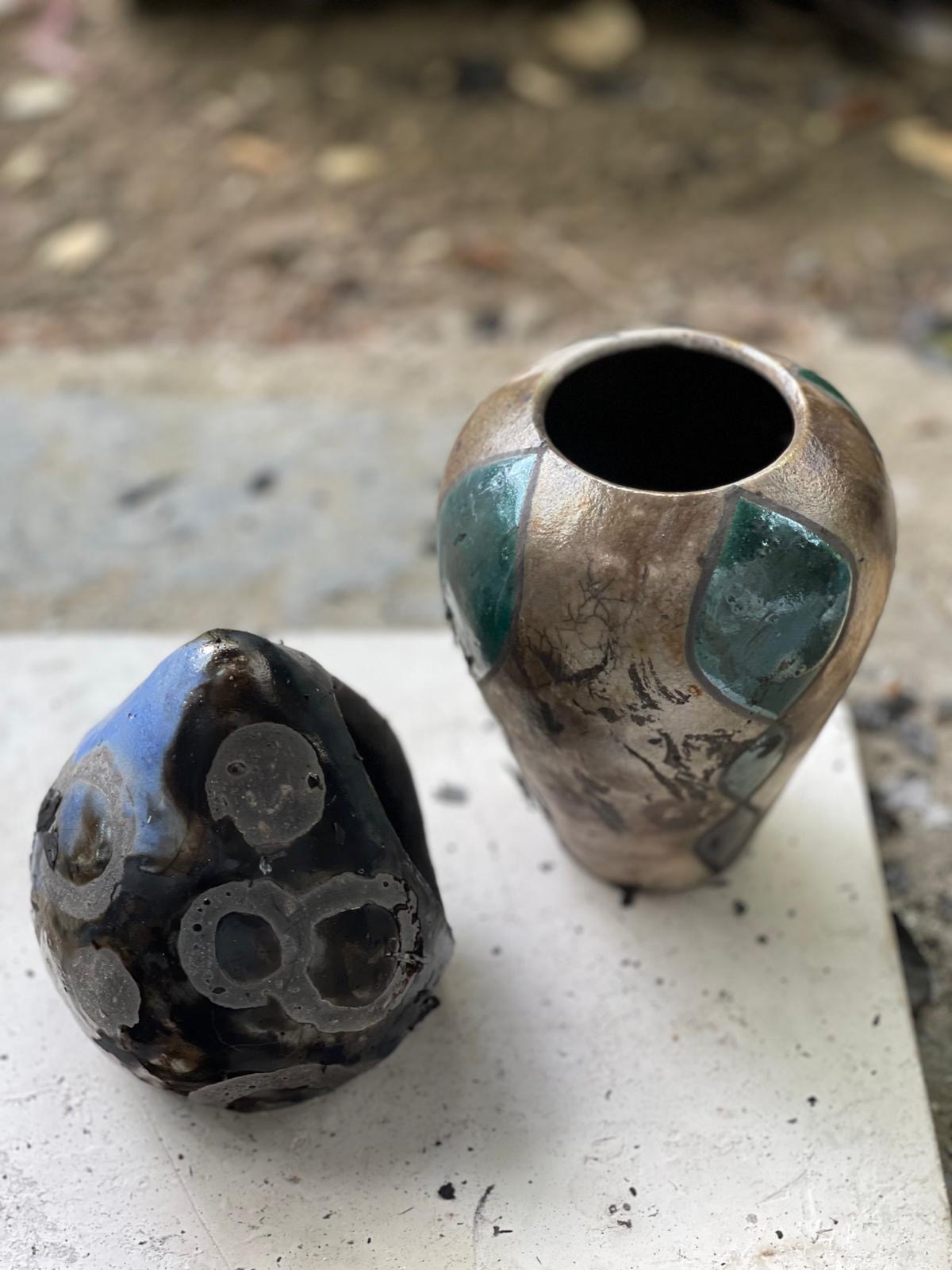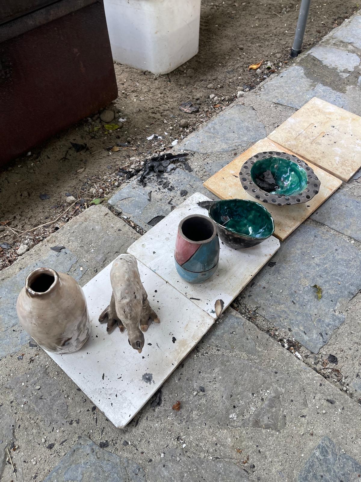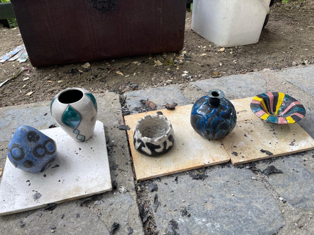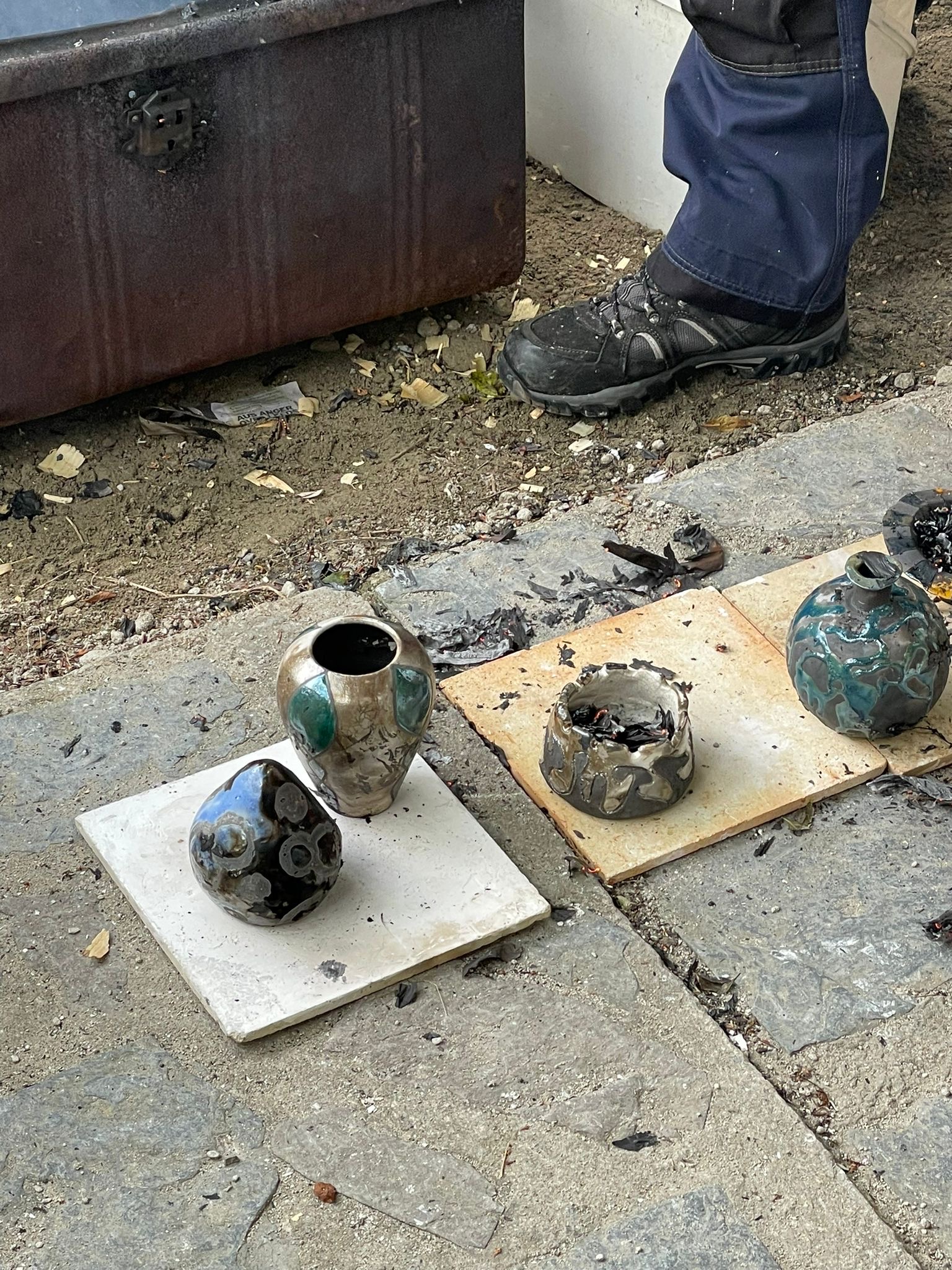 We had two firings before lunch and 4 after as we had quite a few pots to fire and some of them on the slightly bigger side. Happy to say all the hand-built pots (and non-Raku clay pots 😊) survived the firing and reduction process. There were some interesting experiments with designs and glazes, and we had some wonderful outcomes….even Claire was happy with one of her pots !