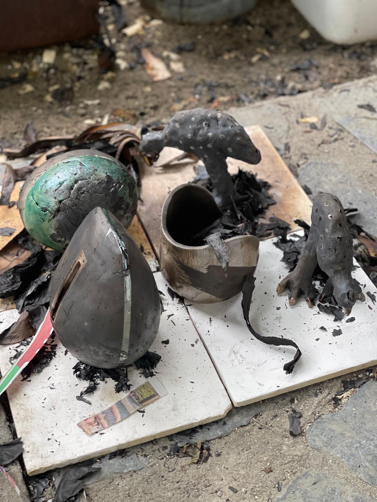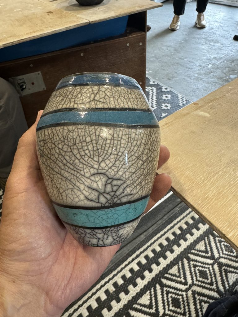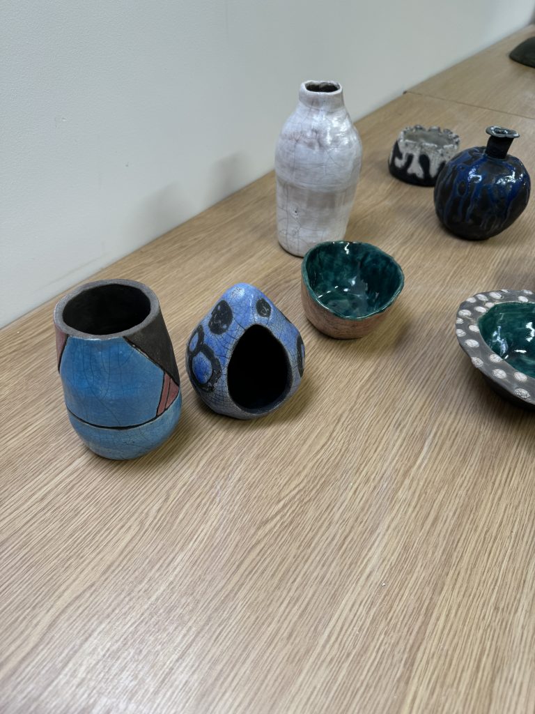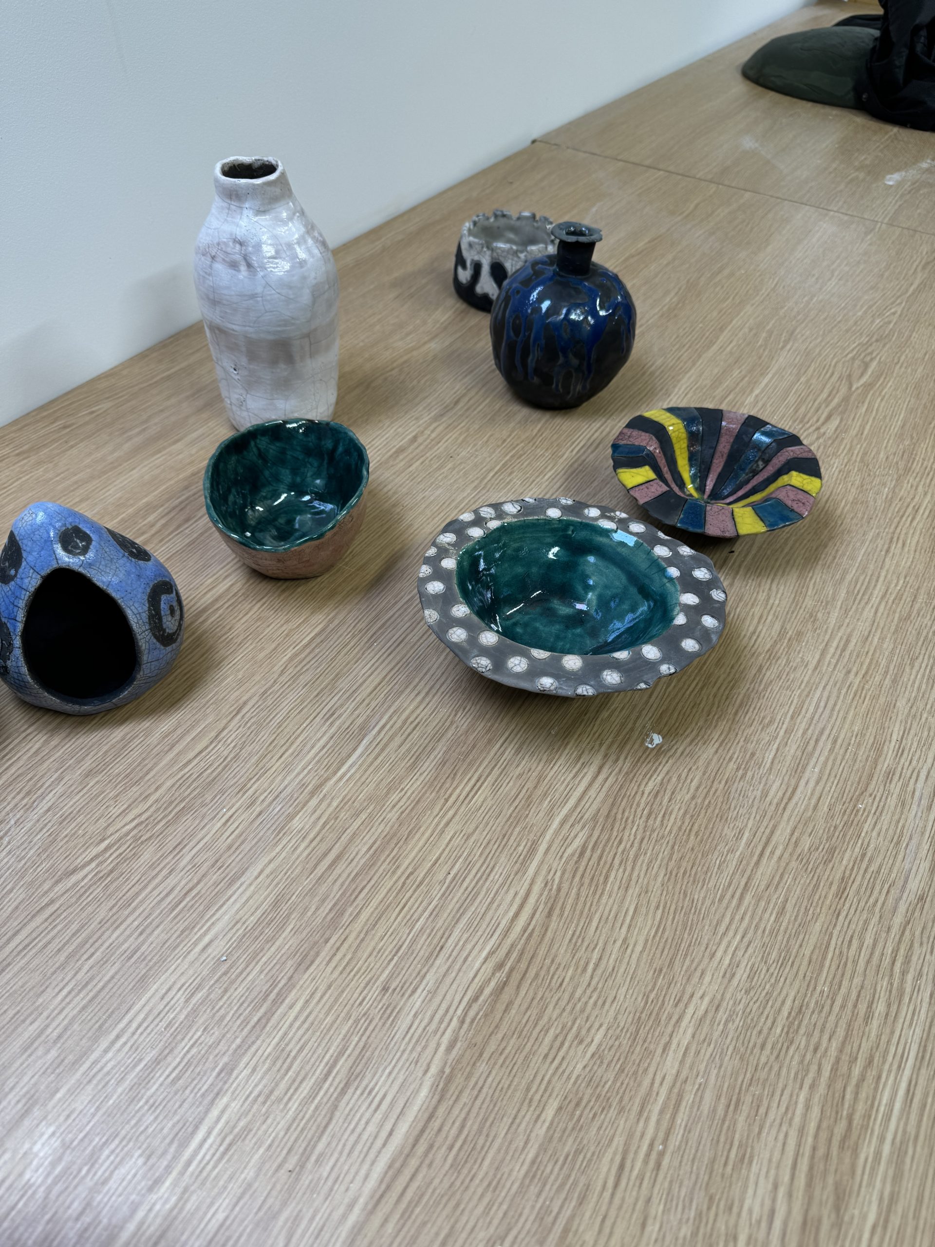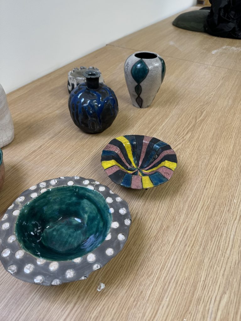We had two firings before lunch and 4 after as we had quite a few pots to fire and some of them on the slightly bigger side. Happy to say all the hand-built pots (and non-Raku clay pots 😊) survived the firing and reduction process. There were some interesting experiments with designs and glazes, and we had some wonderful outcomes….even Claire was happy with one of her pots !