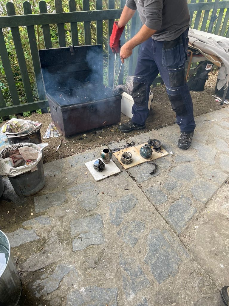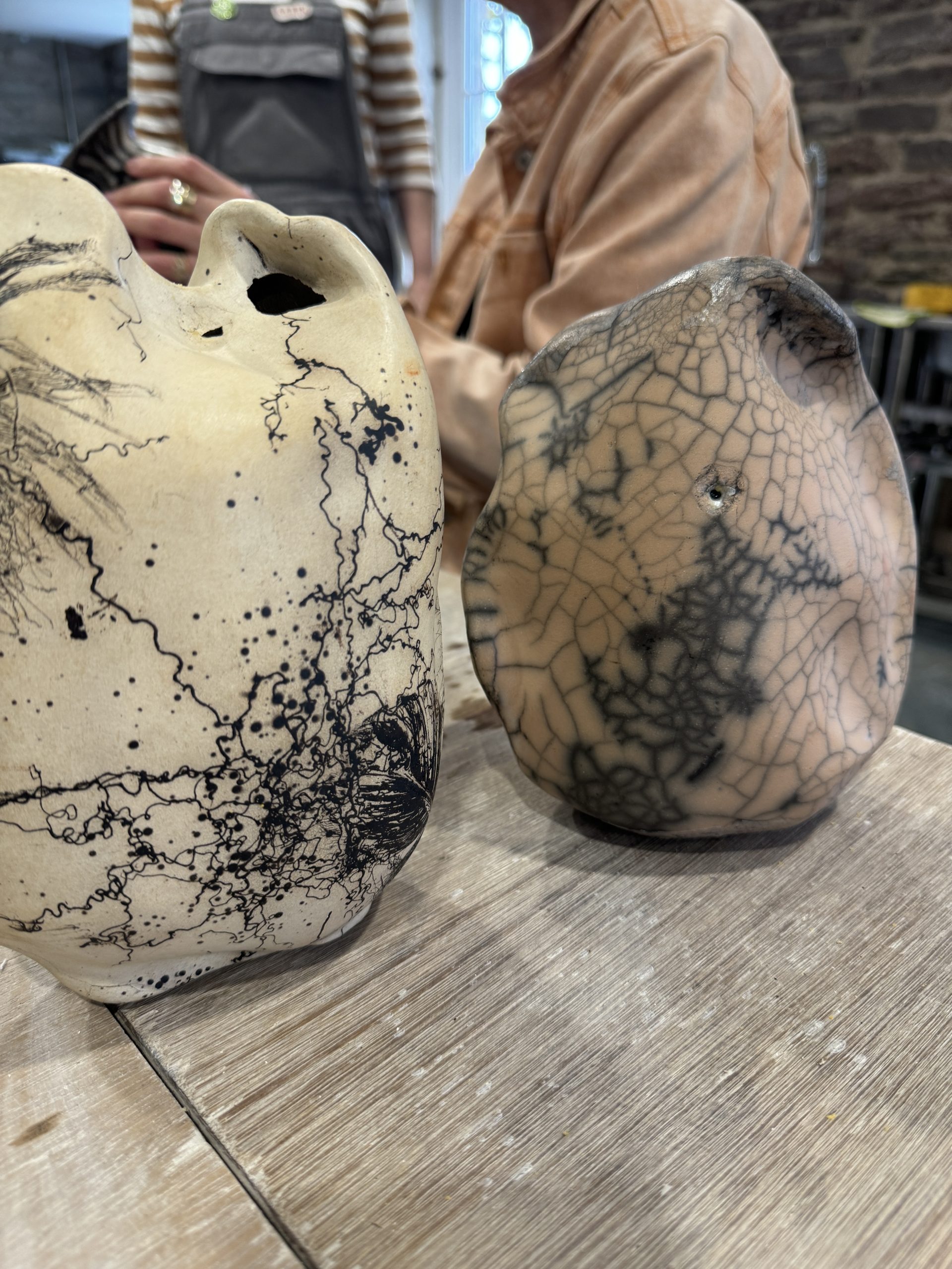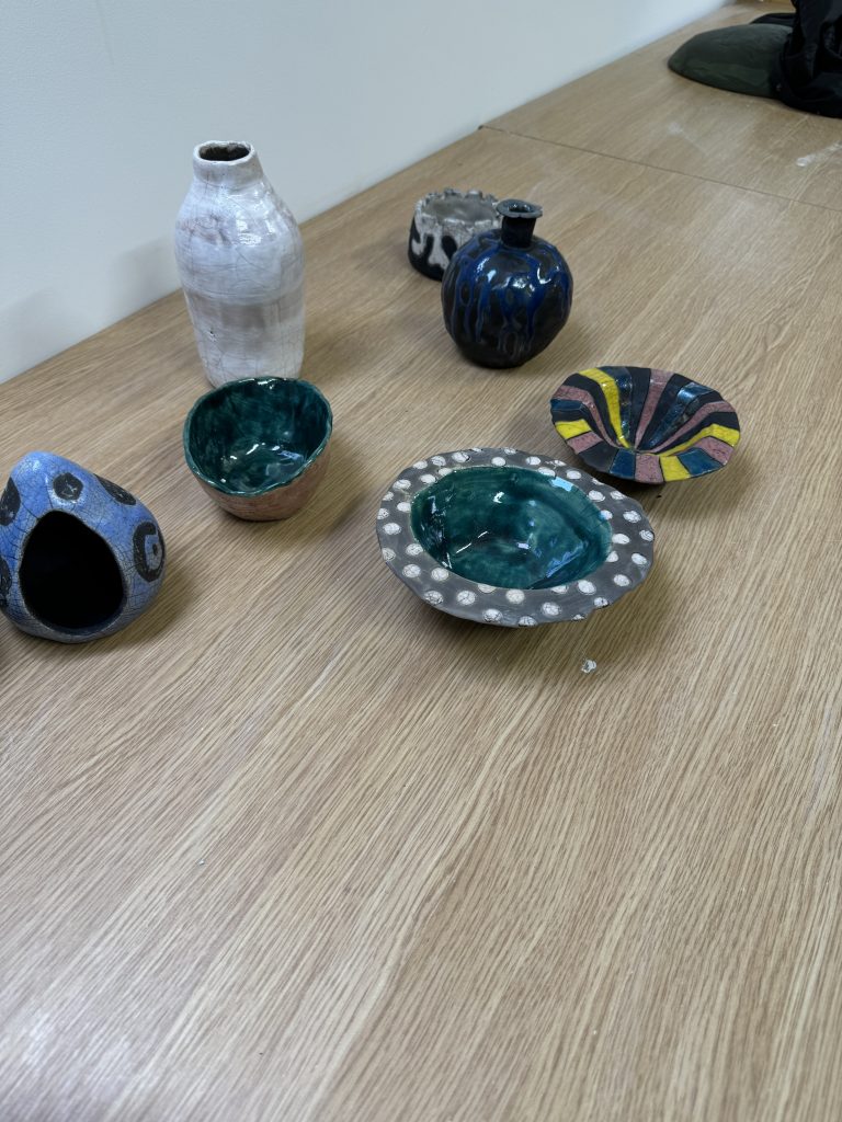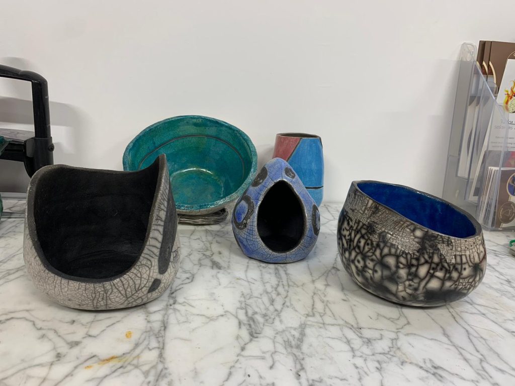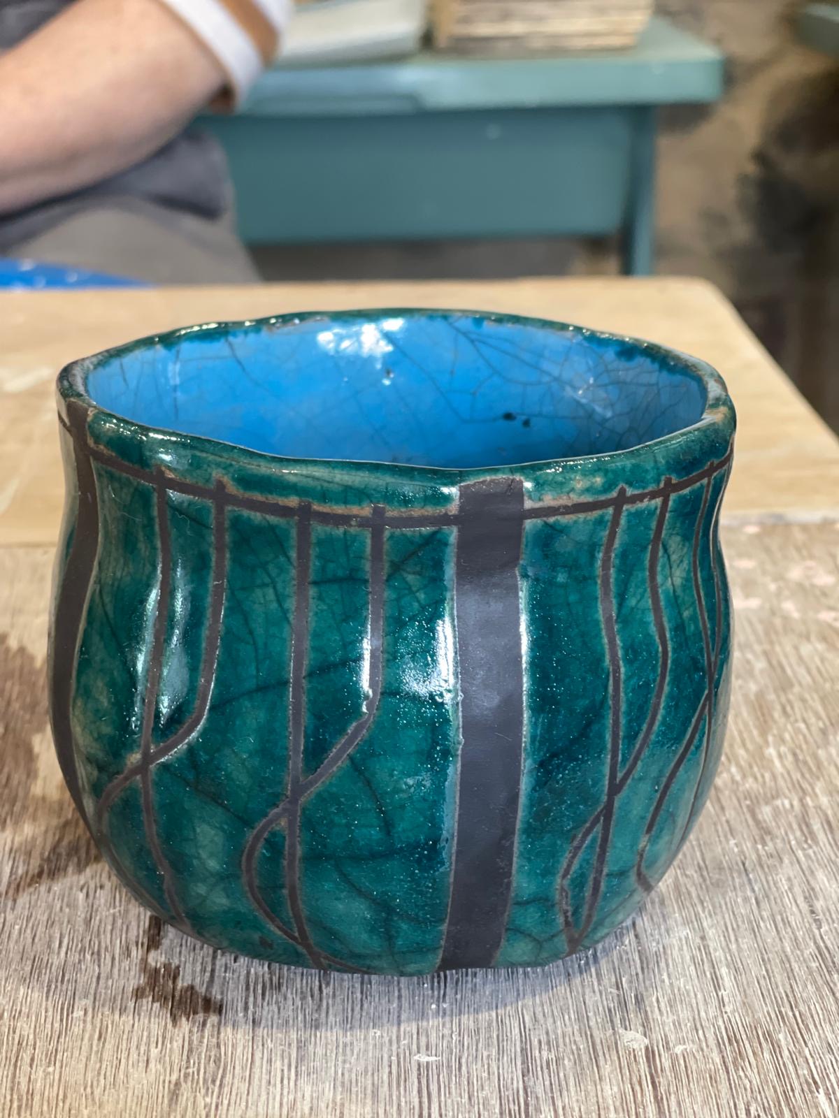 We had two firings before lunch and 4 after as we had quite a few pots to fire and some of them on the slightly bigger side. Happy to say all the hand-built pots (and non-Raku clay pots 😊) survived the firing and reduction process. There were some interesting experiments with designs and glazes, and we had some wonderful outcomes….even Claire was happy with one of her pots !