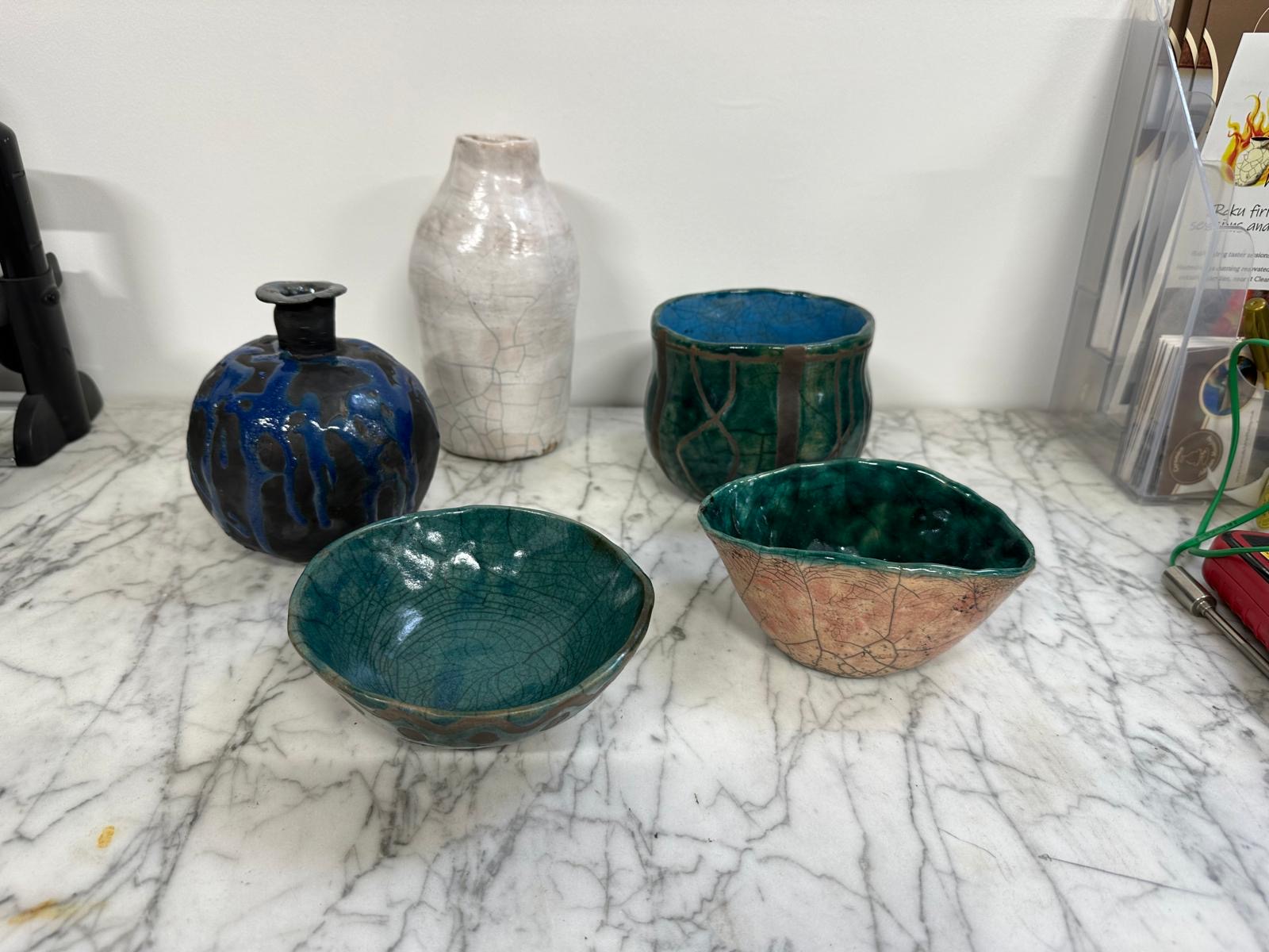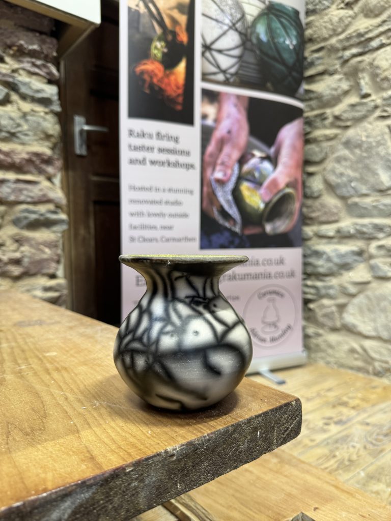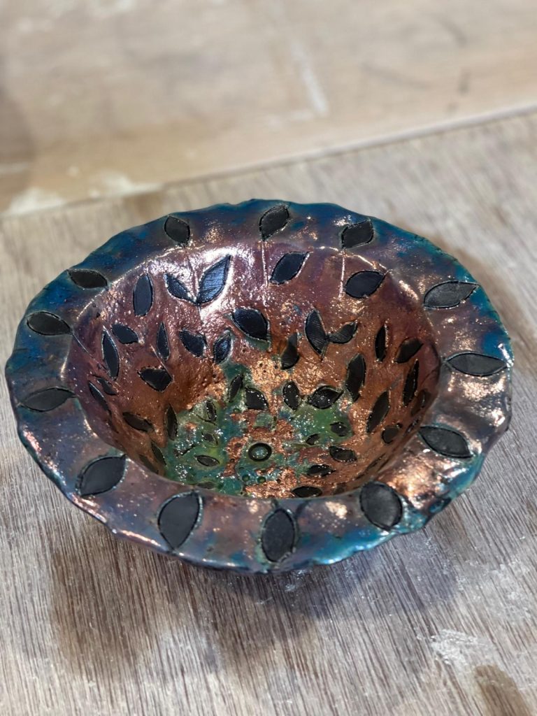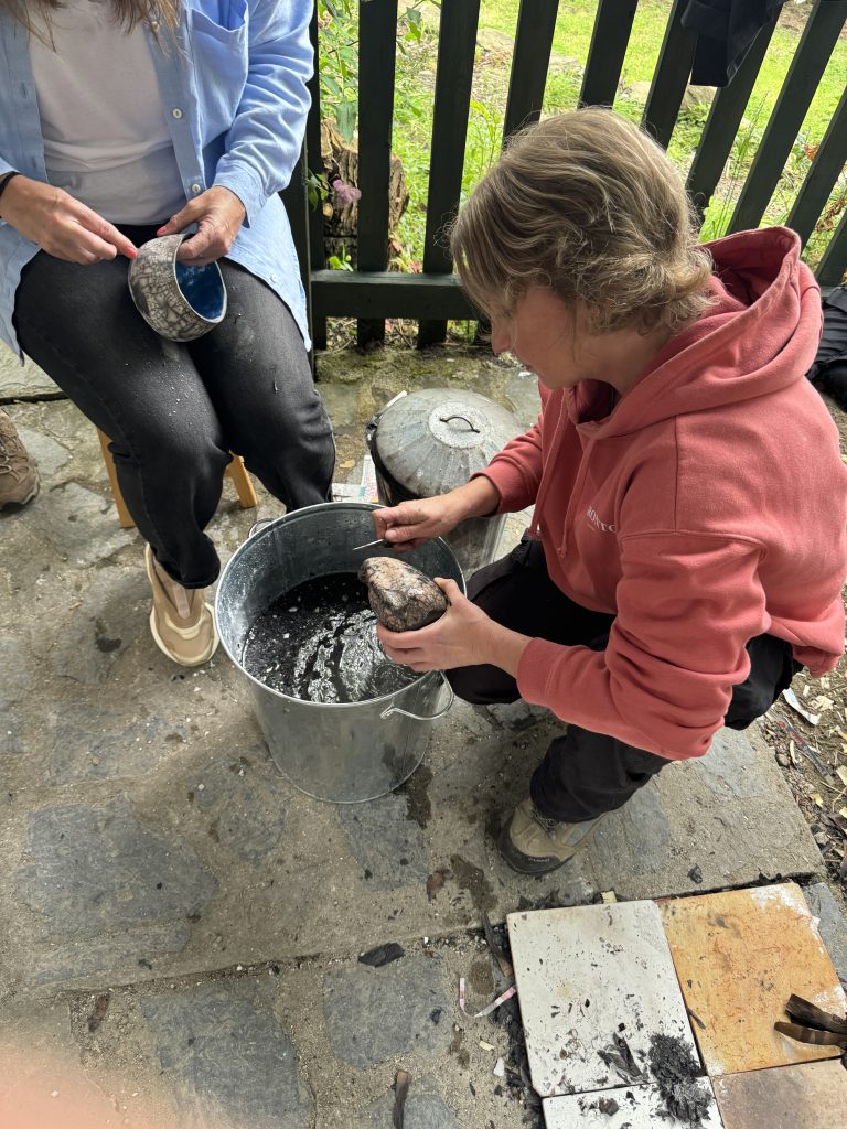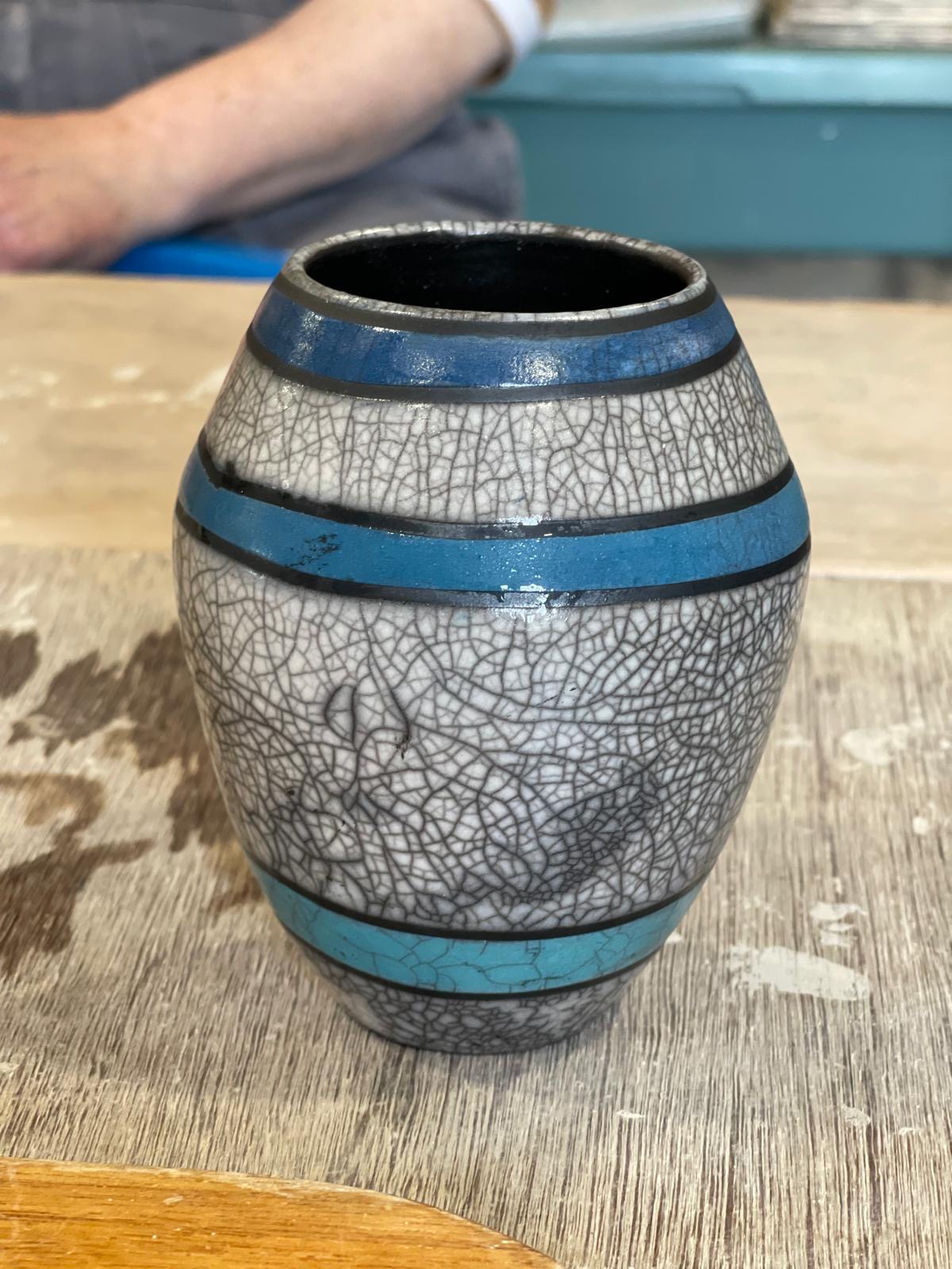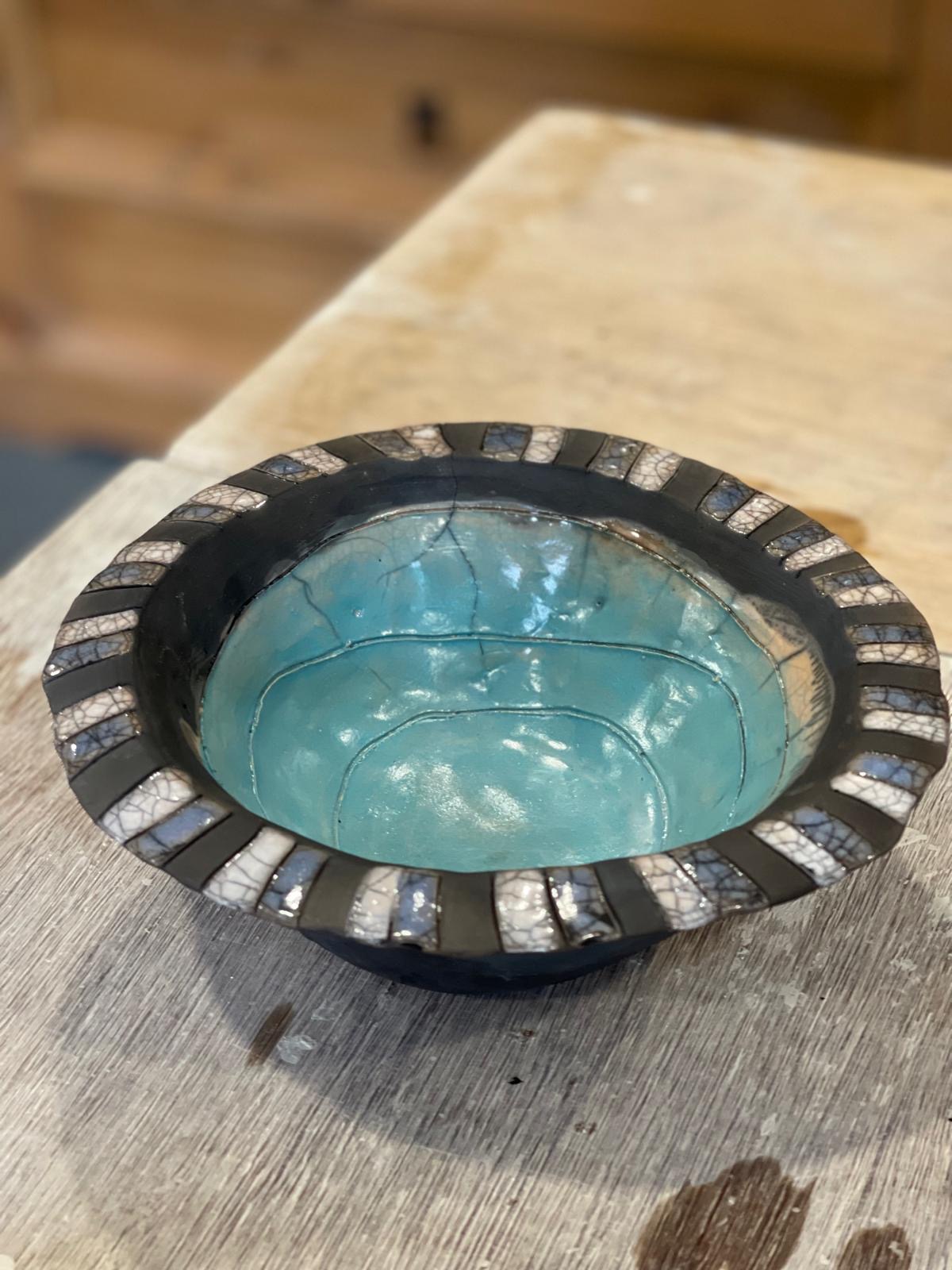 We had two firings before lunch and 4 after as we had quite a few pots to fire and some of them on the slightly bigger side. Happy to say all the hand-built pots (and non-Raku clay pots 😊) survived the firing and reduction process. There were some interesting experiments with designs and glazes, and we had some wonderful outcomes….even Claire was happy with one of her pots !