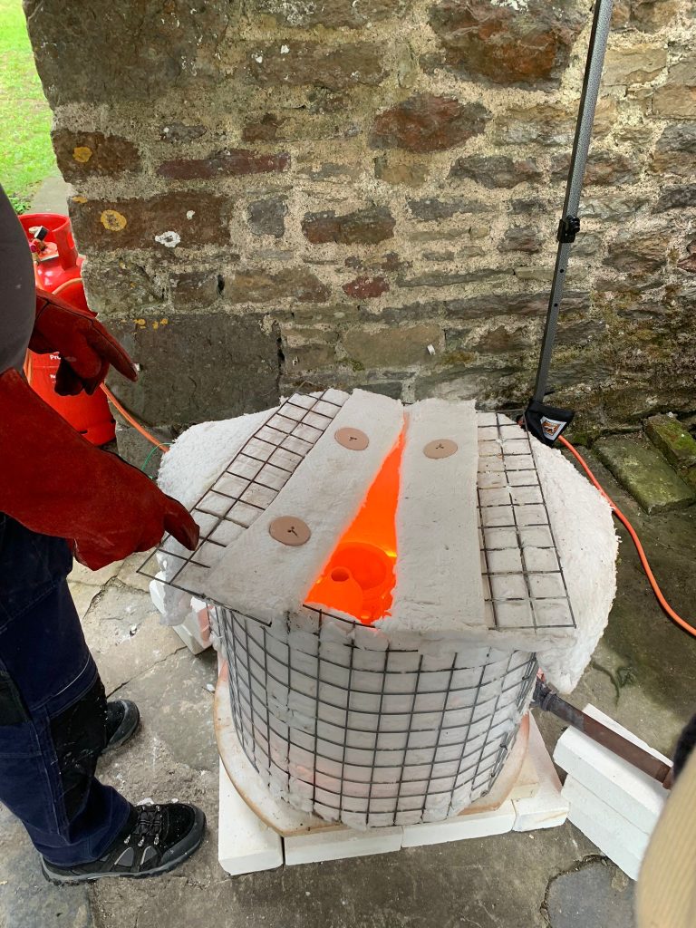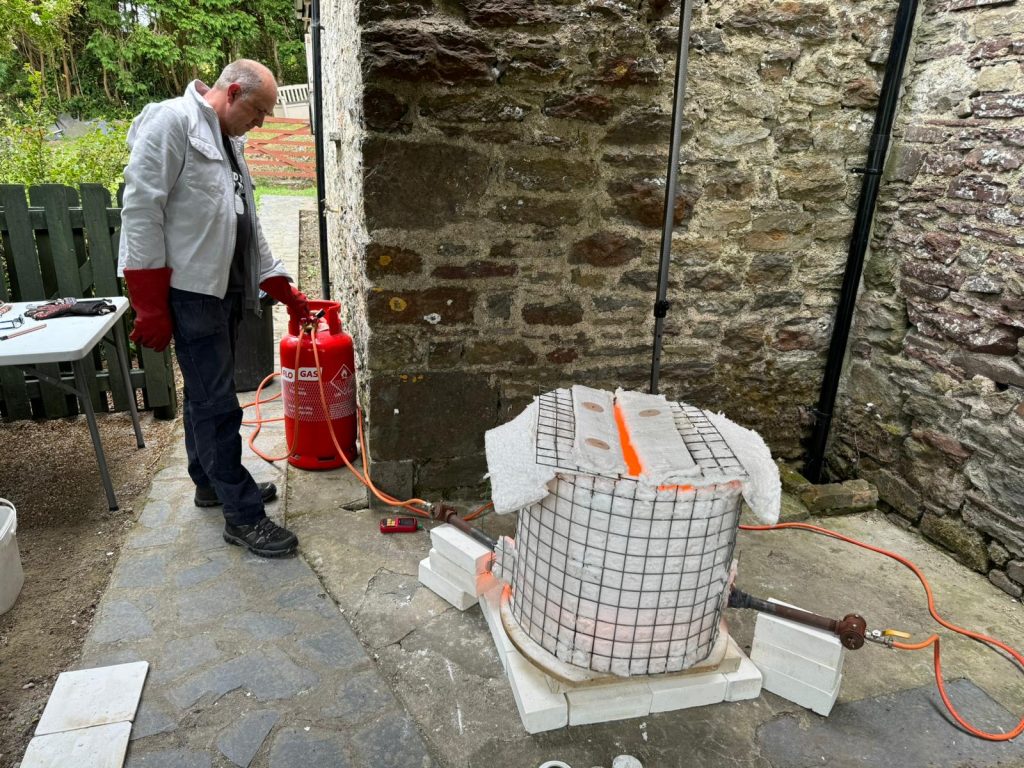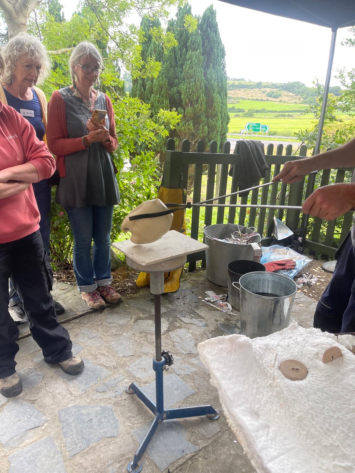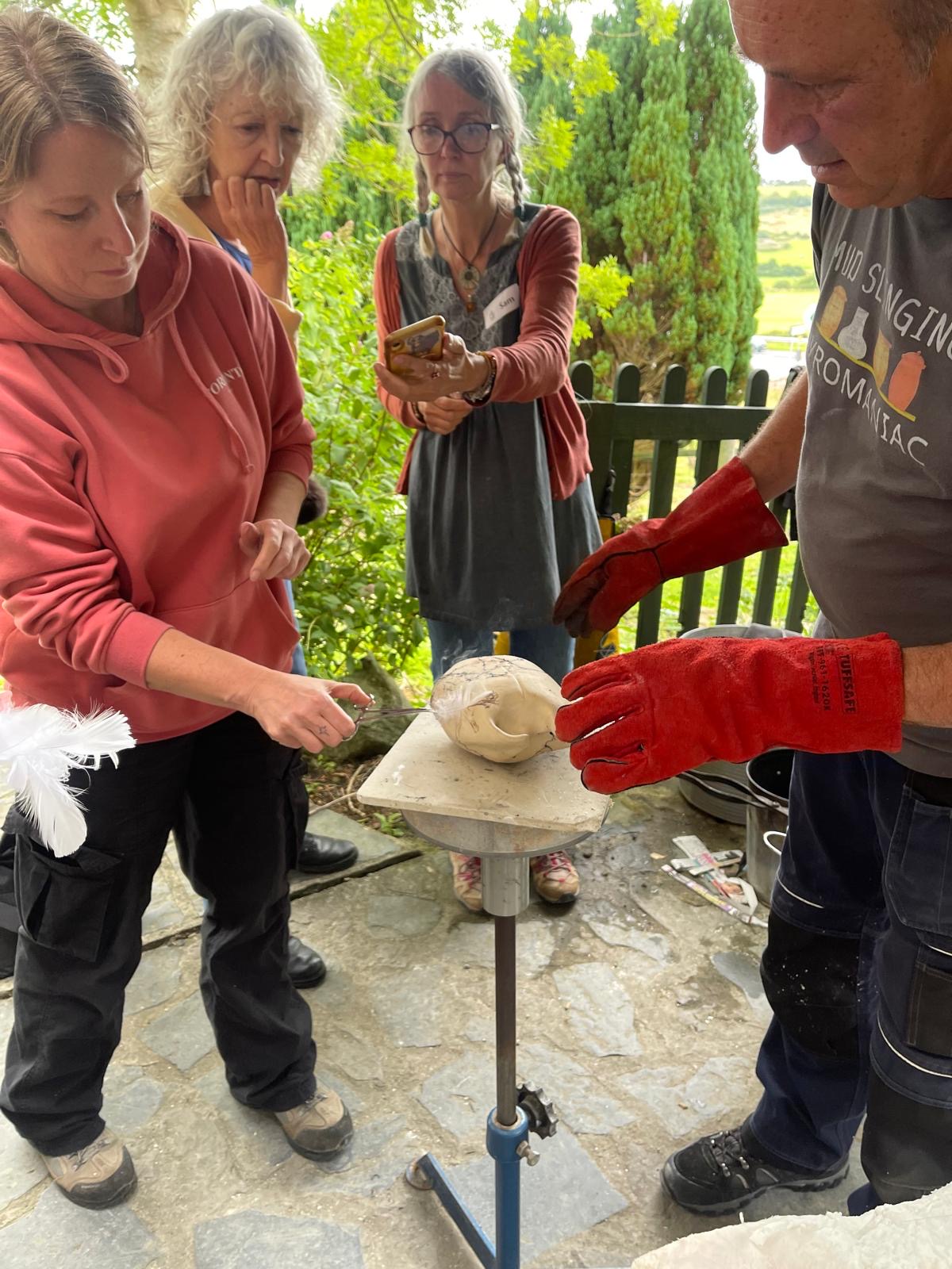 The other four students all arrived together after stopping at Starbucks, so Adrian got off his early morning tea round. After a safely briefing and discussion about the day ahead, all the students were encouraged to get involved in the firing process as much as they felt comfortable with. Adrian gave everyone a brief history of Raku, the Raku process and Karen showed some examples of how they might like to decorate their pots.