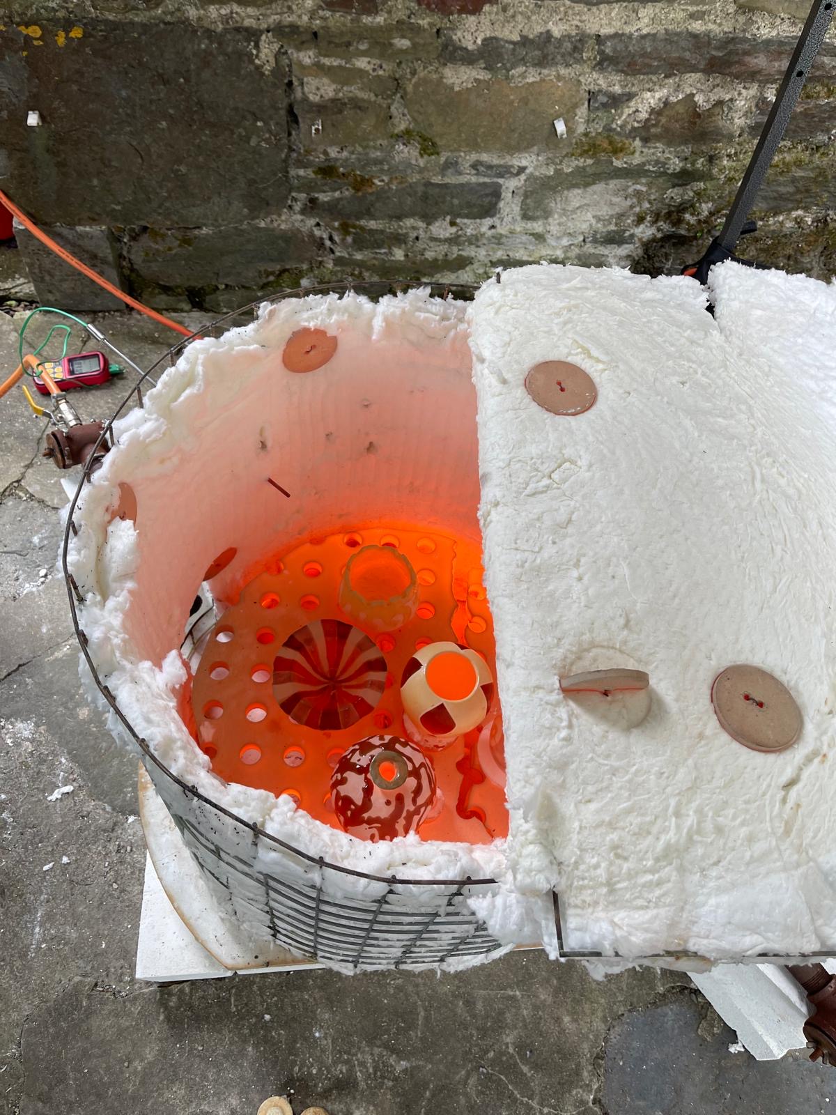 An early start for our Raku Workshop today with many if the students travelling a fair distance to get to us. As it was a workshop, students bring their own pots to fire having been given some general guidelines from Karen. We never know what to expect until they unpack their creations, and we work out the various options to decorate them. Our first student arrived with some pots she had made over 23 years ago and had smoked fired. We quickly popped these in the kiln whilst waiting for the others to arrive in order to burn off as much of the smoke as we could. They all survived the firing and consisted of some interesting hand built organic shapes.